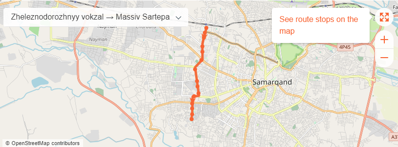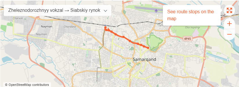 사마르칸트 트램1번 노선도(https://wikiroutes.info/en/samarkand?routes=10232) : 도심은 절대 가지 않고 정말 1자로 간다.