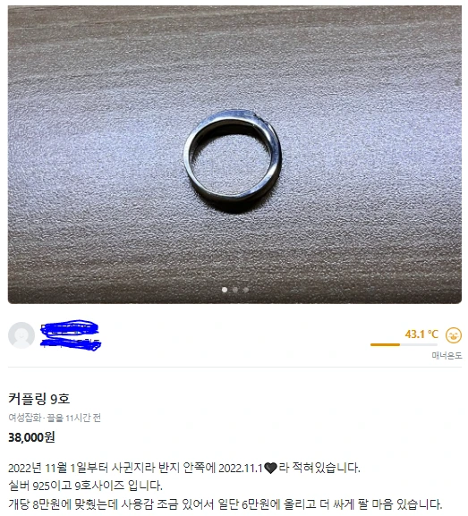 "여자 친구랑 깨져서 곰인형이랑 반지 내놓습니다. 곰인형 8만 3천 원짜리고, 커플링은 10만 원인데. 개인적인 사정으로 급하게 다 합쳐서 3만 원에 내놓습니다.(오늘 중 급매원함)"