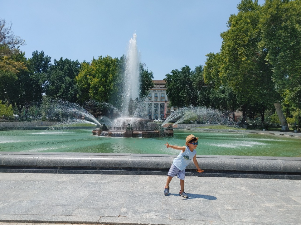 주원이는 그사이 알리셔 나보이 극장 앞 분수에 마음을 뺏겼다. 잠시 분수를 구경했을 뿐인데, 주원이의 볼은 불그스레해지고, 모자 안 머리는 땀으로 축축해졌다. 엄마도 괜찮은 척은 했지만 36도 땡볕에서 서있으니 점점 녹초가 되셨다. 그런데 제일 힘든 건 살찐 아이비에커였다. 이제 아이비에커는 15년 전 청년 아이비에커가 아니었다. 배가 나온 전형적인 중앙아시아 아저씨가 된 그는 조금만 더워도 정신을 못 차려했다. 본수에서 논 지 5분도 채 되지 않았는데, 주원이가 분수에서 벗어나지 않자, 아이비에커가 "이제 다 놀았으면 차 타러 갈까?"하고 재촉했다. 결국, 알리셔 나보이 극장 관광도 10분 안에 끝났다.