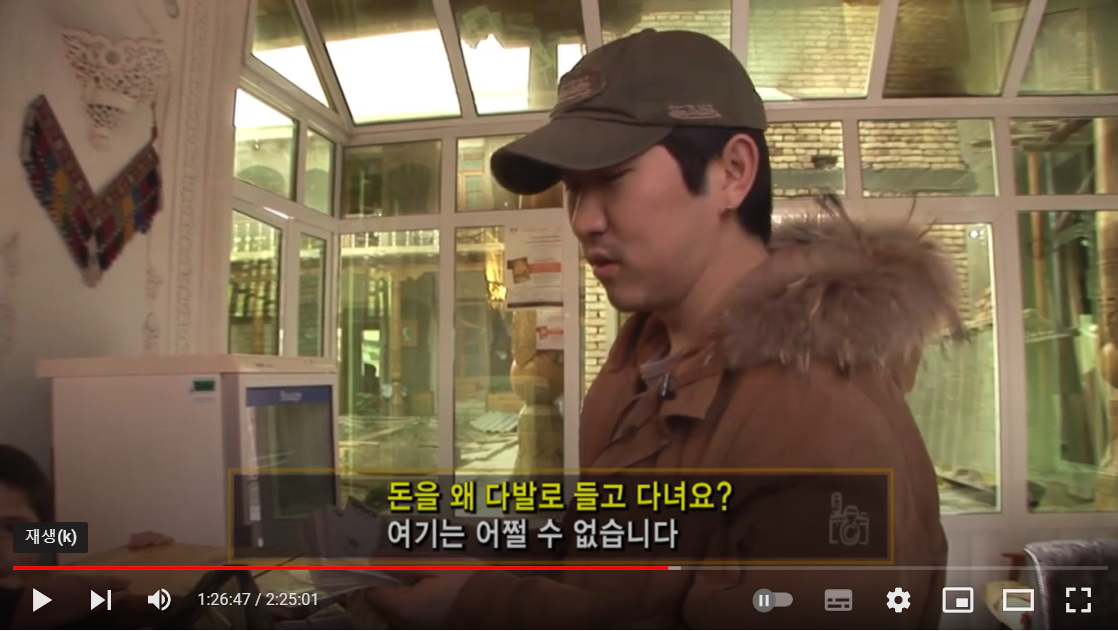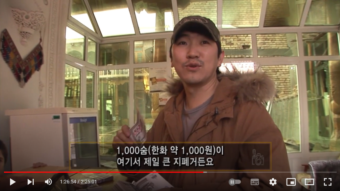 10분 주차했을 뿐인데, 차를 빼려니 주차요금을 받았다. 아이비에커는 조수석 주머니를 열더니 노란 고무줄로 묶은 지폐 뭉치를 꺼내 주차관리요원에게 주었다. 우즈베키스탄에서는 화폐 뭉치를 들고 다닌다고 하던데, 정말이었다. 중앙아시아 오기 전 세계테마기행 우즈베키스탄을 본 적이 있었는데, 2008년 찍은 그 편에서 고려인 박루슬란 감독이 호텔비를 지불하려고 검은 봉지에 지폐 뭉치를 가지고 다니다 내는 장면이 있었다. 세계테마기행을 찍을 2008년 당시 우즈베키스탄의 가장 큰 화폐단위가 1000 숨, 당시 우리나라 돈으로 천 원이었기 때문에, 한국돈으로 숙박료 4만 5천 원 정도를 내려면 지폐를 45장을 냈어야 하는 것이다. 그나마 지금은 여러 차례의 화폐 개혁으로 고액권이 생긴 모양인데, 아이비에커의 고무줄 화폐 뭉텅이를 보니 아직까지도 우즈베크 화폐는 문제가 좀 있어 보였다.