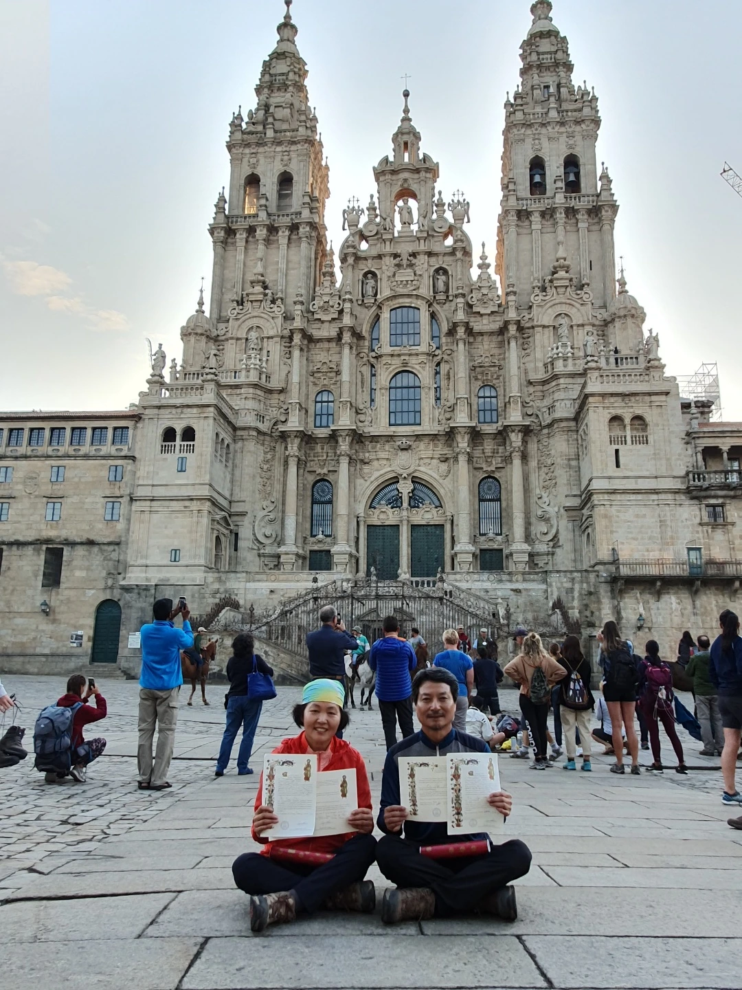 서둘러 순례자 사무실로 가보니 벌써 몇 명이 줄을 서 있다. 우리는 여섯 번째로 열 명 안에 들어 원하던 선물을 받게 되었다. 새벽부터 고생한 보람이 있다. 7시가 넘으니 사람들이 밀물처럼 몰려든다. 하루 순례자를 1,500명으로 마감한다고 한다. 순례 확인서와 완주증서를 받고 대성당 광장에서 기념사진을 찍으며 기쁨을 만끽하였다.