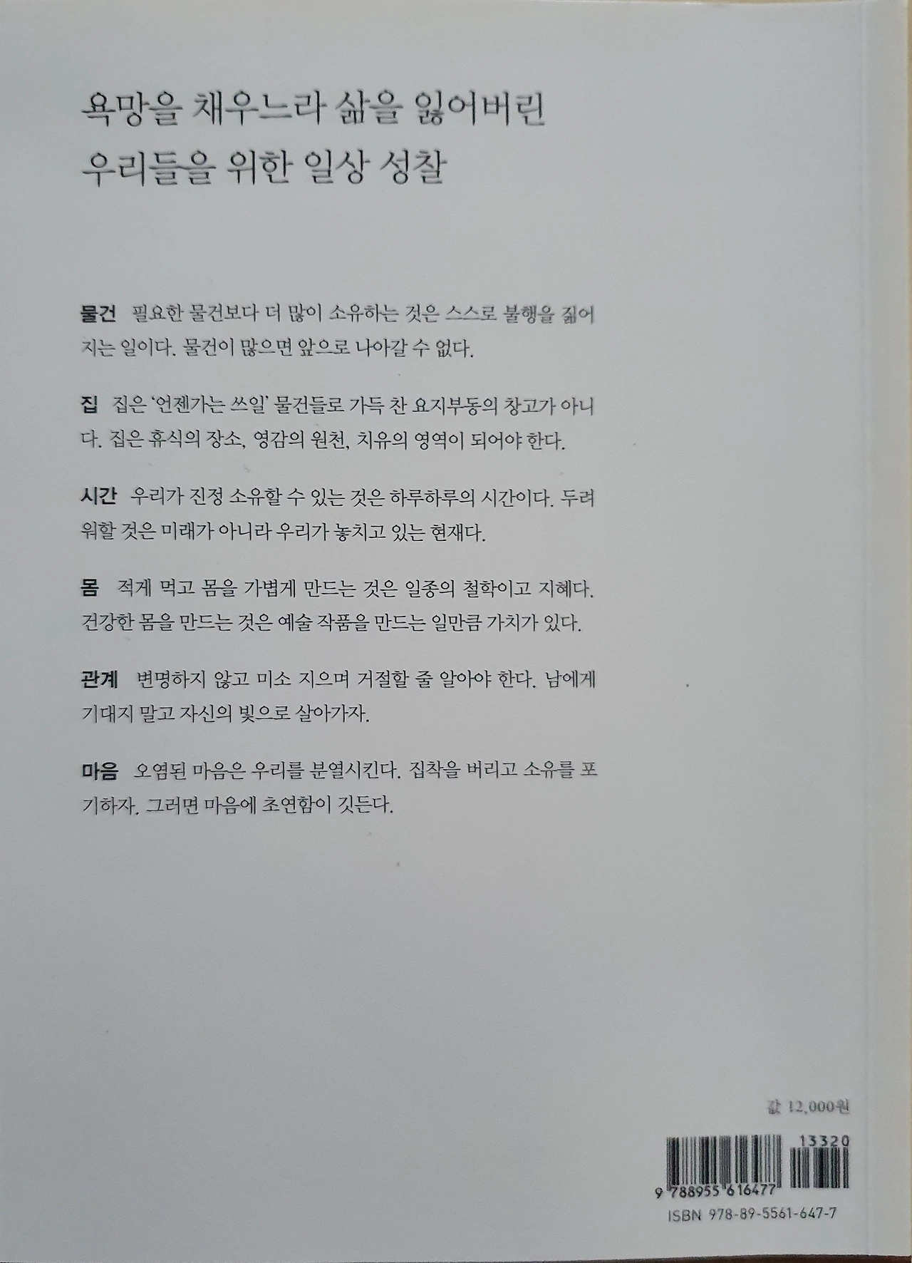 우리 문화는 심플한 삶을 선택한 이들을 잘 받아들이지 못한다. 소비사회에는 그런 사람들이 해가 되기 때문이다. 따라서 심플하게 사는 사람들을 주변인 내지는 불안한 개체로 취급한다. 스스로 소박한 삶을 선택해 적게 먹고, 적게 소비하고, 적게 험담하거나 아예 험담하지 않는 사람들을 이 사회는 구두쇠, 위선자, 비사교적 인물로 규정한다. 우리는 공간을 채우느라 공간을 잃는다. 거실을 인테리어 잡지에서 본 대로 꾸미느라 에너지를 잃고 물건을 정리하고 채우느라 시간을 잃는다.