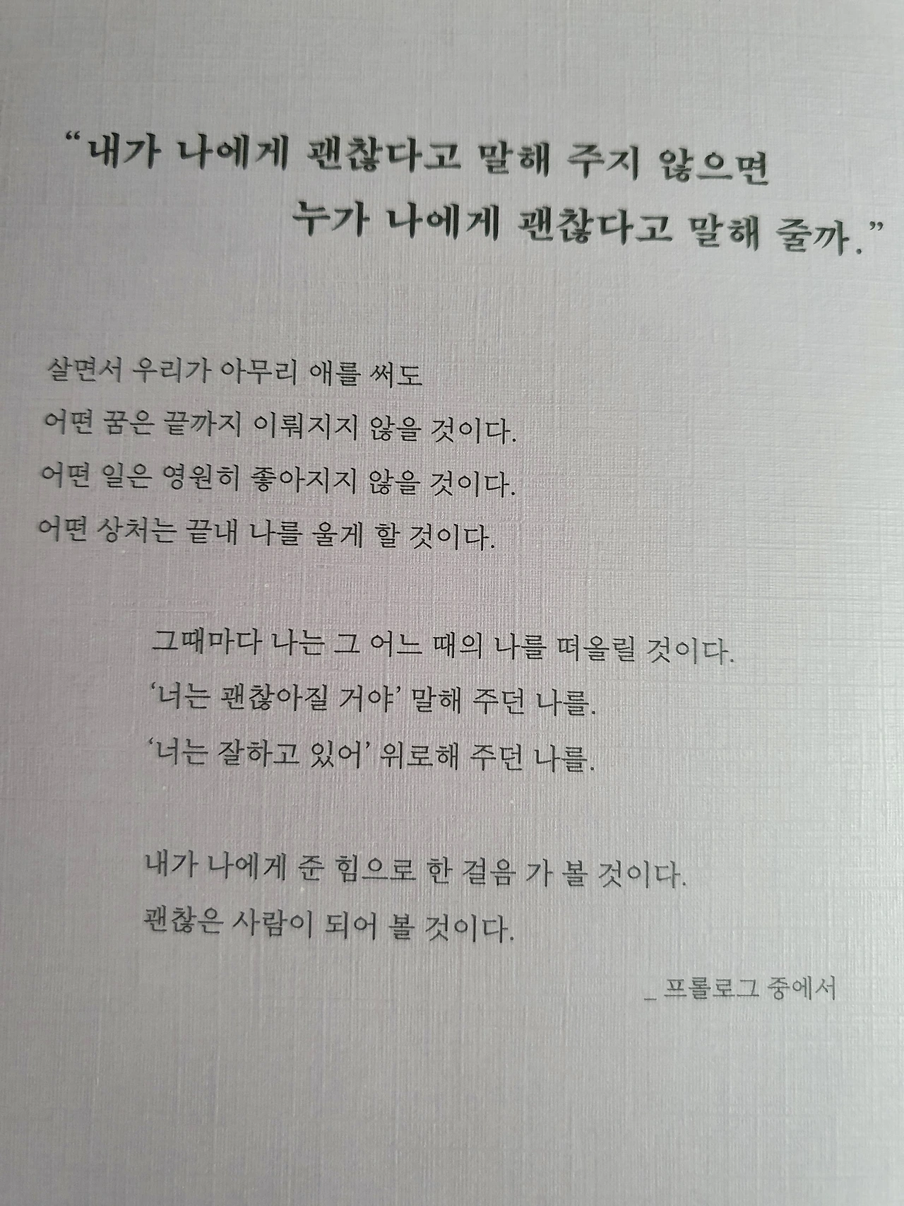 몸의 차이만큼 마음의 차이란 게 있다. 마음의 근육이 단단한 사람이 있고 그렇지 않은 사람이 있다. 인생의 어느 길 위에서 넘어졌을 때 쉽게 툭툭 털고 일어나는 사람이 있고 주저앉아 서럽게 우는 사람이 있다. 뭐든지 다시 시작할 수 있는 사람이 있고 그게 안 되는 사람이 있다. 우울하면 커튼을 치는 나에게, 오래오래 잠자는 나에게 사람들은 말한다. "노력을 해, 웃어야 웃을 일이 생겨. 자꾸 밖으로 나가고 자꾸 사람들을 많이 만나 봐. 너는 왜 그렇게 못하니?" 당신은 아무것도 모른다. 당신은 내가 아니고 나는 당신이 아니다. 우리는 다르다. 낮과 밤만큼이나. 여름과 겨울만큼이나.