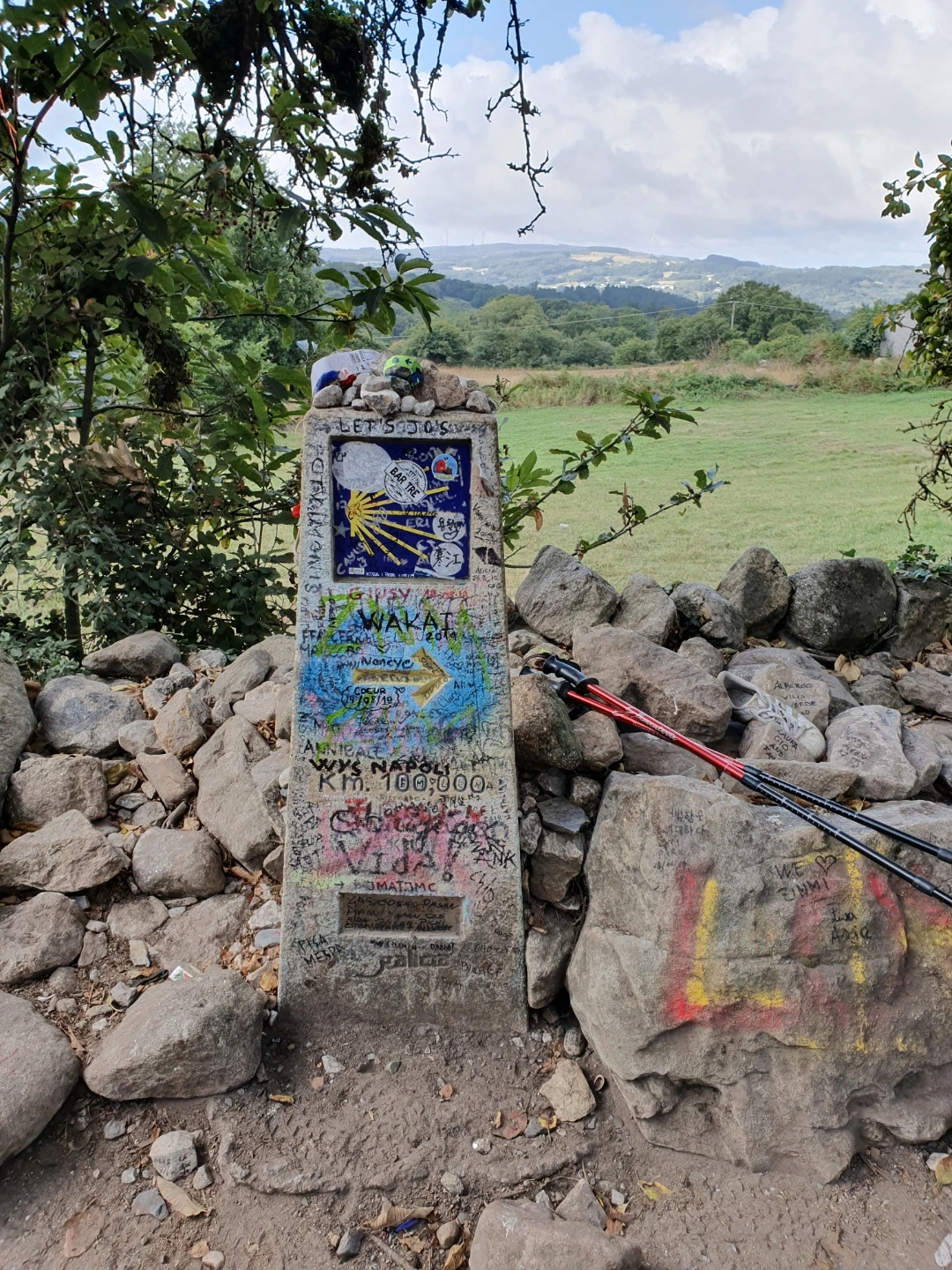 다시 일본인 남자를 만났다. 나이는 나랑 동갑이었는데, 무표정에다가 다른 사람들과 어울리지 않는 것 같다. 항상 혼자 걷는 모습이 안쓰럽기도 하면서 몇 번을 마주치다 보니 관심이 갔다. 드디어 산티아고 도착 전 100km 지점에 왔다.앞서간 사람들이 자신의 필체를 남기려고 낙서를 한 흔적이 많다. 역시 100km 지점에 관심이 큰 것 같다. 일본인을 사진 찍어주고 우리도 사진을 찍어 달라고 했다. 나이는 나랑 동갑이고 이름은 요꼬 모상이다.