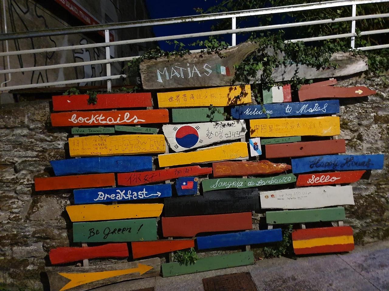 사리아라고 입체적으로 크게 흰 글씨 쓰여 있는 곳에서 사진 찍었다. 아직 어둠이 가시지 않아 사진이 잘 나올지 장담하기는 어렵다. 가다 보니 여러 나라 국기로 만든 장식이 있어 사진 찍었는데 우리나라 국기도 있어 반가웠다. 이것은 사리아를 가장 특징적이게 보여주는 팻말이기도 하다.