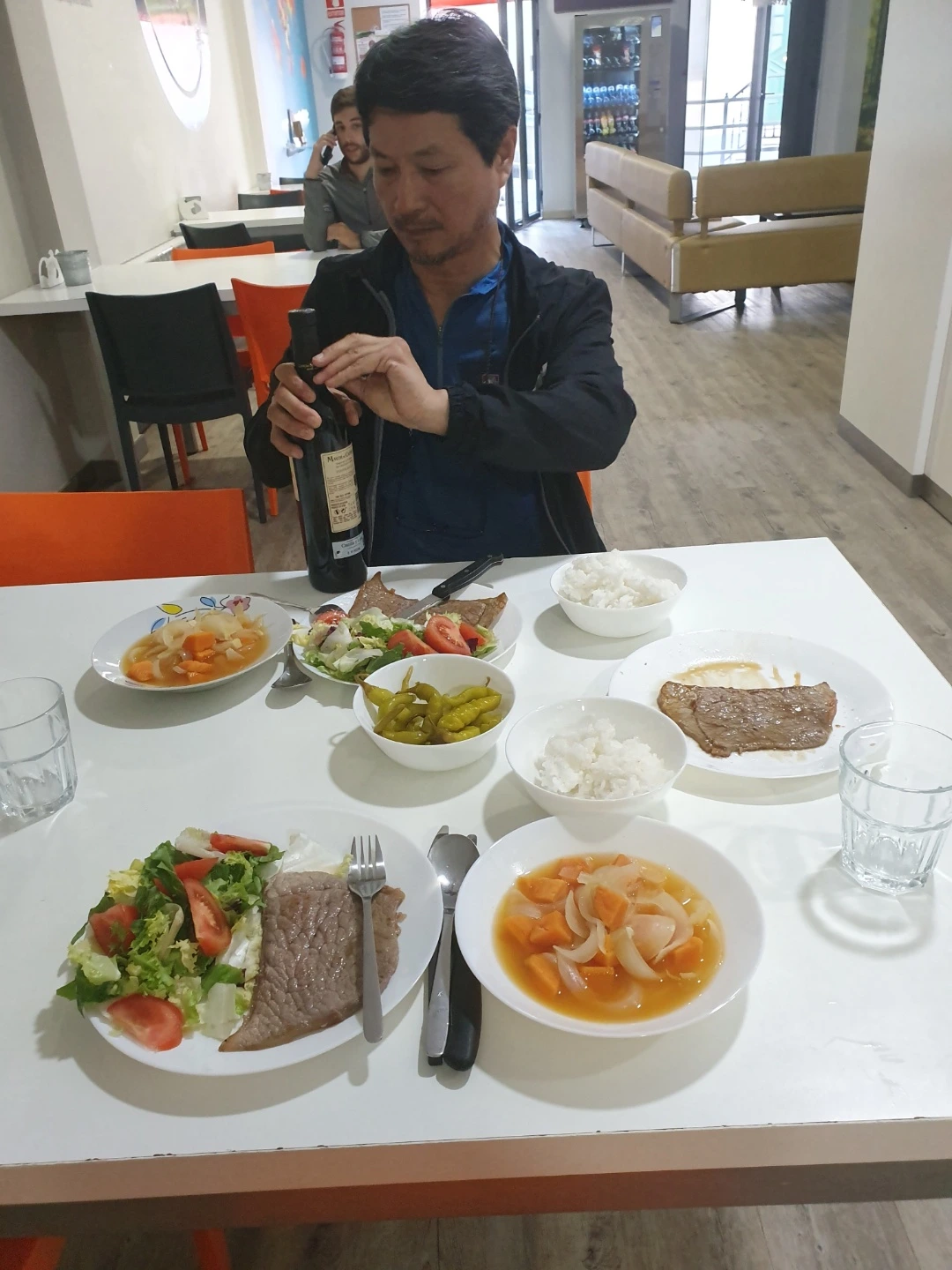 에스떼야에서 만났던 수원 남자분이 이곳 알베르게에 잠깐 놀러 오셨다. 식사 중이라 스테이크와 와인을 조금 드렸더니 맛있다고 좋아하신다. 뭐든 함께 먹으면 더 맛있는 듯하다. 한참 이런저런 이야기를 나누다 헤어졌다.