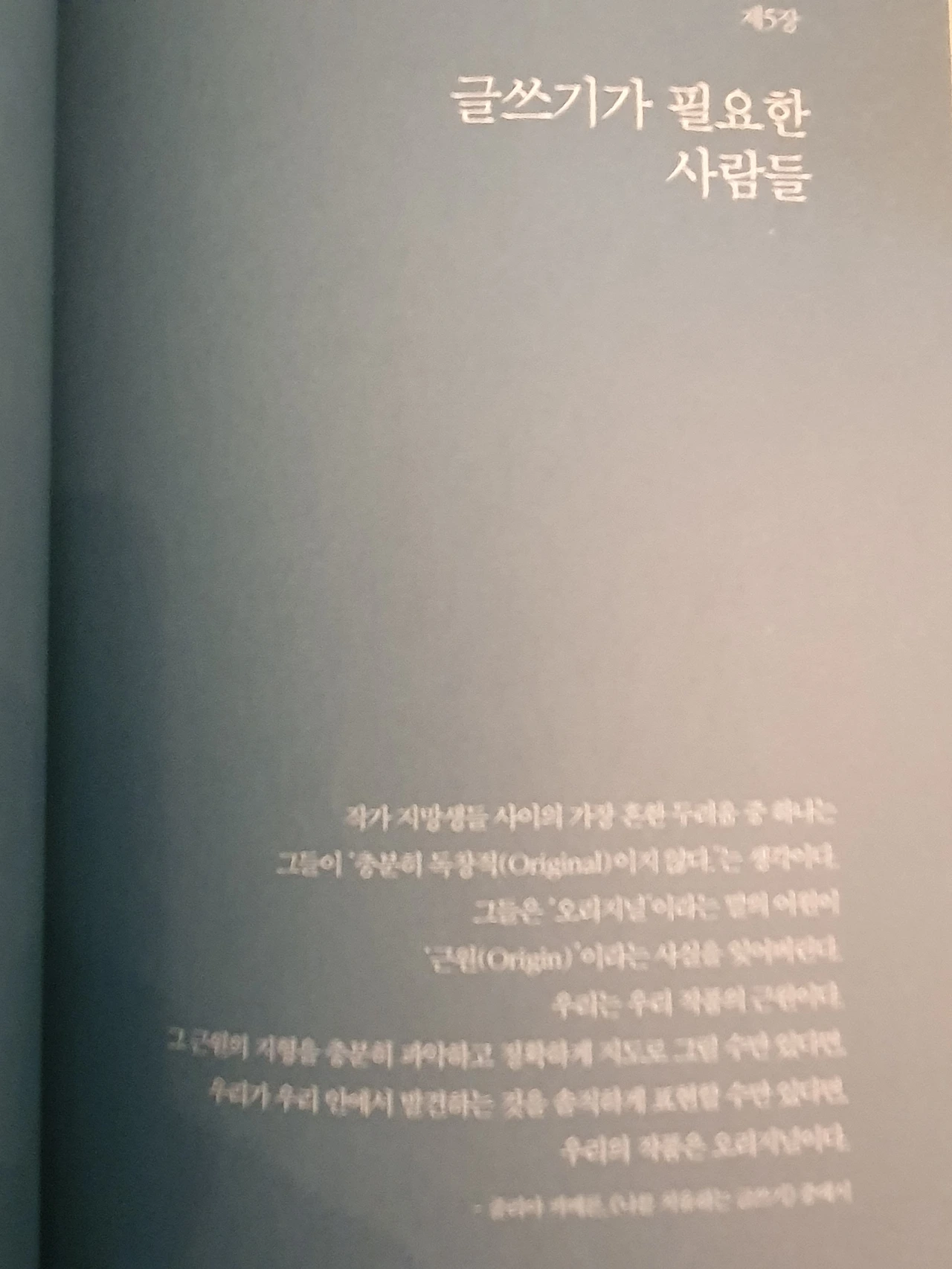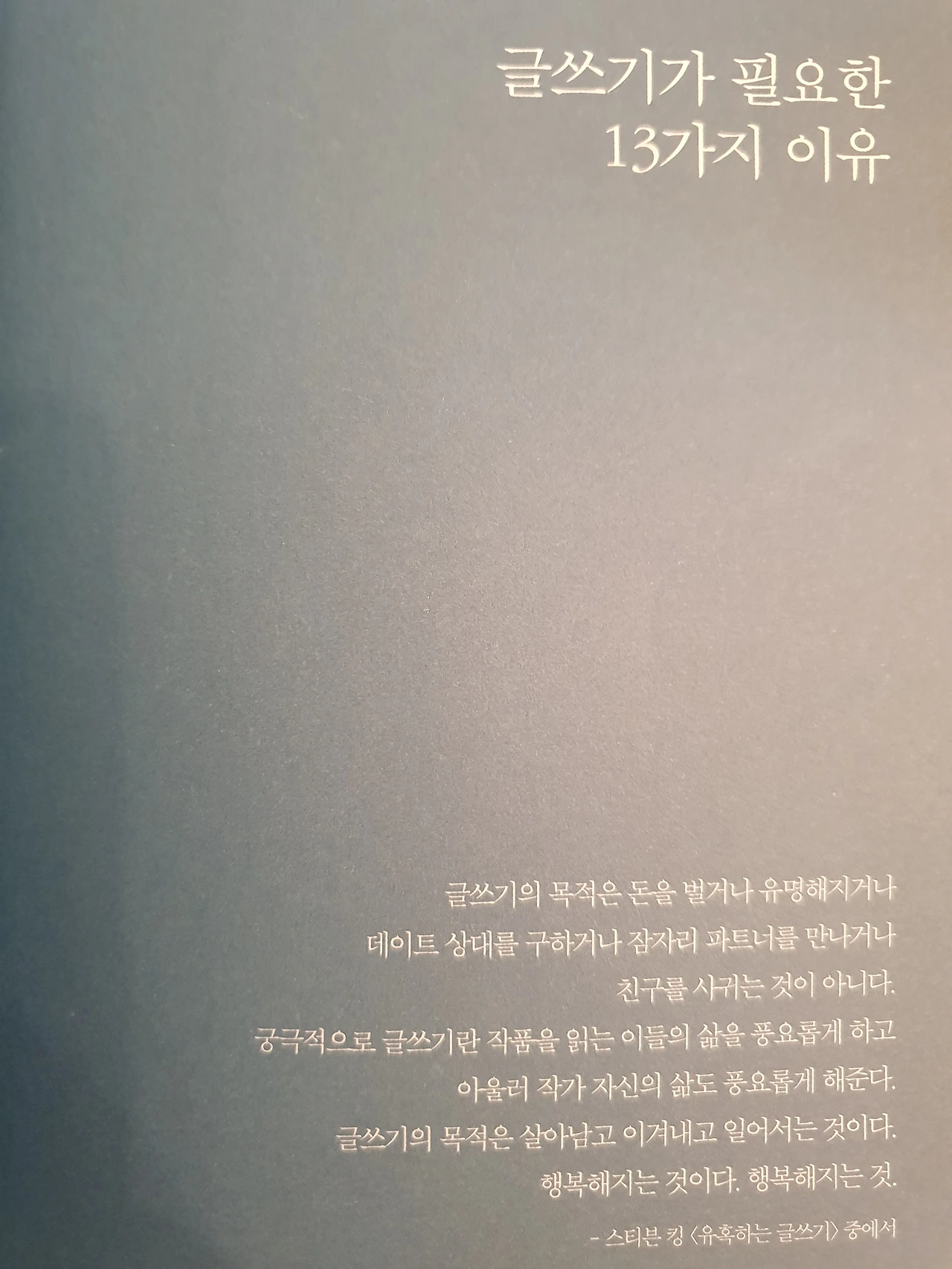 하루아침에 글을 잘 쓰는 방법은 없다. 개중에는 타고난 글재주를 가진 이들도 있겠지만, 글을 잘 쓰는 방법은 오직 한 가지뿐이다. 그냥 쓰는 것이다. 많이 쓰는 것이다. 매일 쓰는 갓이다. 오직 쓰는 것만이 글 쓰는 기술을 향상할 수 있다. 매일매일 여백을 채워야만 하는 상황에 맞닥뜨리게 되면 어쩔 수 없이 마음속의 진실을 털어낼 수밖에 없다. 가슴을 외면한 채 글을 쓰는 것은 불가능하다. 하루 이틀은 가능할지 모르지만, 일주일 열흘은 불가능하다. 그렇기 때문에 매일 글쓰기가 중요한 것이다. 문장 하나로 사람의 마음을 사로잡고, 사소한 일상으로 감동 치는 그런 글을 쓰고 싶은 욕심은 누구에게나 있다. 오직 쓰는 것, 진정성을 가지고 계속 쓰는 것만이 글을 잘 쓸 수 있는 방법이다. 쓰고 싶어서, 쓸 수밖에 없어서, 그리고 지금 쓰고 있어서 써야 한다.