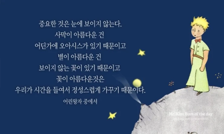 사실 <어린 왕자>는 모르는 사람이 없을 것이다. 세계적으로 잘 알려진 필독서이자 명작이다. 학생부터 어른까지 누구나 좋아하는 도서이다. 그것은 영롱하게 빛나는 명문장으로 가슴을 따뜻하게 하기 때문이다. 그리고 동화 형식으로 쉽고 재미있게 읽힐 뿐만 아니라, 빛과 사랑을 느끼며 희망을 주기 때문이다. 명작은 괜히 명작이 아니다. 책 한 권이 많은 이들의 가슴에 희망과 빛으로 꺼지지 않는 등불이 되기 때문일 것이다. 우리에게 전했던 어린 왕자 책의 내용은 상상을 초월한다. 누구에게나 우주의 영롱한 별들을 가슴에 담고 살아갈 수 있도록 해 주는 책이다. 수많은 독자가 읽고 감명을 받은 어린 왕자의 이야기를 다시 읽고 싶어 졌다. 그의 주옥같은 명문장을 읽으며 오랜만에 어린 왕자를 만나고 별 같은 세상을 만나보고 싶었기때문이다.