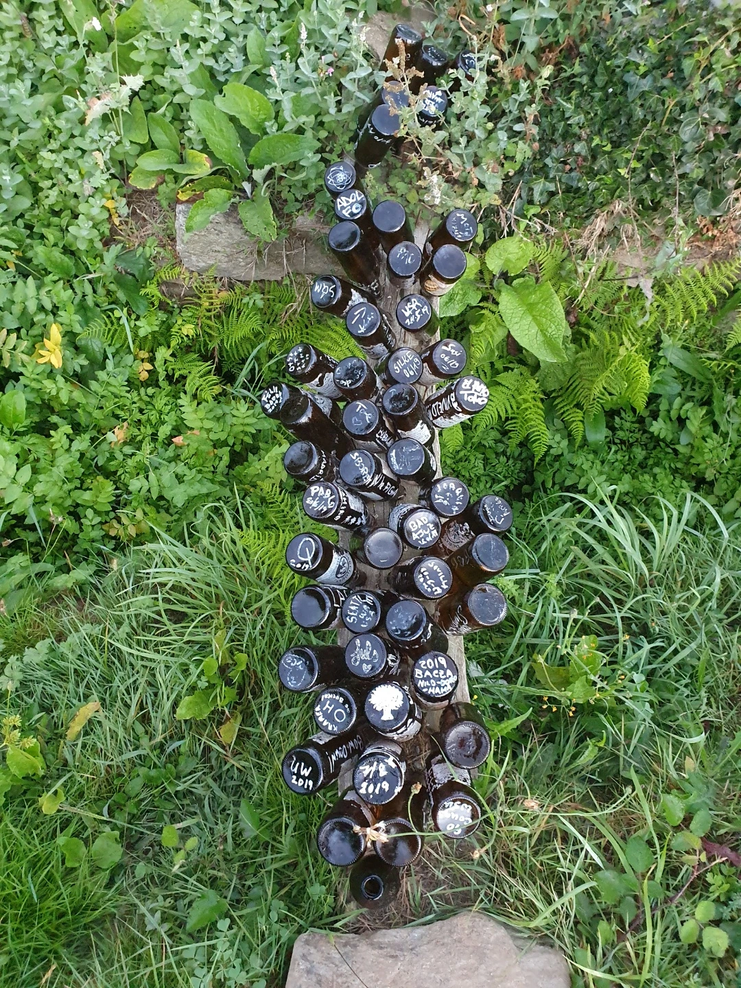 어느 정도 걸어오자 술병으로 장식을 다양하게 한 바가 있었다; 병으로 장식된 모습들이 눈호강을 시켜 주었다. 그래서 휴대폰을 켜고 동영상을 찍었다. 오픈했다면 들어가서 맥주라도 시원하게 마셨을 텐데 아쉽게 문을 열지 않았다. 신발을 화분처럼 활용한 모습도 특이하니 예뻤다. 힘든 순례자들에게 좋은 볼거리를 제공하여 마음을 따뜻하게 해 준 bar주인에게 고맙다. 그곳에서 사진을 몇 장 찍고나니, 마음이 정화된 기분 좋은 시간이었다.