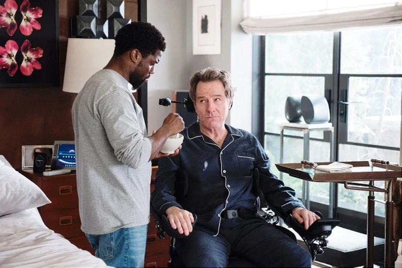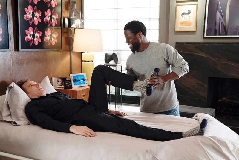 델은 학교에 아들을 데리러 가기 때문에 기다리는 거에 항변하다가 서명을 부탁한다. 그리고 취업시켜 줄 것을 요청한다. 필립은 자신을 수평적으로 대하는 델의 모습에 흥미를 느껴 다시 와서 취업을 하던지 서명을 받으라고 했다. 델이 집에 가자 아내와 아들 앤서니는 별로 반기지 않는다. 아내는 델이 가정을 돌보지 않는데 화가 나 매몰차게 문을 닫아 버렸다. 이튿날 델이 주급을 받으며 입주자로 필립을 돌보기로 한다. 첫날부터 델이 불성실 하자 비서 이본은 앞으로 삼진 아웃할 것을 경고한다. 필립을 침대에서 휠체어로 옮기고 식사를 떠 먹여 주지만 델은 서툴고 실수 투성이다. 이때 '네순 도르마(아무도 잠들지 말라)' 음악이 흐른다. 누구를 돌본 적 있느냐는 필립 질문에 자신만 돌봤다고 델은 대답한다. 물리치료사가 들어와 도뇨관 교체를 하는데 델이 주체를 못 해 난리다. 대소변 제거 일은 안 한다고 해서 다시 이본에게 경고를 받는다.
