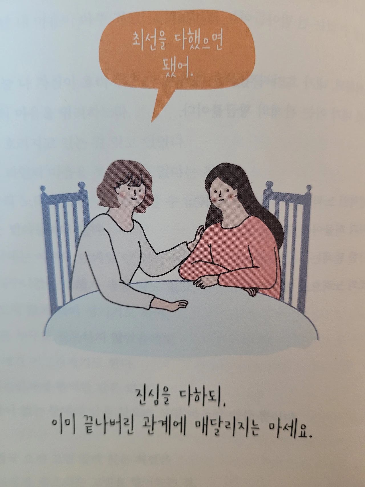 책이 사랑을 받자 저자는 친구들에게 맛있는 것도 사주고 이것저것 챙겨 주고 싶었다. 그러다 혹시나 책이 잘돼서 잘난 척한다고 할까 봐 걱정이 되었다. 그럼 밥 같은 건 사지 말고 내색하지 말아야지 했는데, 혹시 책도 잘됐는데 엄살을 떤다고 생각할까 봐 걱정됐다. 몇 달 동안 실제로 이런 생각들로 머리가 복잡했다. 자신이 흐려지면 안 된다고 말해 왔음에도 타인의 마음을 염려하느라 내가 흐려지고 있는 걸 잊고 있었다. 결코 타인의 마음을 통제할 수 없다는 진실. 아무리 노력해도 관계는 완벽할 수 없다는 진실을 받아들여야 했다. 세상에는 아무리 애써도 안 맞는 사람이 존재하고 어처구니없는 오해가 생길 때도 있다. 의도치 않게 적이 생길지도 모르며 때론 잘못하지 않았음에도 관계가 어그러지기도 한다. 인간관계에 완벽한 답은 없다.