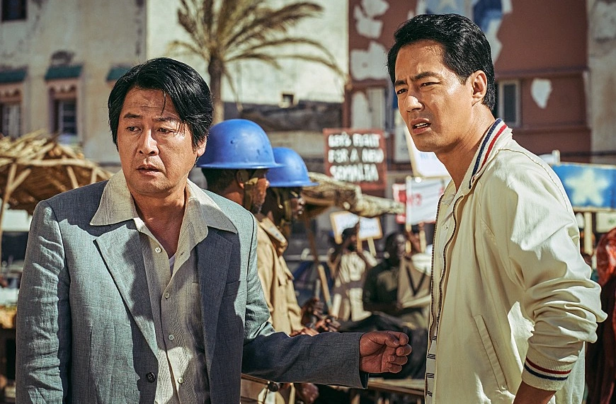 대한민국 공식적인 유엔가입이 1991년이므로 1990년은 승인받지 못한 국가였다. 당시 가장 많은 투표권을 가진 아프리카 대륙은 한국 외교 총력전의 주요 대상으로 떠올랐다. 1987년 한국 정부는 소말리아의 수도 모가디슈에 외교관을 파견한다. 1990년 소말리아 국립대학교 앞에서 청년기술 지원 출정식 현수막과 태극기를 펼치고 외교관 등 20여 명이 사진을 찍었다. 모가디슈 국제공항에 도착한 조인성이 한국을 다녀오면서 소말리아 대통령을 위해 선물을 준비해 왔다. 참사관( 조인성)은 안기부에서 좌천된 사람이었다. 소말리아 한국 대사와 서기관은 선물을 받아서 갖고 가다가 강도 떼의 습격으로 몽땅 빼앗기고 차는 폐차로 변해 뛰어서 대통령궁에 가게 된다. 서기관은 당뇨에 고혈압까지 있는 사람을 3년씩 있게 한다면서 불만이 많다. 그러나 소말리아 정부와 석 달 전에 했던 약속이 15분 전에 취소되었다. 황당한 한국 대사가 따지고 있는 사이 림용수 북한 대사가 포착된다. 강도 떼의 습격과 소말리아 정부와 면담 취소도 북한 측 소행이었다.