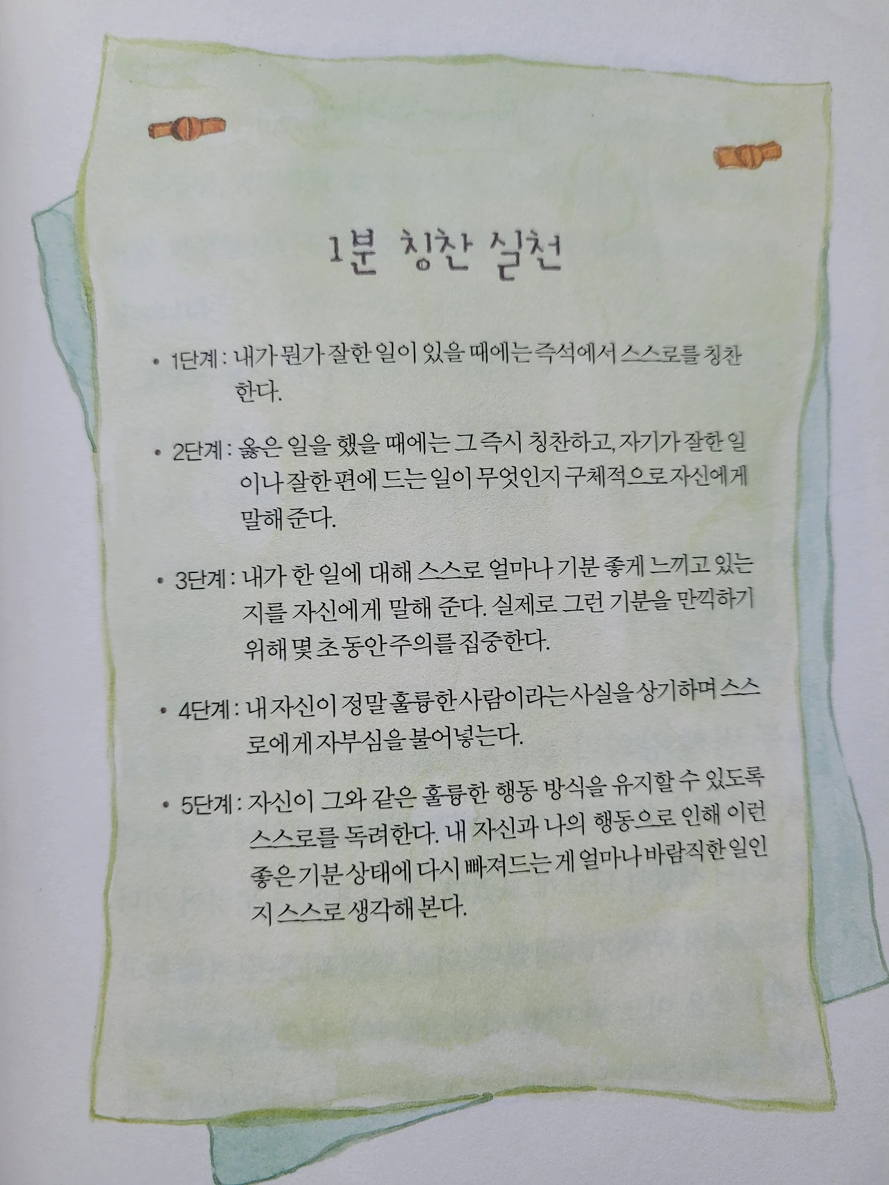 1분 칭찬- " 나는 내가 잘하고 있는 일 파악한다. 나는 그 일에 대하는 나의 태도에 대해 스스로 칭찬한다. 나는 내가 한 일로 인하여 기분이 매우 좋다. 나 자신이 자랑스럽게 느껴진다." 칭찬은 우리를 목표에서 벗어나지 않도록 도와주고, 우리가 바라는 것을 얻도록 해 준다. 또한 즉각적으로 자신에 대한 자부심을 회복할 수 있는 가장 완벽한 방법이기도 하다. 먼저 잠깐 시간을 내서 자신이 잘하고 있는 일을 파악한다. 그리고 자기 자신에게 잘하고 있는 일 혹은 대체로 잘하고 있는 일을 말해 준다. 자신이 하고 있는 일을 얼마나 자랑스럽게 생각하는지 머리와 가슴으로 충분히 느끼도록 집중한다. 적어도 한 달에 한 번은 새롭고 특별한 활동을 함으로써 설렘과 활력을 얻을 수 있다. 자기 자신을 칭찬하고 자부심을 회복하면 많은 것들이 달라질 것이다.