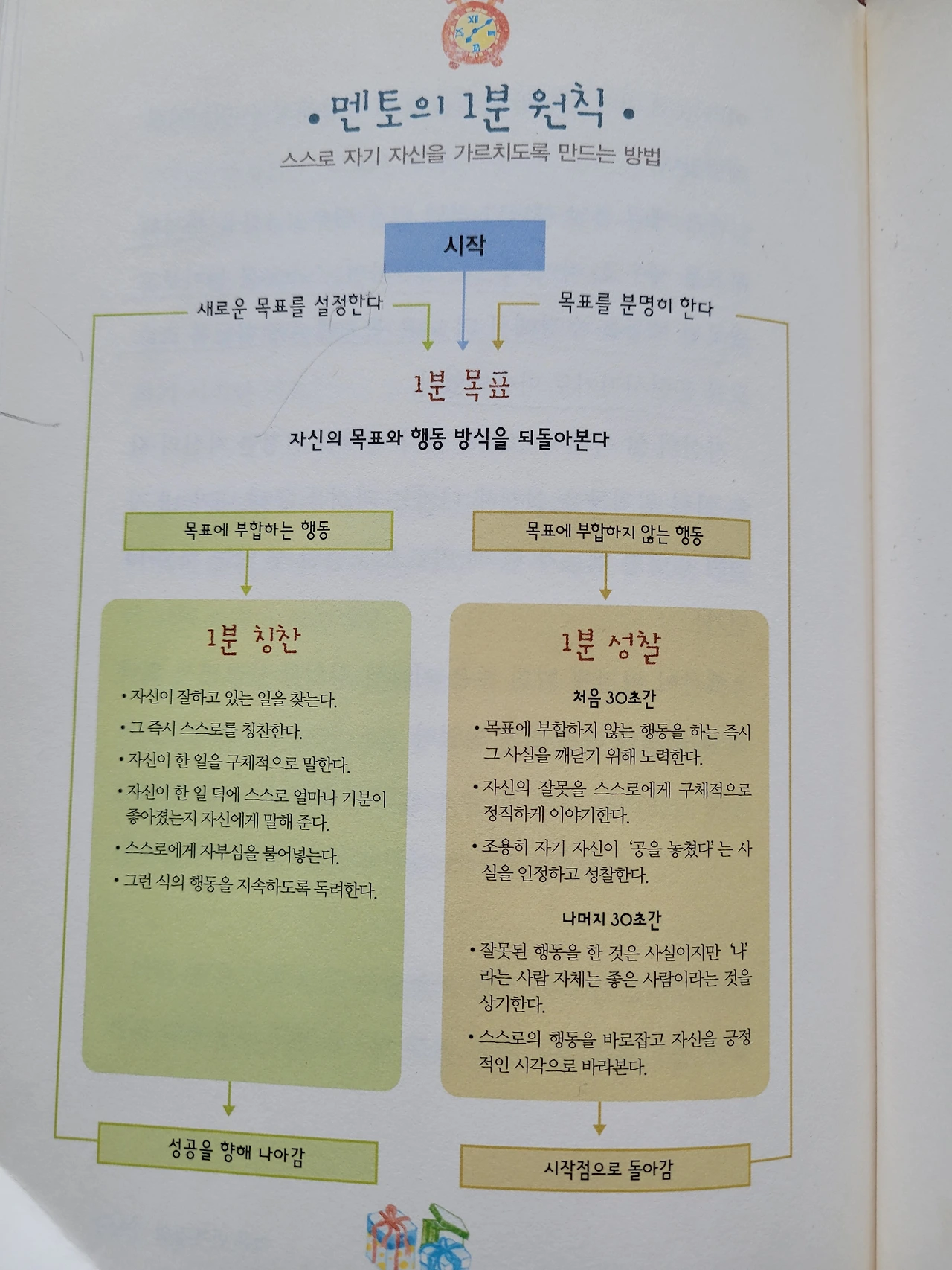 1분 목표는 인생에서 자신이 원하는 것이 무엇인지를 분명히 알게 해 준다. 또 그것을 얻게 될 거라는 확신을 심어 주는 것이 효과라고 할 수 있다. 1분 칭찬은 지금 있는 그대로의 자신을 칭찬하면 된다. 하지만 반드시 정직하고 정당하게 칭찬해야 한다고 조언한다. 그래야 스스로를 자랑스러워 할 수 있다. 1분 성찰은 우리가 날마다 작은 노력을 통해 더 책임감 있는 사람이 되도록 도와준다. 매일 틈날 때마다 하던 일을 멈추고 1분을 투지해 목표를 세우고, 자기 자신을 칭찬하며, 스스로를 돌아보고 잘못된 행동을 수정해서 더 나은 목표에 도달하도록 스스로를 훈련하는 과정이었다. 자신의 삶 속에서 그토록 찾아 헤매던 진정한 자신의 길은 원칙들을 실천해 나가는 과정을 통해 내가 나 자신의 전정한 멘토가 될 때 비로소 도달할 수 있을 것이다.