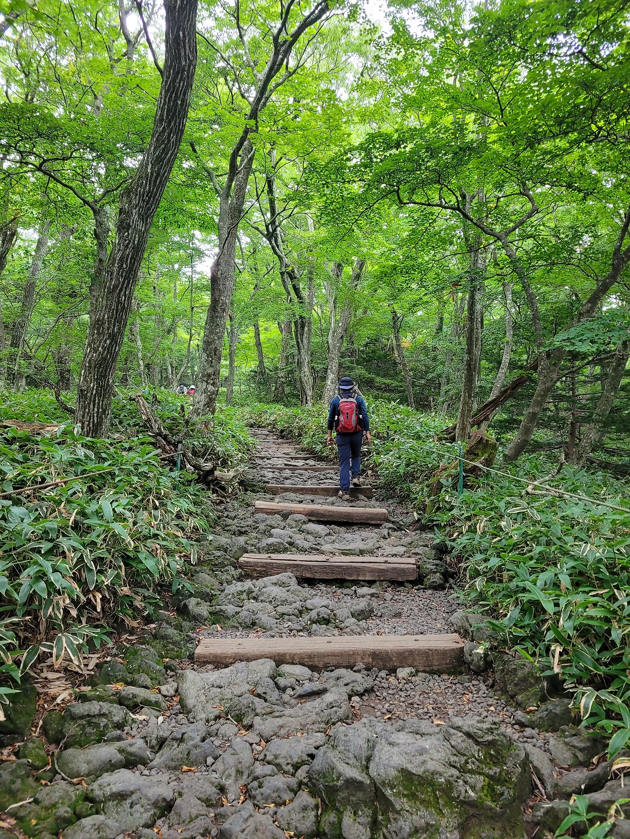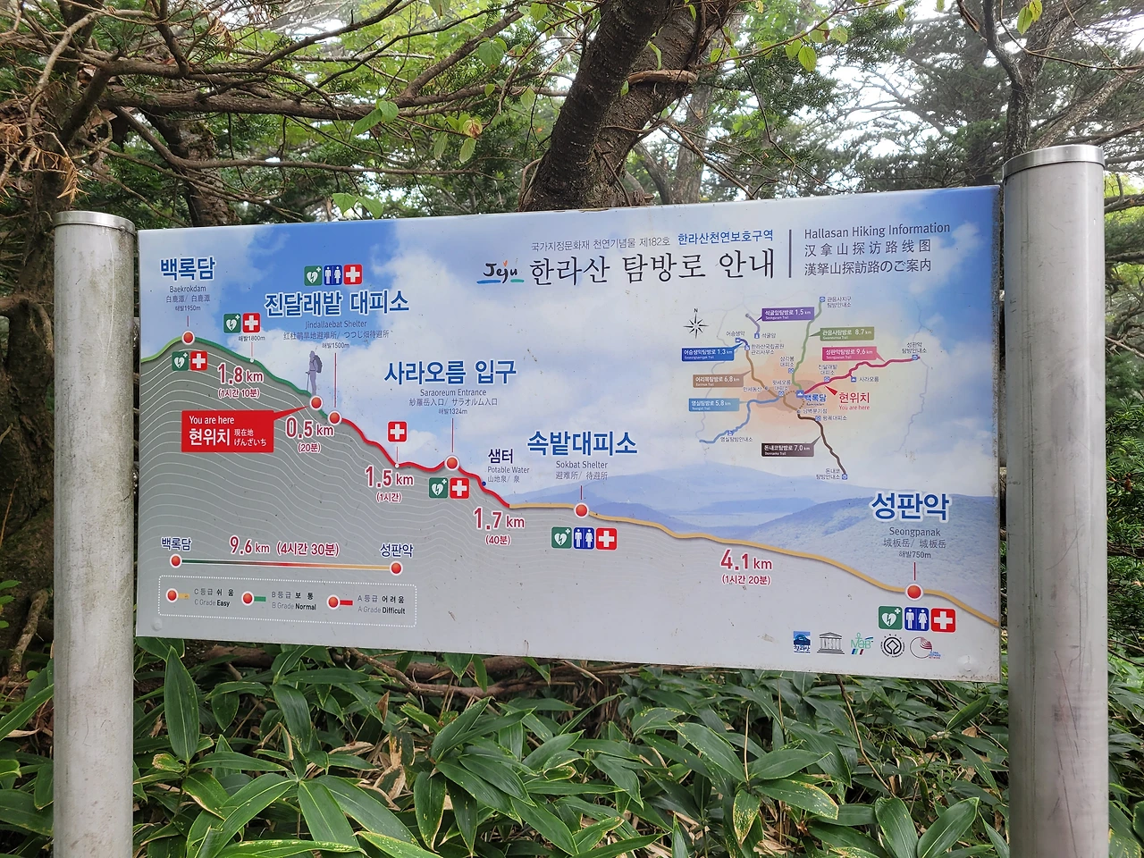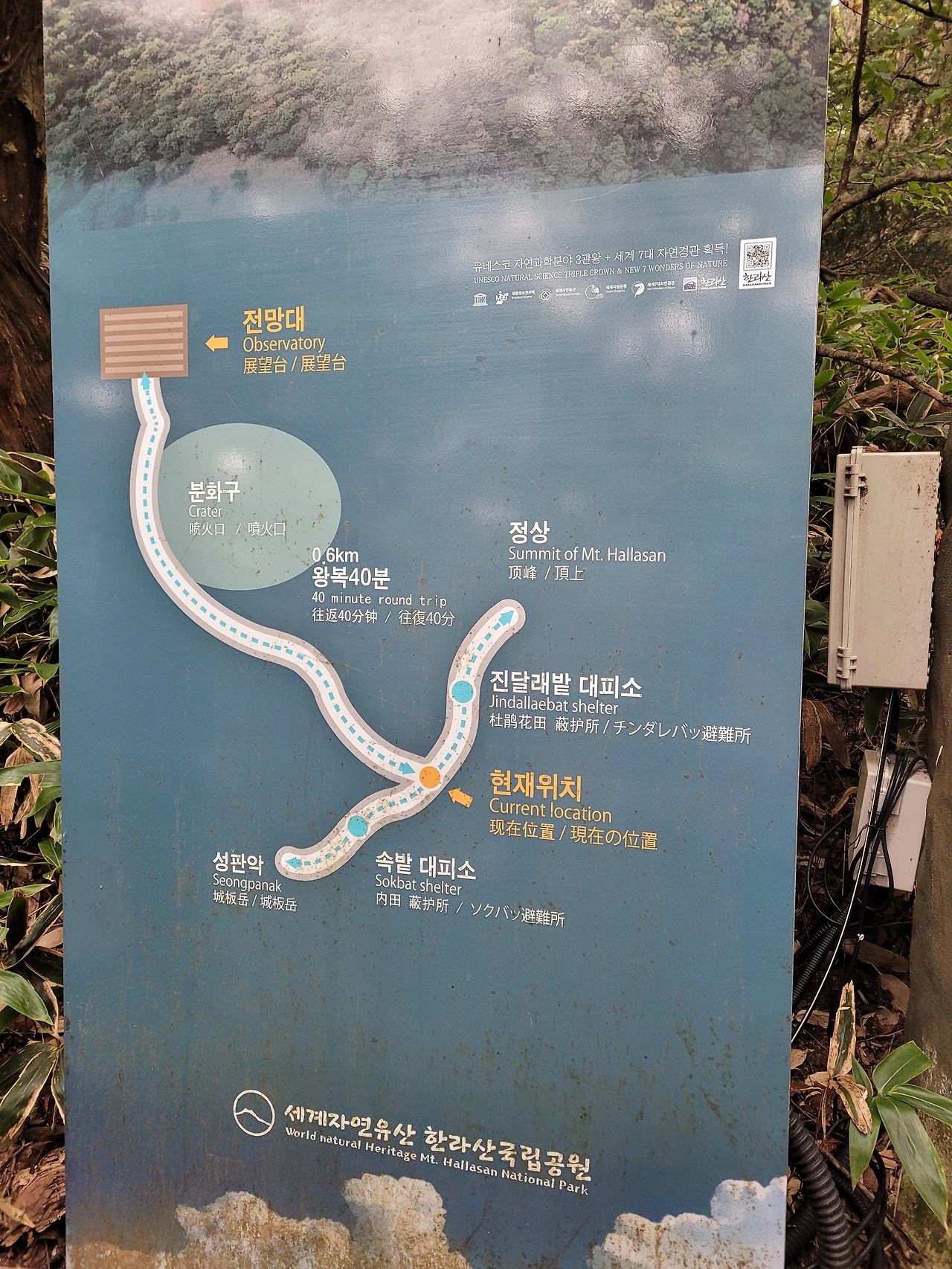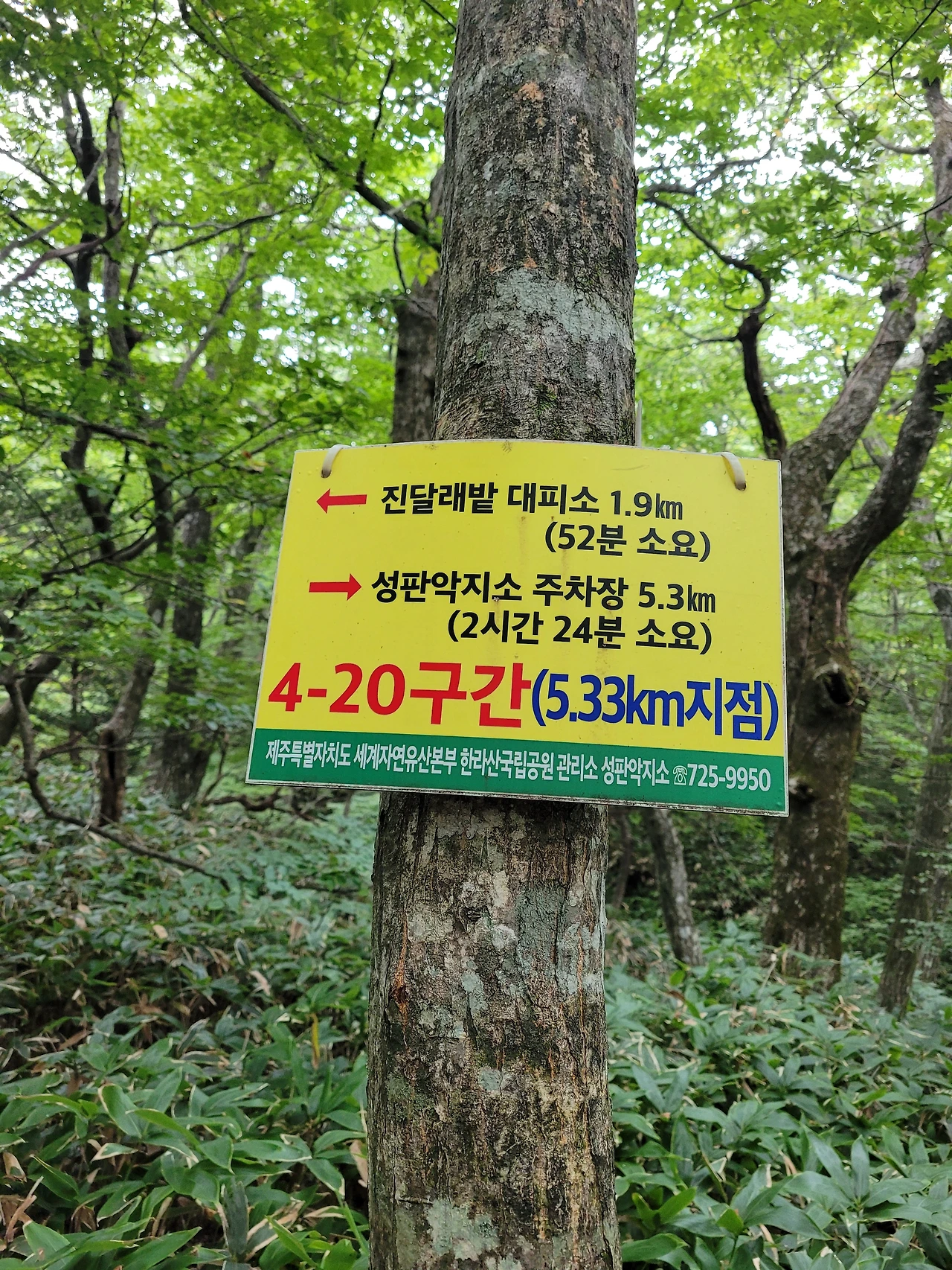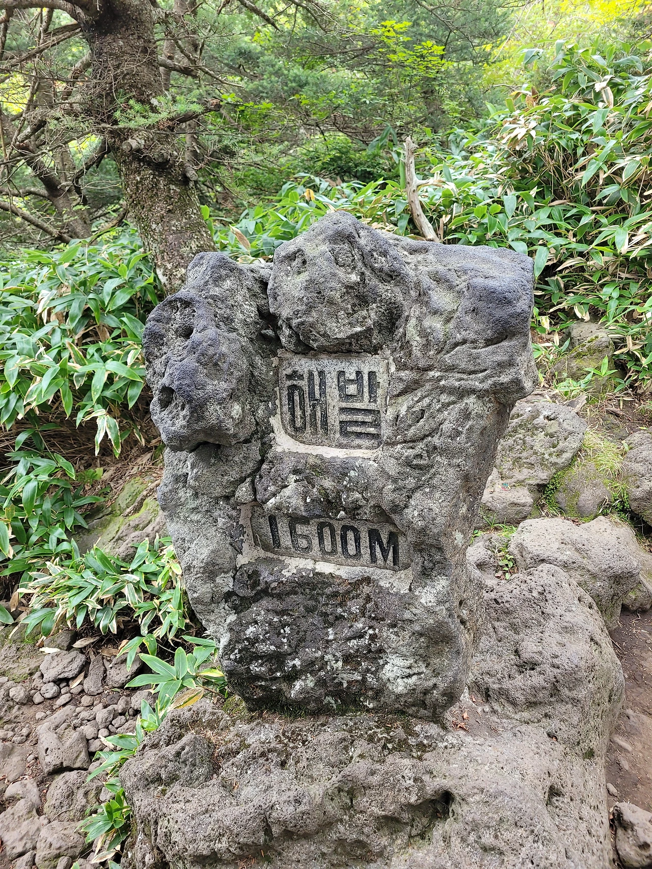 한라산 등반은 홈페이지를 통해 미리 날짜에 맞게 신청을 해야 가능합니다. 그리고 자가용을 가져가려면 새벽 (5시~6시) 사이 일찍 가야 주차가 가능하고 이후엔 <국제대학교 환승 주차장>에 주차 가능합니다. 한라산은 남한에서 제일 높은 산(1950미터)으로올라갈 수 있는 곳은 다섯 군데 탐방로(성판왕, 관음사, 어리목, 영실, 돈 네코)입니다. 요즘 허용은 관음사와 성판왕 두 곳에서 올라갈 수 있습니다. 저희는 시내버스를 타고 6시 40분쯤 성판왕에 도착했는데 이미 주차장은 만차였습니다. 이제 도로가주차는 불법으로 간주 하기에 주차할 수 없답니다. 그래서 대중교통을 이용하여 가게 되었습니다. 입구에서 미리 문자로 받은 QR코드를 찍고 산으로 입장했습니다. 처음엔 길이 다소 완만해 편안한 마음으로 걸을 수 있었죠! 그리고 나뭇잎으로 덮은 하늘과 바닥엔 편하게 걸을 수 있도록 야자나무 재료로 만든 매트나 나무 재료 매트가 깔려 있어 걷기에 편하고 좋았습니다. 중간중간 현재의 위치를 알려주는 표지판이 있어서 어디쯤 걷고 있는지 알 수 있어 도움이 되었습니다.