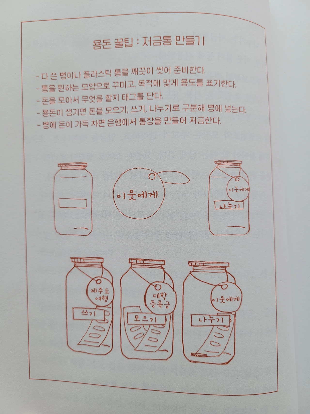 동전과 지폐를 모으는 일을 통해 아이는 오감이 발동된다. 즉 돈의 냄새를 맡고, 돈의 양을 눈으로 보고, 돈을 손으로 만져보고, 저금통에 동전의 땡그랑 소리를 듣고, 사 먹는 간식의 맛까지 아이는 오감을 통해 돈을 알아간다. 이 모든 과정은 전자화폐의 거래로는 느낄 수 없다. 저자는 돈의 흐름을 배울 수 있는 기간은 초등학교부터 고등학교까지 12년이라고 했다. 초등시기가 실물경제를 공부해 볼 수 있는 적기라면, 중학생 이후로는 전자 경제의 비중이 높아진다고 한다. 돈을 모으는 일은 매일의 습관이 돼야 한다. 용돈 관리를 습관화시키기 위해 가장 좋은 방법은 아이가 모은 돈으로 하고 싶은 것을 해보고, 사고 싶은 것을 사보거나, 프리마켓, 홈 알바로 돈을 벌어 보는 것이다. 아이가 용돈이 필요하다고 말하거나, 돈을 잃어버리지 않고 챙길 수 있는 초등학교 때가 용돈 관리의 적기이다. 이후 중. 고등학생 시기는 모으고. 쓰고. 나누는 반복을 통해 경제 습관이 체계화시킨다. 성취감과 자신감은 용돈 관리의 필요성을 더 많이 체감할 수 있을 것이다.