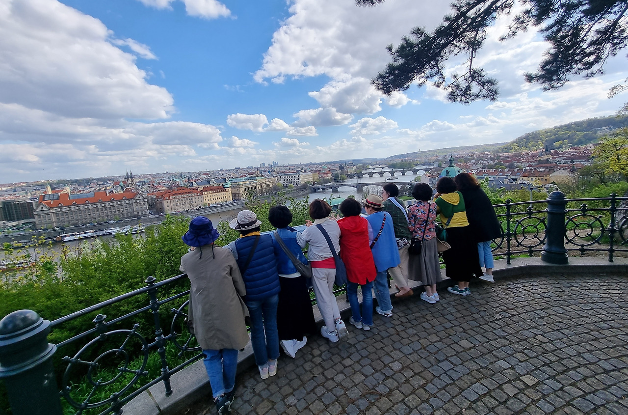 숙소에서 조금 벗어난 기찻길에서 사진을 찍고 이동할 차를 기다렸다. 맑은 공기와 유난히 파란 하늘과 뭉게구름을 보니 기분이 상쾌했다. 프라하 현지 가이드 안내로 프라하 성을 구경했다. 프라하 성 앞으로 펼쳐진 흐라트차니 광장에서 바라본 하늘 뭉게구름이 마치 천사가 기도하는 모습을 보는 것 같아서 감탄하였다. 프라하 도시 계단길로 이동하면서 골목길 곳곳에서 그들의 삶의 모습을 들여다봤다. 말로만 듣던 프라하에 와 보다니 그 자체로 감동이었다. 체코 공산주의가 무너지고 전 세계를 마음대로 다닐 수 있어 다행이다.