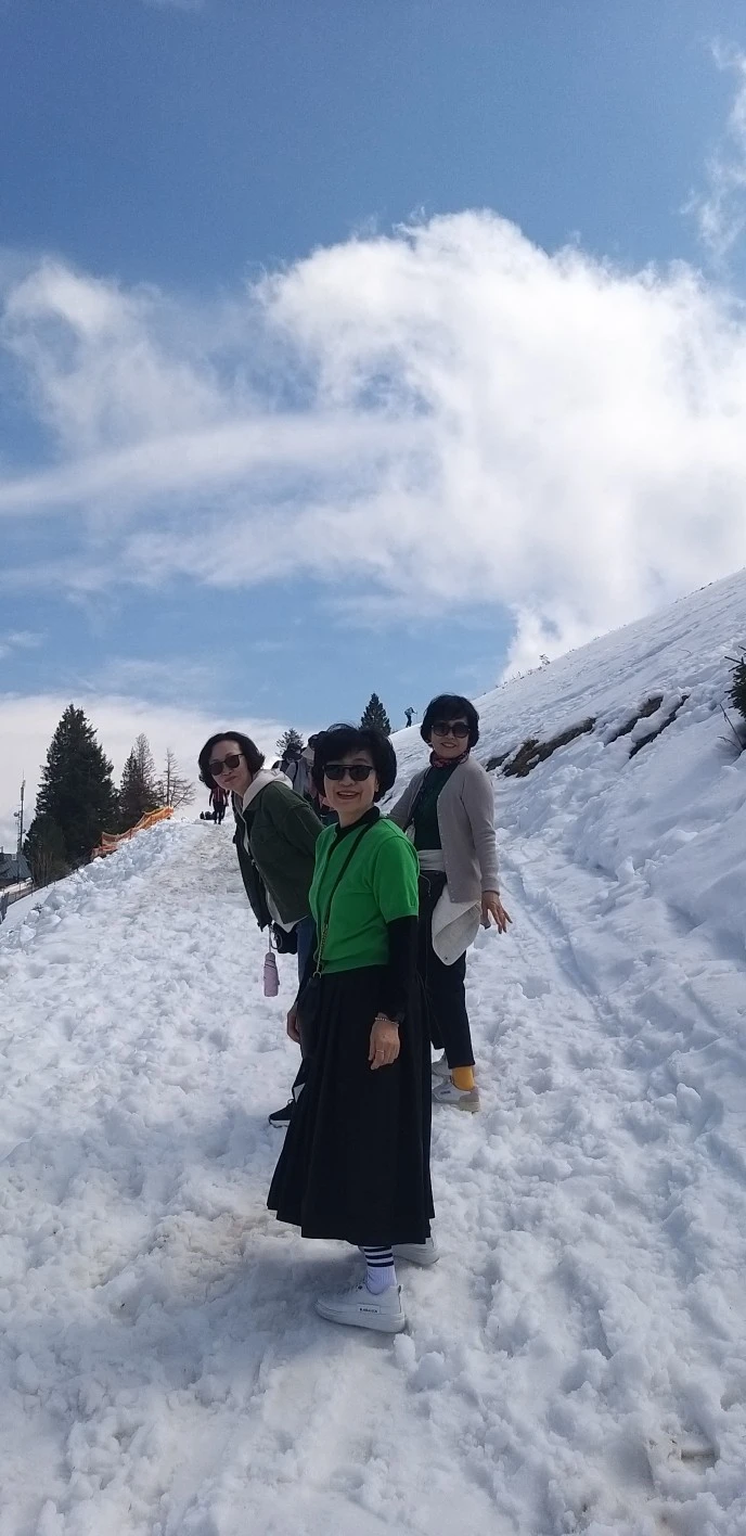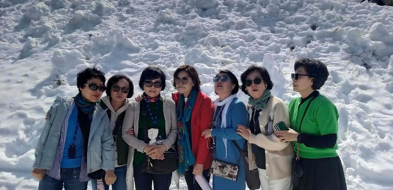 생각보다 춥지는 않았지만 눈은 오래도록 녹지 않아 만년설로 남아 있었다. 아래는 꽃들이 만발했는데 이곳은 뜨거운 여름에도 눈들이 그대로 쌓여 있을 것이다. 겨울과 여름이 공존하는 곳이라 신비스럽다. 여러 곳에서 사진을 찍었으나 더 높은 곳은 미끄러울 듯해서 가지 않았다. 얼마 전까지 추워서 패딩을 입었고 다들 고생을 했었다고 여행사 가이드가 알려 주었다. 만년설에서 바라보는 호수가 한눈에 들어왔고 펼쳐진 배경으로 다양한 포즈를 취하며 사진을 찍었다. < 이어 다음 주에 발행합니다.>