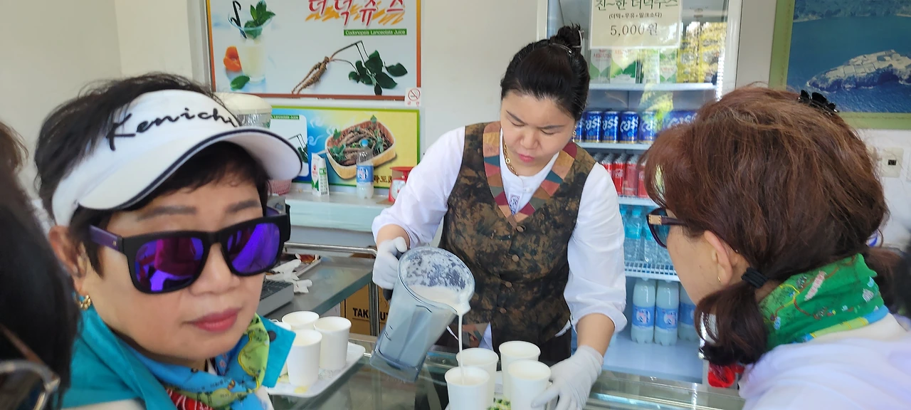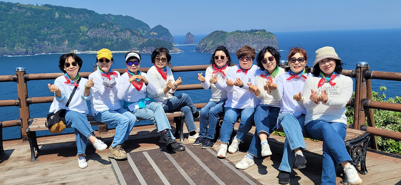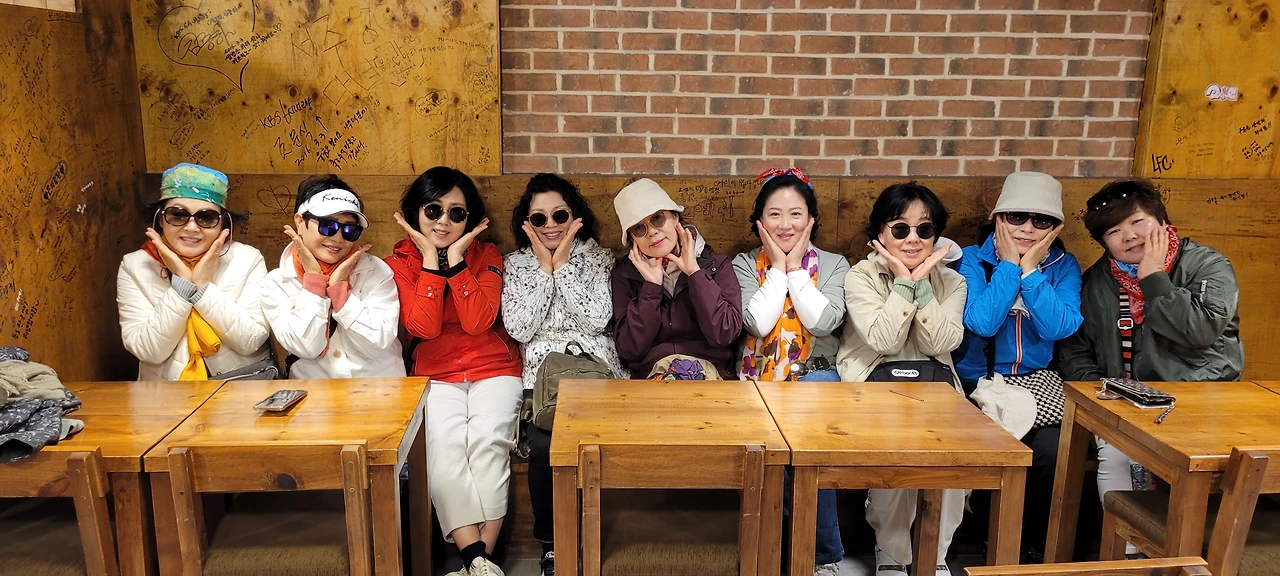 점심엔 울릉도 YTN에서 맛집으로 촬영된 집에 가서 점심을 먹었는데 맛이 괜찮았다. 반찬도 맛있었고 주인장도 친절했다. 우린 한 번 더 이곳 식당에 와서 식사를 했다. 이후 우리는 커피숍에서 커피를 마시며 수다를 떨고 사진도 찍었다. 꽃받침 하면 모두가 떡 아래에 두 손을 가져다 바치고 웃고 사진을 찍었고 하트 하면 엄지와 검지를 어긋나게 해서 하트를 만들며 환하게 웃었다.