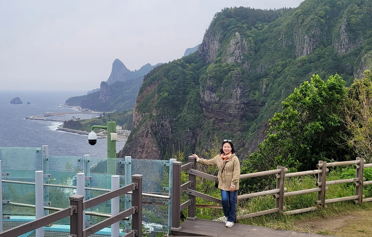 밀물과 썰물이 만나는 모습을 바라보고 사진을 찍었는데 정말 멋졌다. 태하 향목 전망대에는 줄을 길게 서 기다려 모노레일을 타고 올라갔다. 그래도 정상까지는 걸어가는 곳이 좀 길었다. 한참을 걸어갔는데 바람이 많이 불었다. 멀리 바다와 울릉도의 바위들이 눈에 들어온다. 투명한 유리로 세팅된 곳에서 아슬했지만 사진을 여러 장 남겼다.