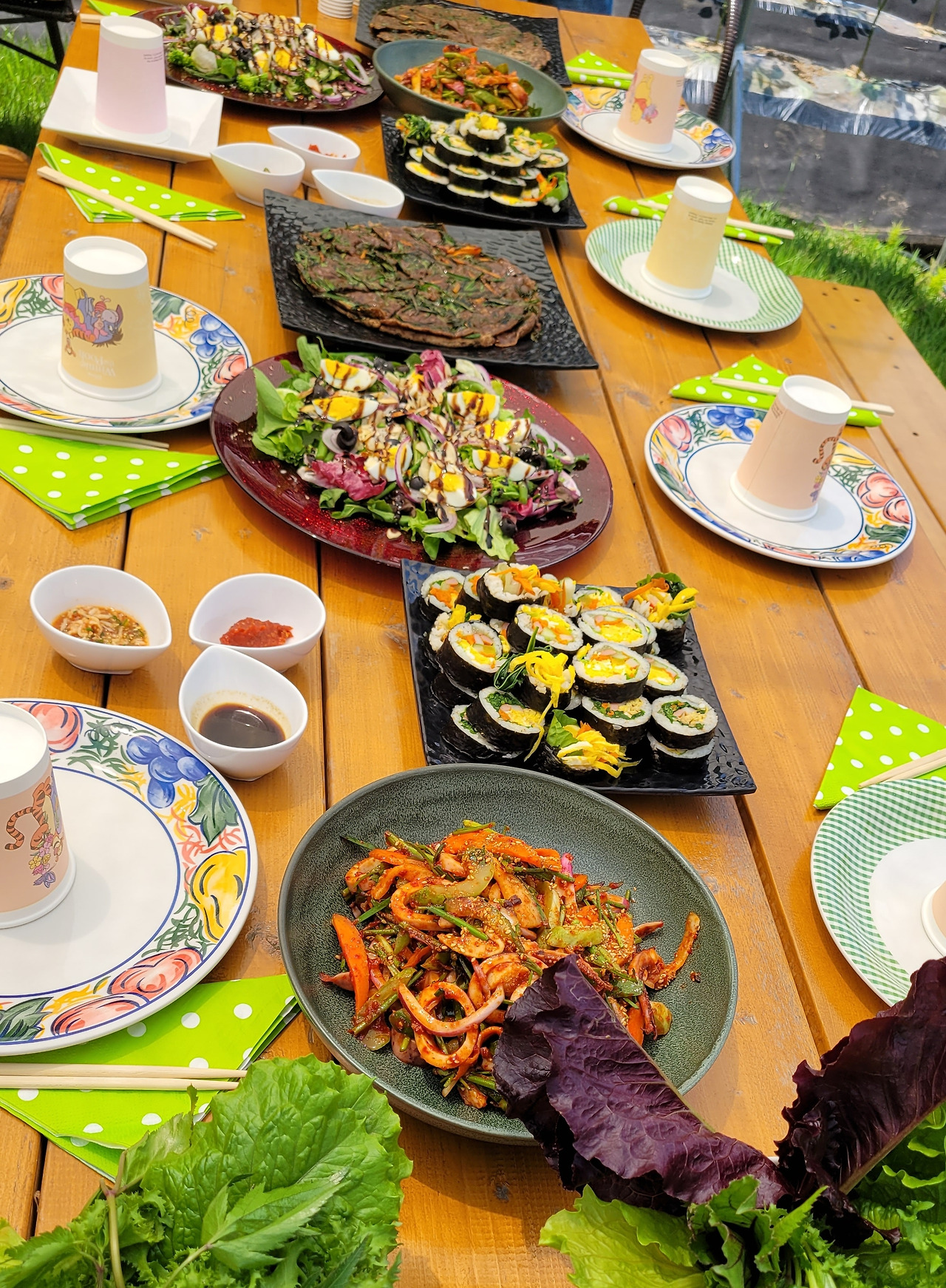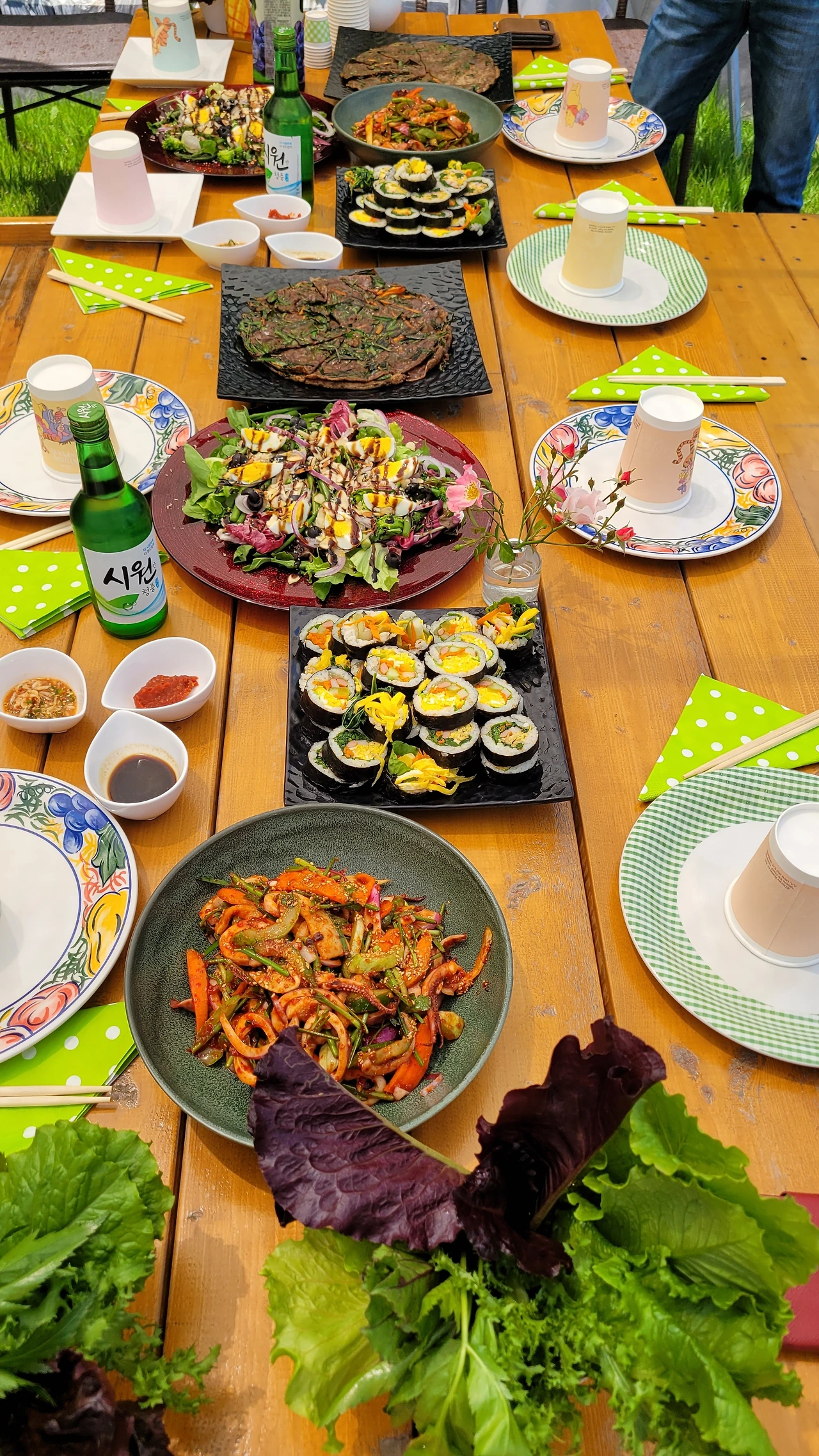 이제 다들 출가시키고 우리도 나이가 들어가고 있네요. 그래도 이렇게 만나서 허심탄회하게 이야기도 나누고 음식도 함께 할 수 있으니 아주 즐겁고 행복했습니다. 사랫길 농원은 저희 아파트와 차 타고 불과 20분 정도 떨어진 곳인데 주변에 산과 들이 있어서인지 확실히 공기와 하늘 푸름의 모습이 달랐어요. "어머, 이렇게 다르다고?" 얼마 전 다녀온 동유럽의 하늘과 같이 더욱 파란 하늘과 무공해로 잘 자란 채소와 과일들을 보니 정말 부러웠어요. '두 분이 얼마나 이 농원에 시간과 땀을 투자했을까?' 그러니 지금 이렇게 누리고 사는 건 당연한 결과라고 생각합니다. 친한 이웃을 둬서 저희가 호사를 누리고 삽니다. 워낙에 별이 언니가 요리를 맛있게 잘하고 세팅까지 잘해서 마치 저희가 주인공이 된 것처럼 행복했어요. 이야기도 나누고 웃고 떠들고 하며 음식을 맛있게 먹었답니다. 하나하나 사진을 찍는 건 기본 예의라 생각했어요. 그래야 요리를 하신 분의 정성을 두고두고 느낄 수 있을 테니까요. 지난주에 서로 시간을 맞춰보다 안 맞아서 오늘 왔는데요, 지난주에 왔더라면 비 때문에 화창하게 즐기지는 못했을 거예요. 모두의 축복입니다. 하하