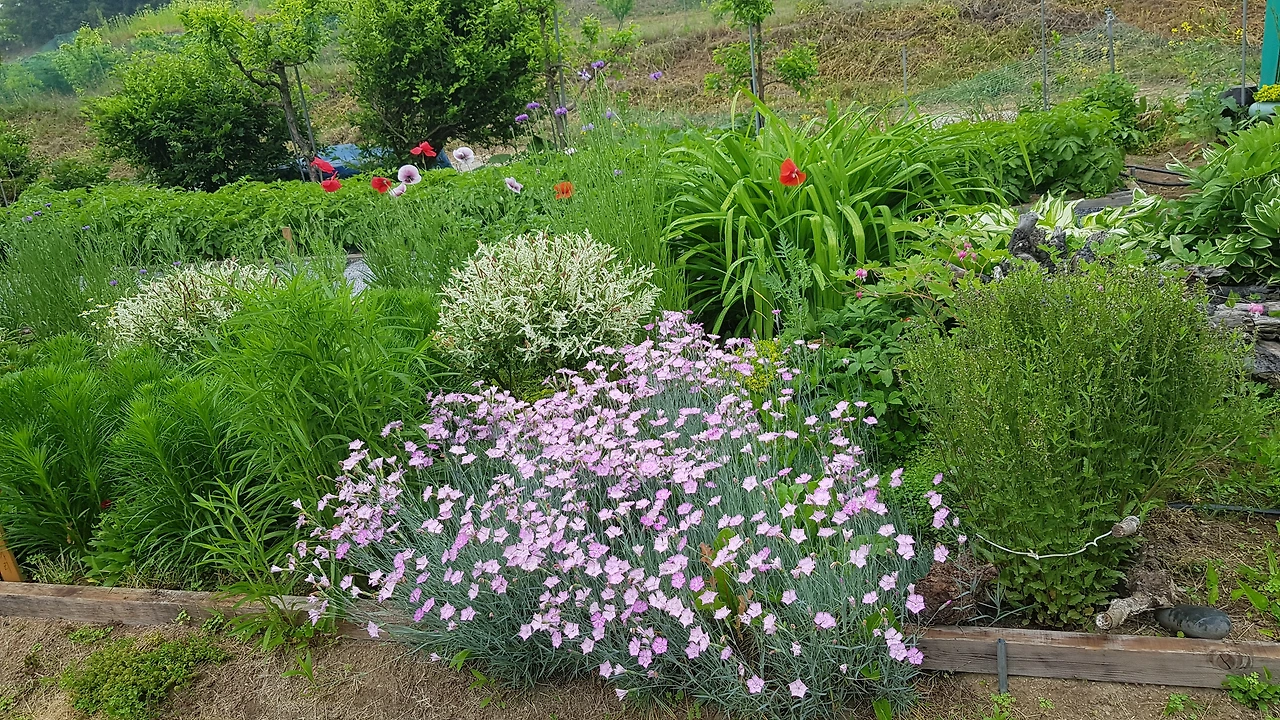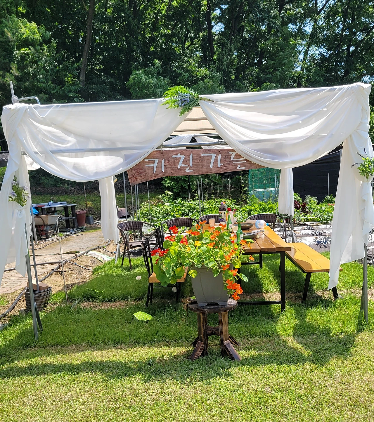 가든에서 모임 하는 날 오전 성당의 신심 미사가 있었어요. 사실 사랫길 농원을 가려고 성당 갈 생각은 안 했습니다. 그런데 갑자기 미사 봉헌 할 일이 생겨서 참례 후 허겁지겁 달려와 11층 부부님과 함께 출발했답니다. 가보니 벌써 8층 부부님이 와 계셨어요. 형부가 미리 훈제 항아리를 만들어 양념에 재운 통삽겹을 항아리 안에 걸쳐 넣고 맛있게 구워 놓으셨어요. 정성껏 만든 요리들을 별이언니가 예쁜 그릇에 담아 주면 바깥에 마련된 야외 식탁에 가져다 놓았습니다. 식탁만이 아니라 정말 드레시한 커튼까지 게다가 한쪽엔 꽃 핀 화분까지 파티에 딱 어울리는 상을 차리고 보니 정말 보기 좋았습니다. 저는 식탁에 차려진 요리들을 사진에 담느라 이리저리 다녔답니다. 그리고 농원을 한 바퀴 돌며 꽃과 화초 사진을 찍어 두었습니다. 정리가 되자 우리는 자리에 앉아 만남을 기뻐하며 이야기를 나누었어요. 멋진 곳에 우리를 초대해 주셔서 감사한 마음을 담아 음식을 맛있게 먹기 시작했습니다. 워낙에 요리도 훌륭하고 더 많은 분들과 함께 하면 좋을 듯해서 "주말에예약을 받고 돈을 받으면 어떨까요?" 제안했지만 별이 언니는 가족과 지인들에게 이렇게 하는 것으로 충분히 만족한다고 하시네요. ^~^
