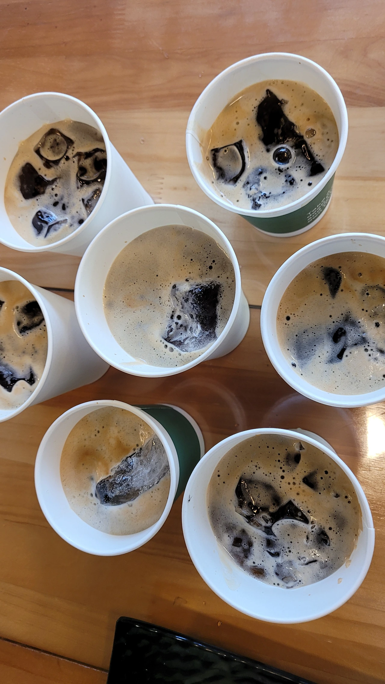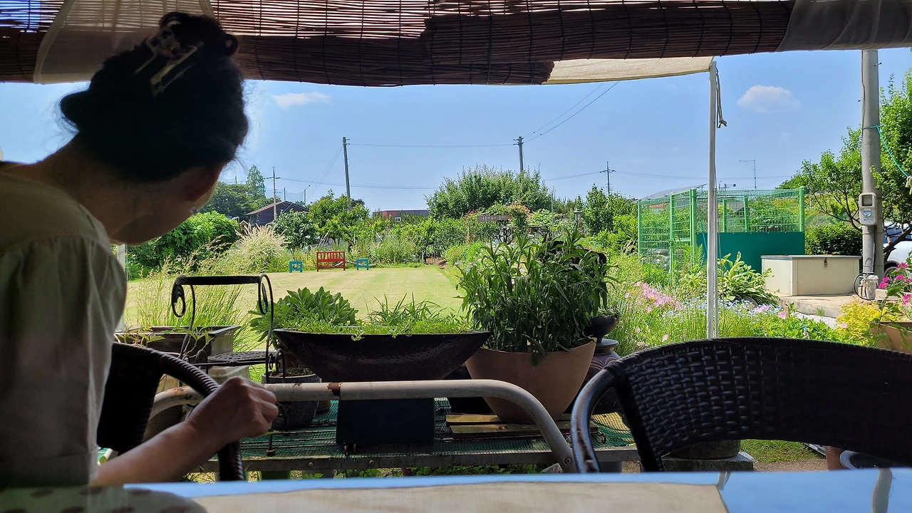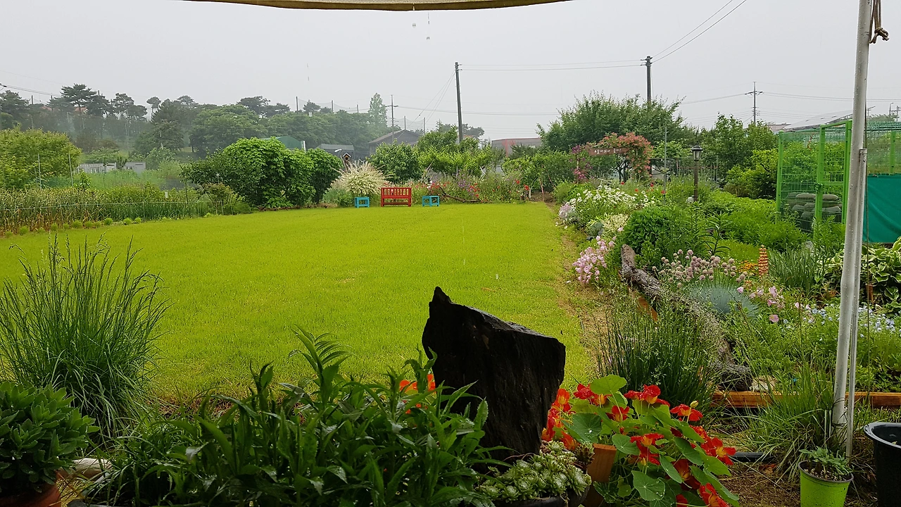 식사를 마치고 우리는 그늘 쪽으로 이동했습니다. 작은 집을 지어 냉장고와 농기구, 농산물 수확한 것을 보관하는 창고가 있습니다. 그리고 여유공간에 테이블을 세팅하여 마치 커피숍의 분위기가 나도록 만들어 놓았거든요. 우리는 잔디밭을 바라보며 아이스커피를 마셨습니다. 참외와 제가 가져간 쑥개떡도 먹었어요. 동유럽과 울릉도까지 놀러 갔다 와서 쑥을 뜯지 못해 속상했는데 기어이 해냈답니다. 한 달 전에 울릉도 여행에서 돌아와 늦었지만 남편에게 쑥을 뜯으러 가자고 했더니 기꺼이 동행했어요. 남편은 저와 함께 하는 걸 좋아합니다. 해마다 제가 냉동실에 해놓고 먹는 간식인데 내년까지 기다려야 하면 허전하고 서운하지요. 쑥개떡을 만들어 냉동실에 넣어 놓으면 심심할 때 쪄먹기도 하고 손님 접대에도 좋거든요. 그런데 요즘은 농약이나 자동차 매연 등으로 예전처럼 안전하지가 않아서 장소를 골라서 채취해야 합니다. 대청댐 쪽에 갔는데 그 안쪽으로 그렇게 넓은 장소가 있는 줄 몰랐네요. 처음에 간 곳은 쑥이 별로 없어서 다른 곳으로 이동을 했어요. 다행히 그곳에 쑥이 많아서 몰입해서 채취를 하다 보니 양이 상당히 많았답니다. 올해는 쑥에다 얻어온 구절초까지 넣어서 넉넉히 해 먹어도 되겠습니다.