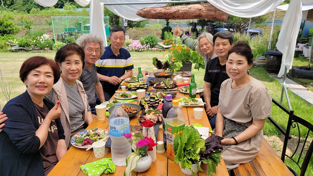 6월 첫 주말에 사랫길 농원 가든파티에 갔습니다. 14층에 사는 별이 언니네가 같은 통로의 세 부부를 초대해 주셨어요. 저희 부부는 사랫길 농원에 몇 번 간 적이 있습니다. 이번엔 네 쌍의 부부들이 미리 약속을 잡았는데, 날씨도 좋고 공기도 맑아서 더욱 기분 좋은 만남을 가졌습니다. 저희는 1046세대 단지인 15층의 아파트에 살고 있습니다. 그래도 택지개발로 주택 단지와 공원 조성까지 잘 되어 있고 편의 시설도 잘 갖춰진 동네랍니다. 학군도 좋아서 초. 중. 고가 2~3개씩 있고 옆에는 규모가 큰 도서관도 있습니다. 오래된 얘기지만 월드컵 때는 동네 주민들이 앞 공원에서 대형스크린을 보면서 함께 응원하기도 했습니다. 휴식의 공간과 걷기 운동을 할 수 있는 공원이 양쪽에 두 개나 있고, 지금은 수리 중이지만 도서관이 옆에 있어 살기 좋은 동네입니다. 그래서 지금 아파트가 편리하고 좋은가 봅니다. 셋집이 단지 내에서 한 번씩 이사를 했고, 한 댁은 다른 곳에 살다 다시 오셨습니다. 예전엔 반상회도 하고 만남을 갖었지만 요즘은 엘리베이터에서 마주치고 인사하는 게 다잖아요. 그런데 저희들이 친밀하게 지낼 수 있는 건 사랫길 농원 만남 덕분이 아닐까 생각해요.