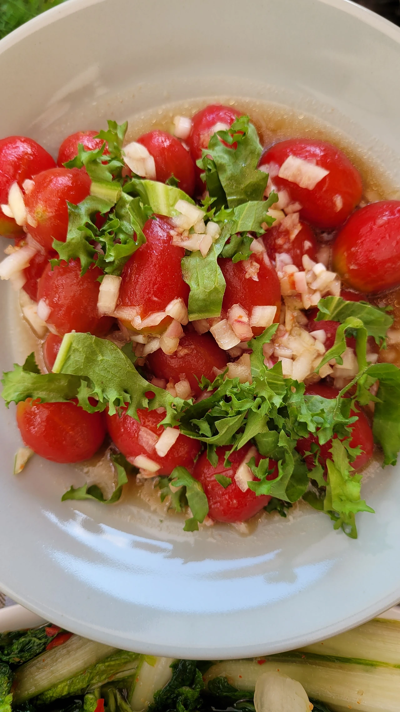 방울토마토 40개 기준 / 어린잎 채소(치커리나 상추등)한 줌 / 양파 반 개~한 개