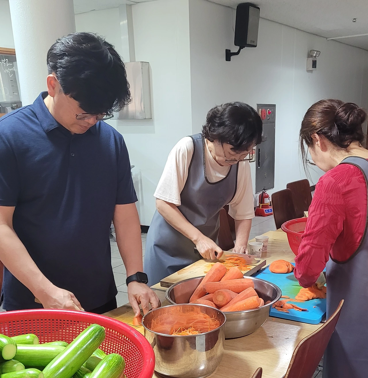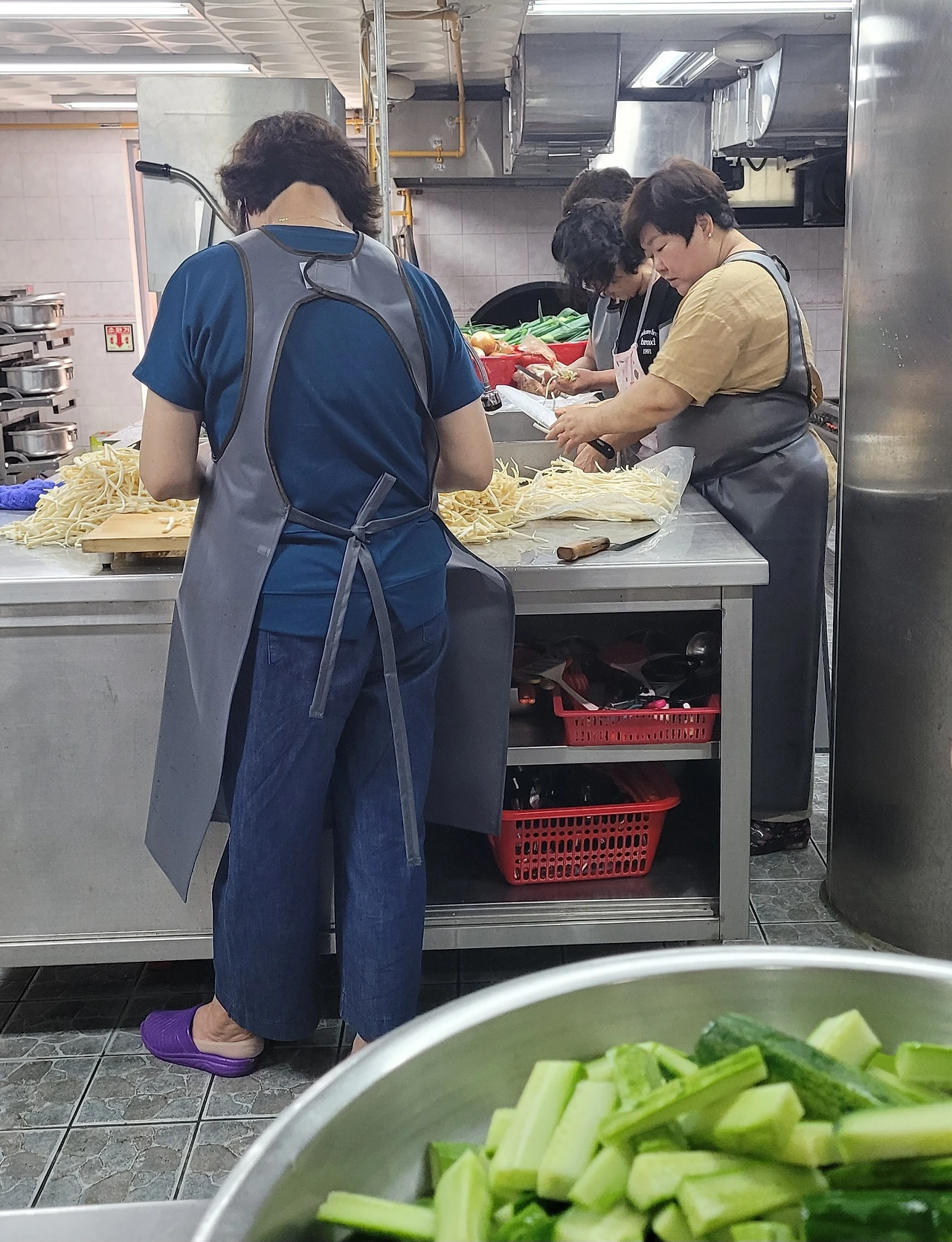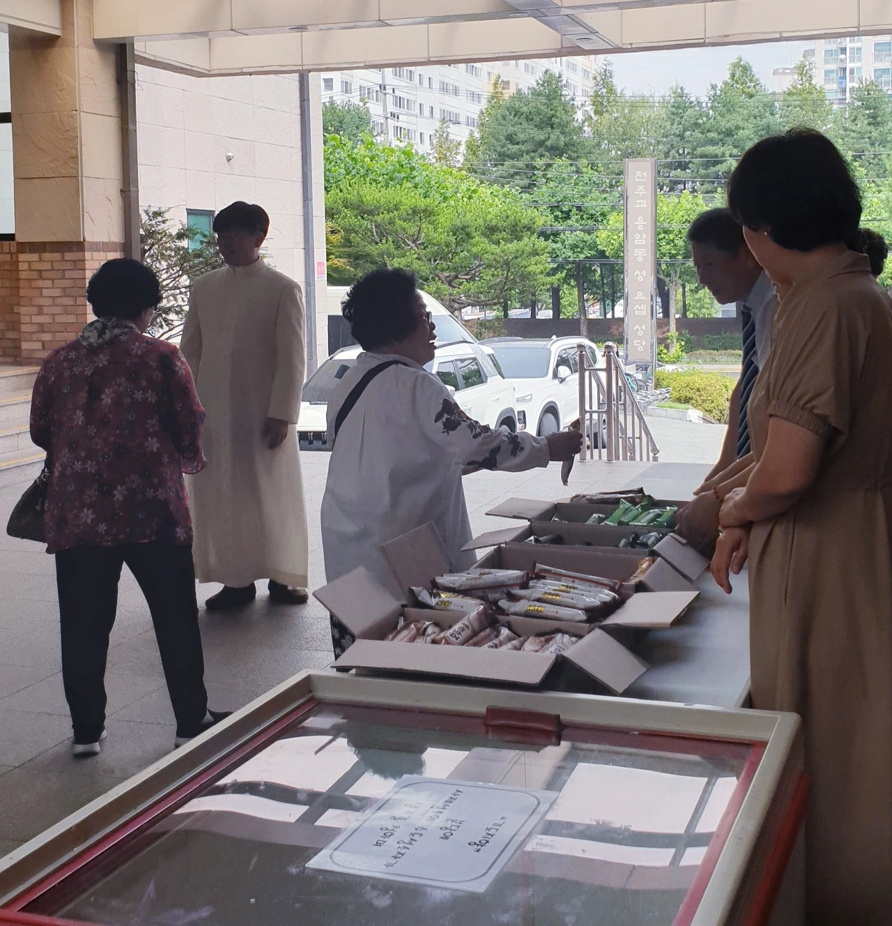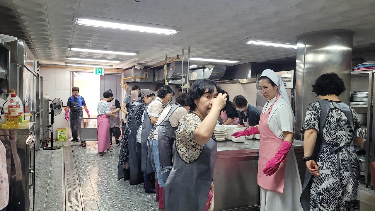아침 7시에 가보니 이미 도라지무침과 반찬들을 해 놓고 아침 먹을 준비를 했다. 몇 가지 반찬을 준비해 30여 명의 봉사자들이 아침을 먹고 설거지를 마쳤다. 그러고 나서 부추전을 부치려고 준비했다. 부추전에는 밀가루에 부추와 양파, 호박, 그리고 홍고추가 들어간 반죽을 식용유를 넣고 부치니 아주 먹음직스러웠다. 8개의 가스버너에서 봉사자들이 연신 부추전을 부쳐댄다. 노릇노릇하게 먹음직스럽게 부치는 게 핵심인데 모두들 아주 잘했다. 두 차례 식사를 해야 한다. 8시 30분 미사와 10시 30분 미사 후에 오시는 분들이 거의 비슷하다. 8시 30분 미사 후에 미사온 신자들도 먹고 갈 수 있도록 하려면 서둘러야 한다. 다행히 미사 전에 잘 끝냈고 정리까지 잘했다. 안에서는 국수 육수와 잔치국수를 삶아서 한 그릇에 담는 준비 하느라 정신이 없다. 상들이 거의 차려지고 봉사자들이 영성체를 모시고 내려왔다. 오늘 아이스크림 나눔 첫날인데 봉사자이다. 아이스크림 나눔 봉사를 하러 1층 로비로 갔다. 물론 식사들을 다하고 가면 좋으련만 개인 사정들이 있어서 못 먹고 가는 분들이 생긴다. 그분들께 시원한 아이스크림을 드렸다. 이번엔 주임 신부님께서 매주 주일미사뿐만 아니라 평일미사에도 주신다고 하신다. 다들 아이스크림을 받아가며 더운 날씨에 시원하게 드시겠다며 좋아하셨다.
