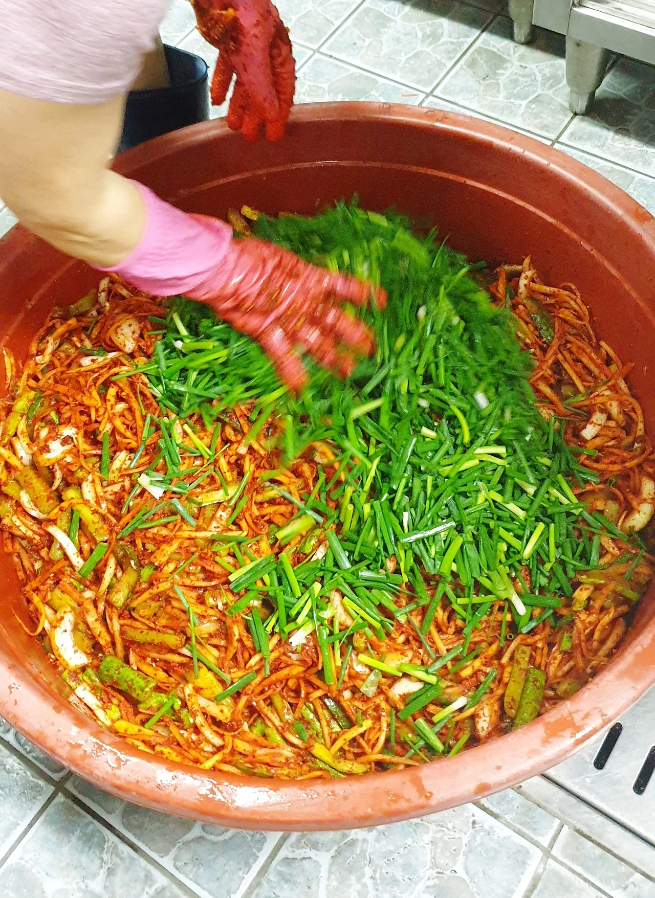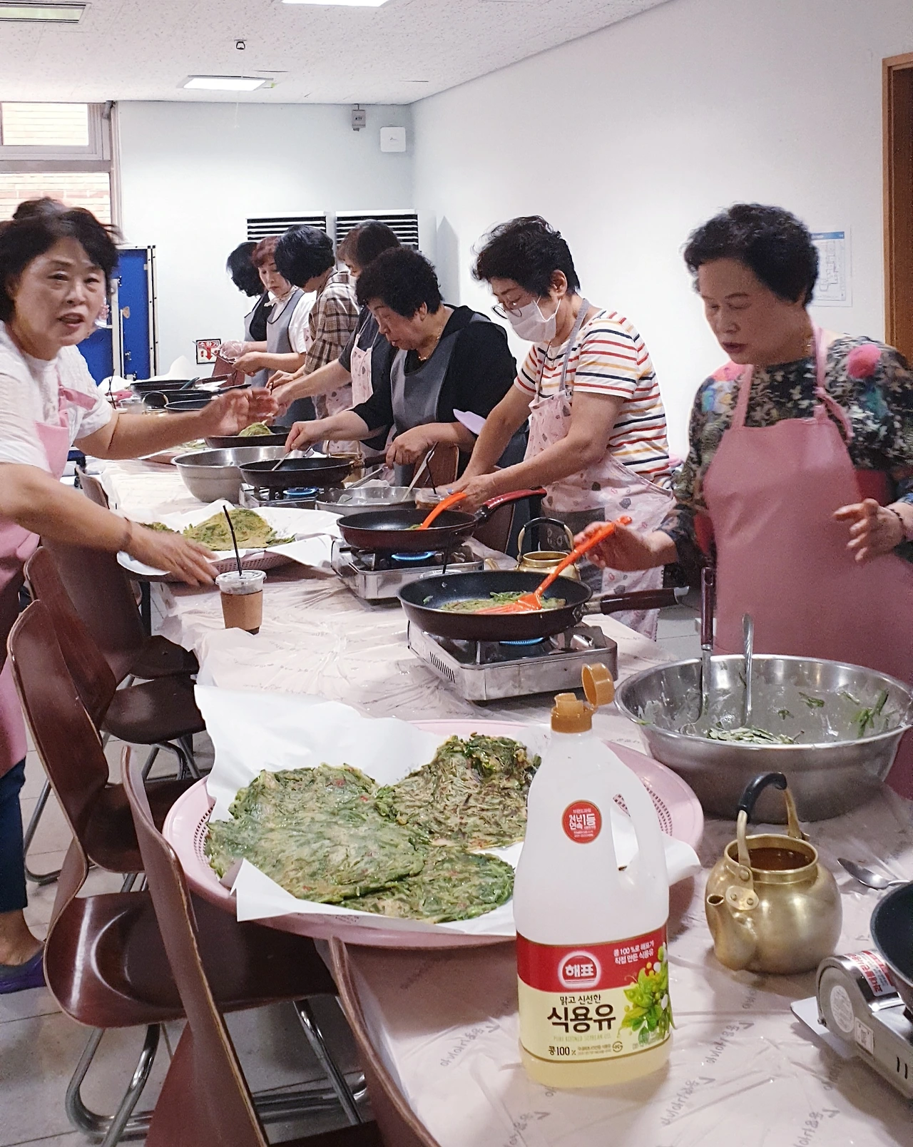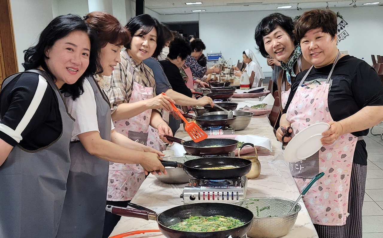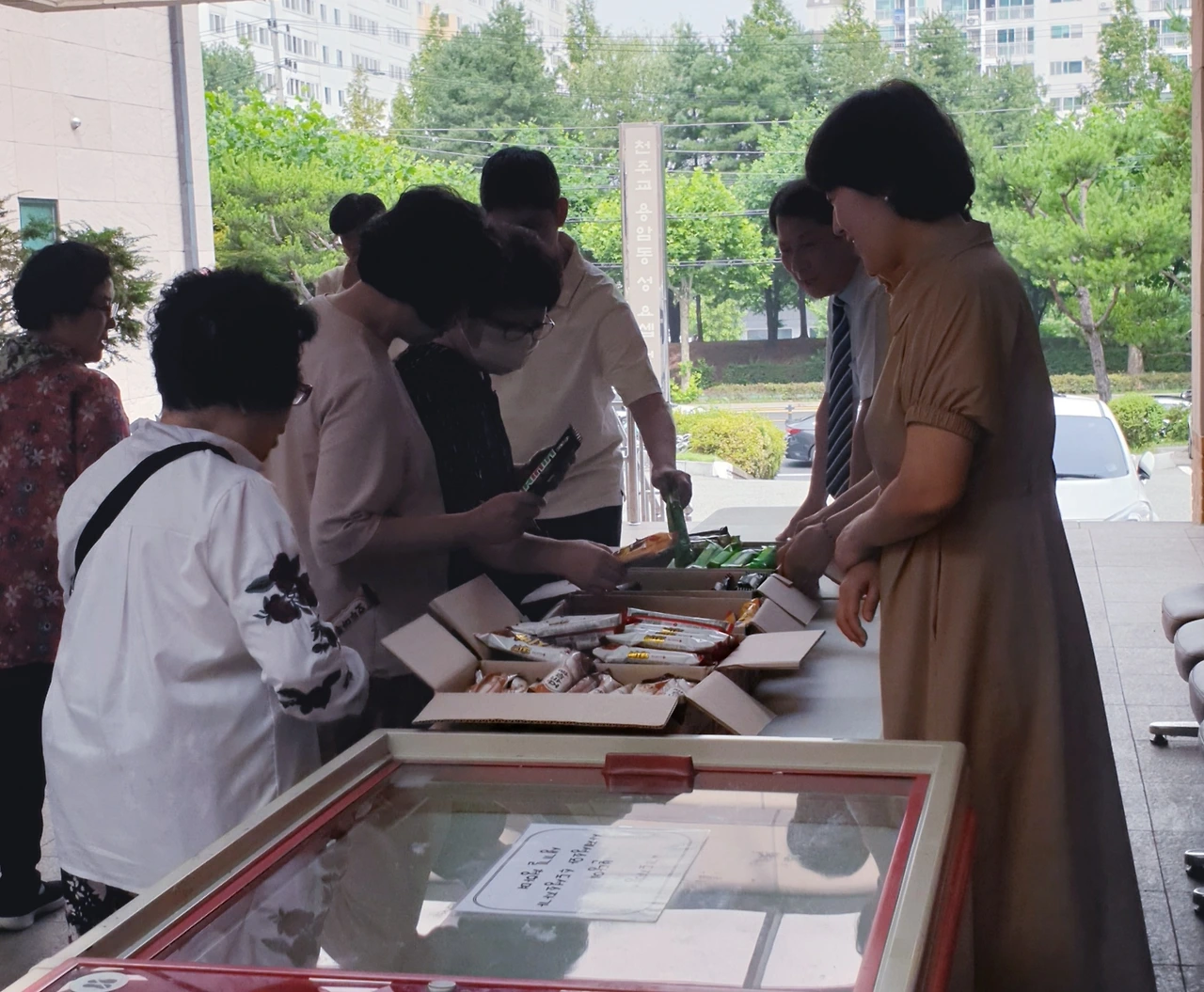 아침 7시에 가보니 이미 도라지무침과 반찬들을 해 놓고 아침 먹을 준비를 했다. 몇 가지 반찬을 준비해 30여 명의 봉사자들이 아침을 먹고 설거지를 마쳤다. 그러고 나서 부추전을 부치려고 준비했다. 부추전에는 밀가루에 부추와 양파, 호박, 그리고 홍고추가 들어간 반죽을 식용유를 넣고 부치니 아주 먹음직스러웠다. 8개의 가스버너에서 봉사자들이 연신 부추전을 부쳐댄다. 노릇노릇하게 먹음직스럽게 부치는 게 핵심인데 모두들 아주 잘했다. 두 차례 식사를 해야 한다. 8시 30분 미사와 10시 30분 미사 후에 오시는 분들이 거의 비슷하다. 8시 30분 미사 후에 미사온 신자들도 먹고 갈 수 있도록 하려면 서둘러야 한다. 다행히 미사 전에 잘 끝냈고 정리까지 잘했다. 안에서는 국수 육수와 잔치국수를 삶아서 한 그릇에 담는 준비 하느라 정신이 없다. 상들이 거의 차려지고 봉사자들이 영성체를 모시고 내려왔다. 오늘 아이스크림 나눔 첫날인데 봉사자이다. 아이스크림 나눔 봉사를 하러 1층 로비로 갔다. 물론 식사들을 다하고 가면 좋으련만 개인 사정들이 있어서 못 먹고 가는 분들이 생긴다. 그분들께 시원한 아이스크림을 드렸다. 이번엔 주임 신부님께서 매주 주일미사뿐만 아니라 평일미사에도 주신다고 하신다. 다들 아이스크림을 받아가며 더운 날씨에 시원하게 드시겠다며 좋아하셨다.