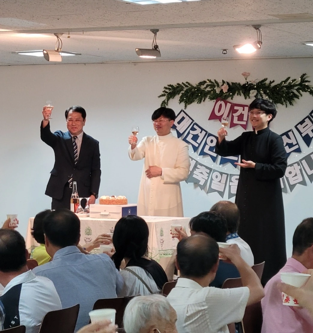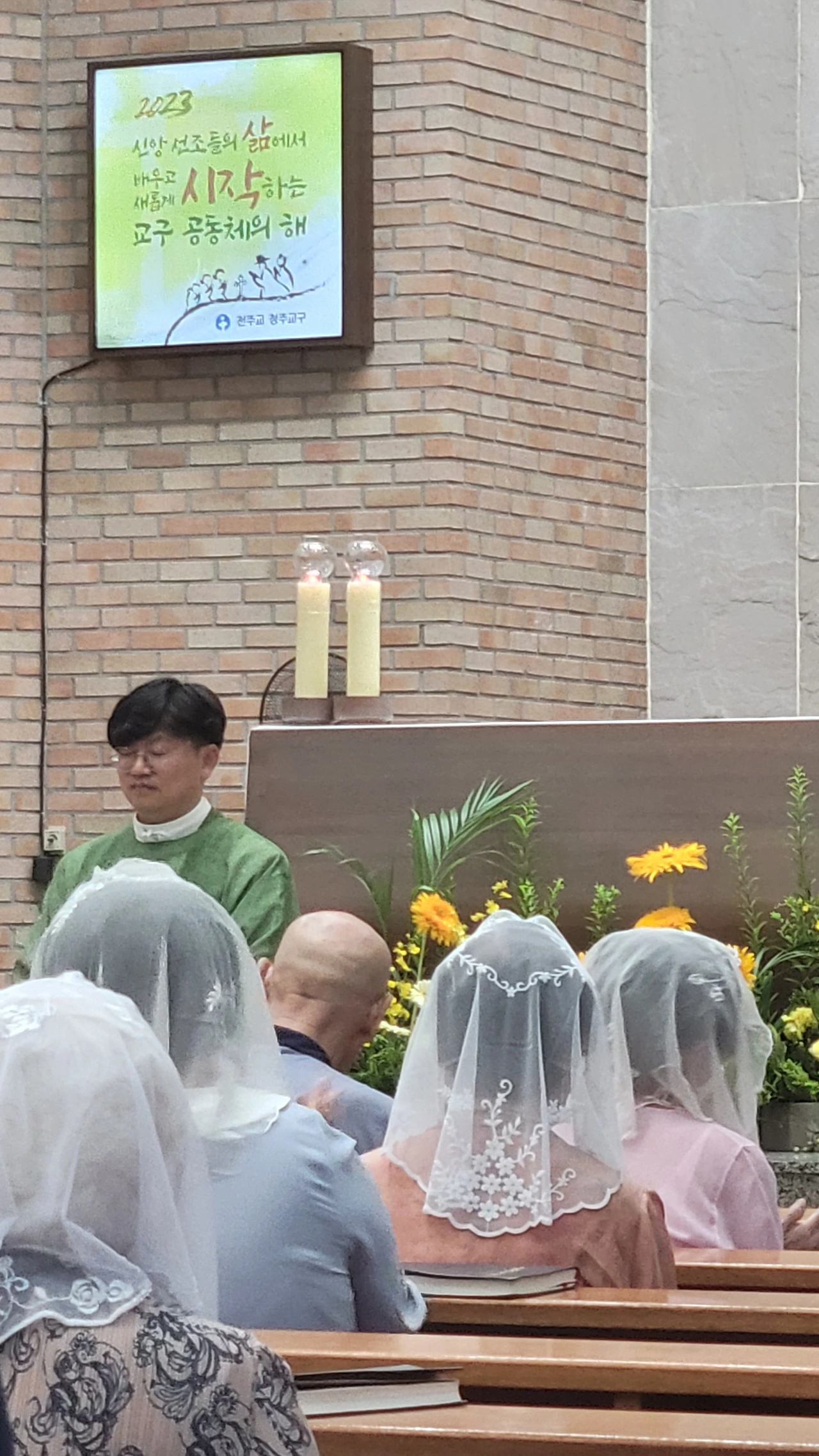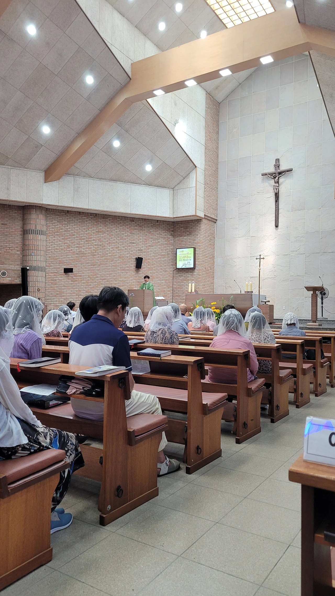 미사 끝에 신부님 축일 행사를 했다. 전례부장의 진행으로 주임 신부님을 앞으로 모셔서 화동들이 꽃바구니를 전해 드렸다. 그리고 한 달 동안 신자들이 바쳤던 기도 집계 내용은 전례부장이 낭독 후 기도의 내용을 담은 액자를 평협 회장님이 주임신부님께 드렸다. 신자들이 성심껏 봉헌한 축하금을 평협 총무님께서 전달했다. 이번 축하금은 성가대와 전례부의 가운을 하는 데 쓰일 예정이다. 신부님께서는 개인적인 축일 행사가 아니라 우리 모두의 잔칫날이 되길 바란다고 하셨다. 그리고 보답으로 7월 한 달 동안 아이스크림을 쏘겠다고 하시며 기도를 바쳐달라고 당부하셨다. 본당 성소자가 나오도록 합심해야 할 시기이기 때문이다. 이어 성가대 특송이 있었는데 박수와 함께 노래가 이어질 때 몇 분이 신부님께 꽃을 갖다 드렸다. 좀 새롭다는 생각이 들었고 보기도 좋았다. 미사를 마치고 예비자들과 내려오니 식당에서도 축하식이 진행되고 있었다. 케이크와 축하 노래와 함께 했고 모인 신자들이 박수를 보내며 즐거워했다. 반찬과 국수를 가져와 점심식사를 했다. 전도 수육도 국수도 모두 맛있었다. 특히 국수는 깊이 우려낸 육수의 맛과 계란 지단과 호박, 당근, 소고기의 고명이 얹어져서 아주 보기도 좋고 맛도 좋았다. 우리 본당의 국수는 언제 먹어도 맛을 보장한다. 정말 최고다. 모두들 음식이 맛있다고 행복해하신다.
