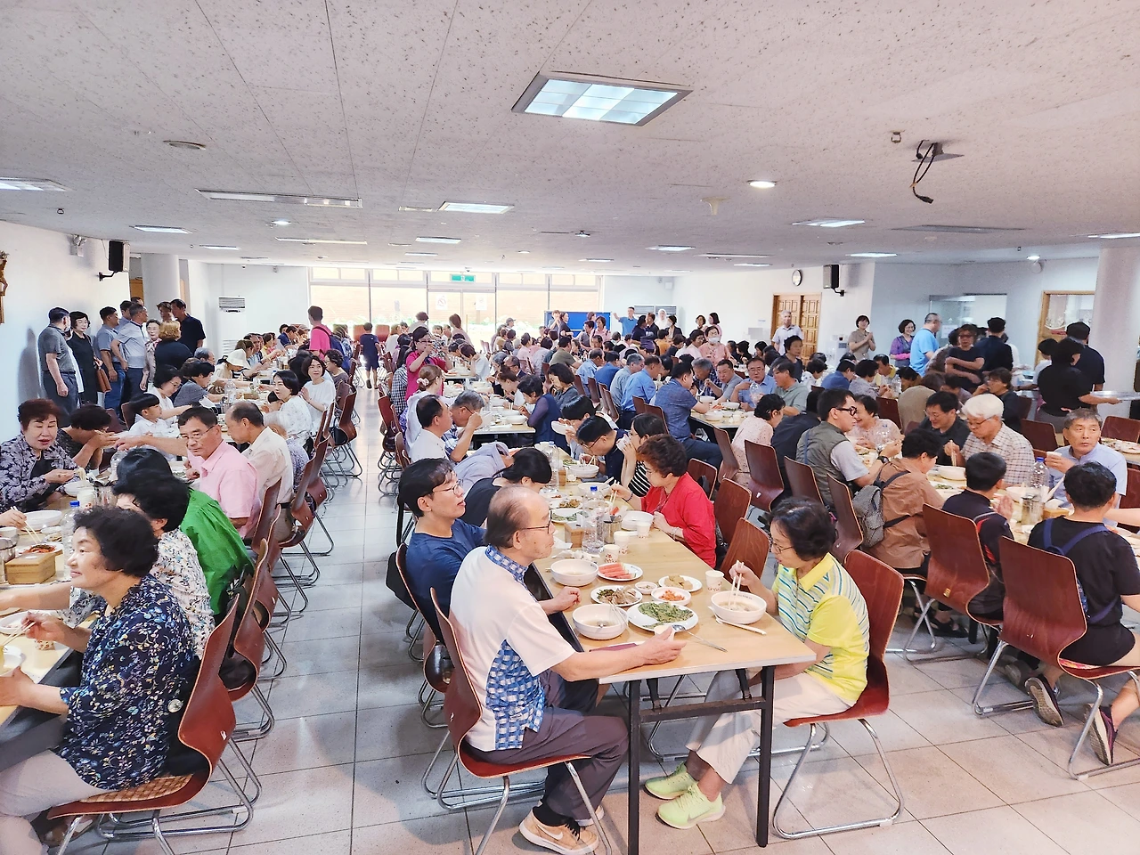 아주 맛있게 먹고서 이미 드시고 간 자리를 정리하였다. 부지런히 그릇들을 옮기고 치웠다. 사람들이 식사를 마치고 거의 자리에서 일어설 때 형제님들이 들어와 식탁과 의자들을 치우기 시작했다. 밤 팀의 레지오 단원들에게 배당이 되었다고 한다. 정말 일사천리로 순식간에 정리가 되었다. 주방 쪽도 아주 부지런히 움직였다. 대형 선풍기를 틀긴 했지만 많은 사람들이 땀을 뻘뻘 흘리면서 각자 맡은 일을 정리하고 설거지를 했다. 일을 정해주지 않아도 각자 눈치껏 알아서 모두들 즐겁게 일을 한다. 불평불만을 하는 사람은 거의 없다. 어느 정도 정리가 끝나자 남은 음식들을 봉지에 담아 오늘 봉사했던 분들이 가져가도록 성모 회장님이 배려해 주었다. 그리고 그동안 수고했던 분들을 위해 쫑파티도 한다고 했지만 몇 가지 반찬과 국수, 그리고 육수를 가지고 집으로 왔다. 오늘을 위해 많은 분들이 수고해 주셨다. 평협 회장님을 비롯 총무부장님, 그리고 성모회장님을 비롯 많은 봉사자들이 수고를 아끼지 않으셨다. 신자들은 맛있게 먹고 즐기면서 행복한 시간을 보냈다. 그리고 함께 행사를 치르면서 서로 협조하고 배려하는 모습이 보기 좋았다. 앞으로도 우리 본당은 이런 크고 작은 행사들을 통해 즐겁고 활기찬 공동체의 모습을 이어갈 것이다. 모두들 수고하셨습니다.^~^