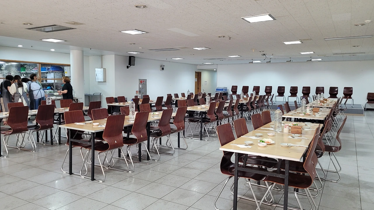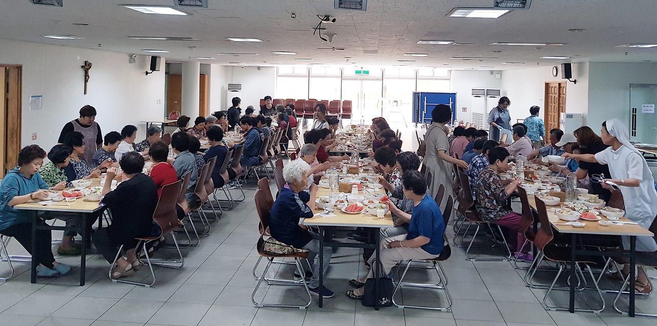 비누와 모기퇴치제 만들기 체험은 예상했던 시간보다 10분 빨리 끝나서 바로 식당 안에서 단체 사진을 찍었습니다. 이때도 안드레아 형제님이 다양한 포즈를 요구해 더 행복한 표정을 자아내게 되었습니다. 촬영을 마치고 식사 자리에 앉을 때 주임 신부님께서 오늘 수강한 참석자들과 봉사자들에게 강복을 주셨습니다. 그리고 성모회 봉사자들이 마련해 준 삼계탕과 김치, 떡, 수박등을 맛있게 먹었습니다. 닭이 제법 커서 한 마리를 못 드신 분들을 위해 성모회에서 포장해 가도록 배려해 주었고 어르신들이 무척 좋아하셨습니다. 우리도 앉아서 점심식사를 하였는데 오늘 봉사자 중에 행사부 차장님은 닭을 못 먹는다고 하더라고요. 에고~~ 삼계탕을 못 드시고 떡을 먹는 모습을 보니 조금 안타까웠어요. 이 맛있는 삼계탕을 못 먹는다니~ 닭도 잘 삶아지고 부드러워 먹기도 좋은데 아쉽지만 어쩔 수 없었습니다. 아쉽게 다 차려진 상을 사진에 담지 못했네요. 그래서 잘 차려진 상 사진은 없어 아쉽습니다.