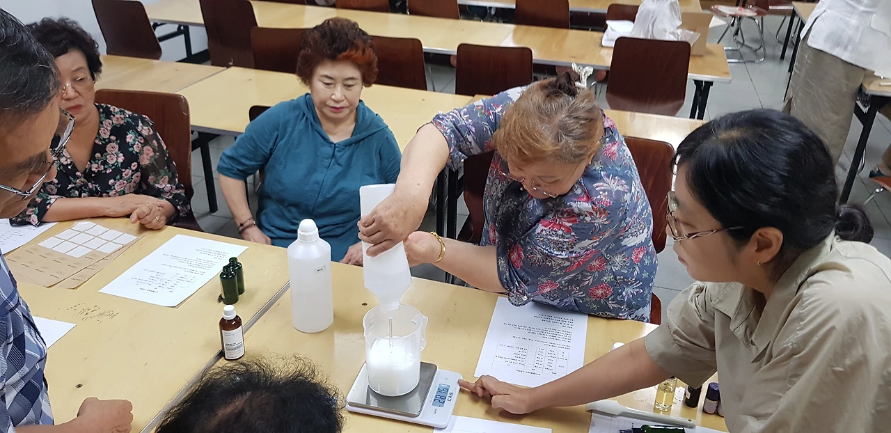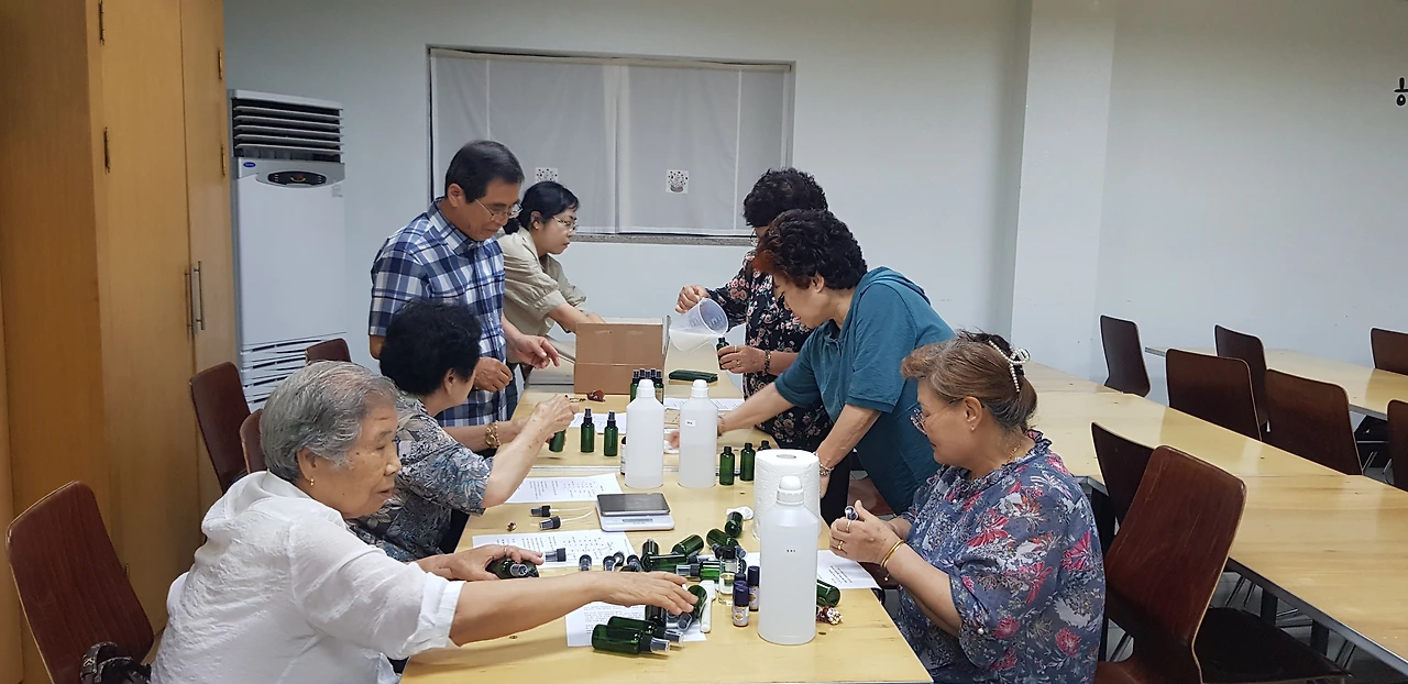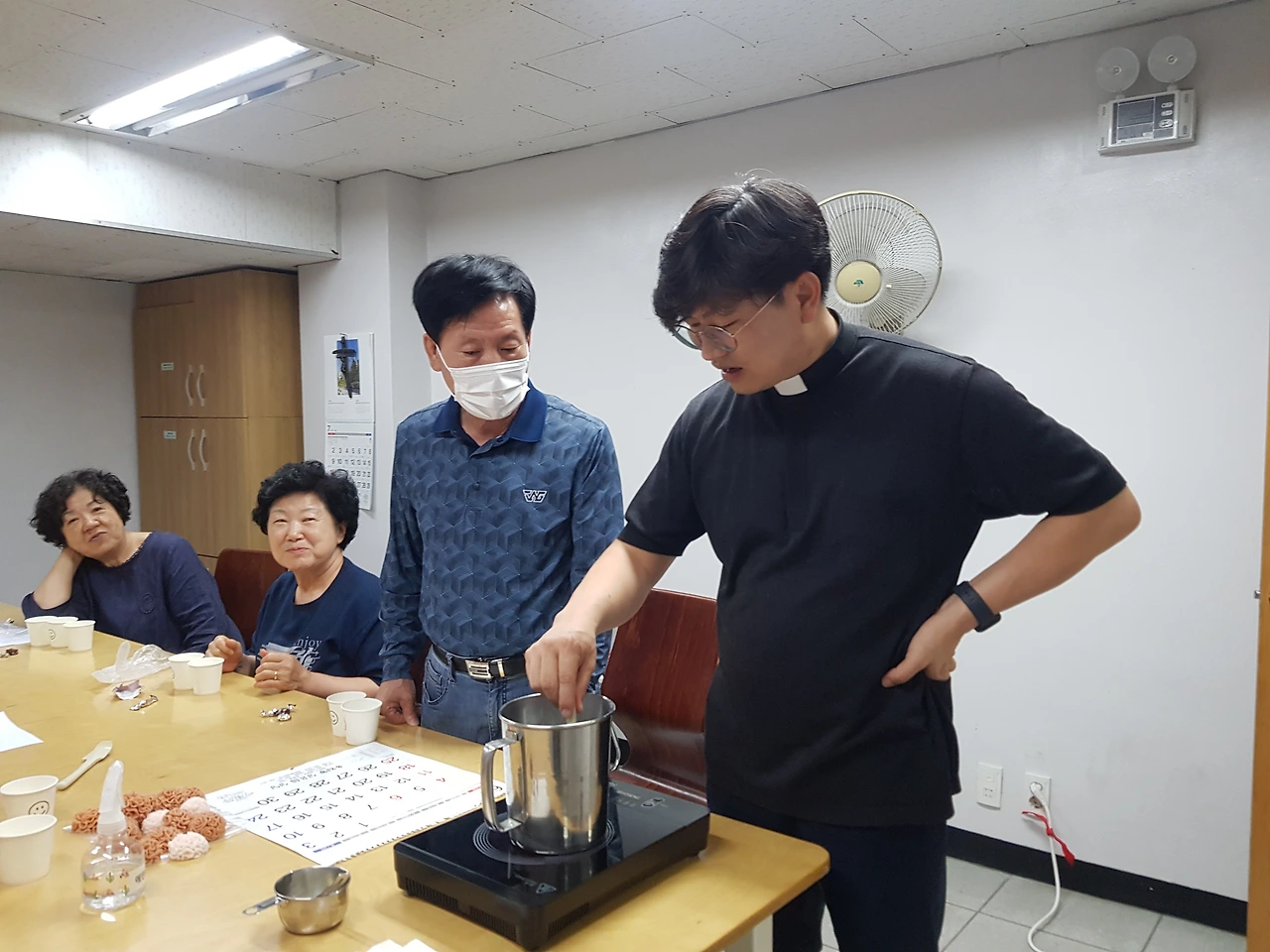 작년에 이어 올해도 6월에 본당 1차 실버특강이 있었고 2차 실버 특강이 7월 20일 오전 미사 후 지하 소성당에서 시작하였습니다. 성당에서는 신자들에게 무더운 7월 한 달 동안 미사 후 아이스크림을 주고 있는데 평소보다 미사가 조금 일찍 끝나서 여유 있게 먹을 수 있었습니다. 신청자들은 접수를 따로 하지 않고 입장 후 조금 기다려 10시 50분에 시작기도를 바쳤습니다. 본당 주임 신부님께서 오늘 실버특강과 관련 격려와 응원의 말씀을 해 주셨습니다. 그러고 나서 작년 실버특강 때 <묵주팔찌 만들기> 체험학습을 해 주었던 임희정 데레사 강사님이 <꽃 비누와 모기 퇴치제 만들기>의 전반적인 설명을 해 주었습니다. 두 가지 모두 그램수를 정확하게 재서 넣어야 하기 때문에 저울도 준비했답니다. 그래서 8명씩 봉사자를 따라 5반이 소회합실로 이동을 하였습니다. 그곳에서 따로 꽃 비누 만들기를 체험할 예정입니다. 모기 퇴치제 만들기는 소강당에서 3팀으로 나누어져 봉사자의 안내에 따라 체험하는 시간을 보낼 것입니다. 7월 13일 저녁에 미리오늘 봉사할 분들은 강사님 안내에 따라 본당 만남의 방에서 2시간 정도 실습을 거쳤습니다. 그래서 오늘 만들기 체험을 잘 안내해 줄 것입니다.