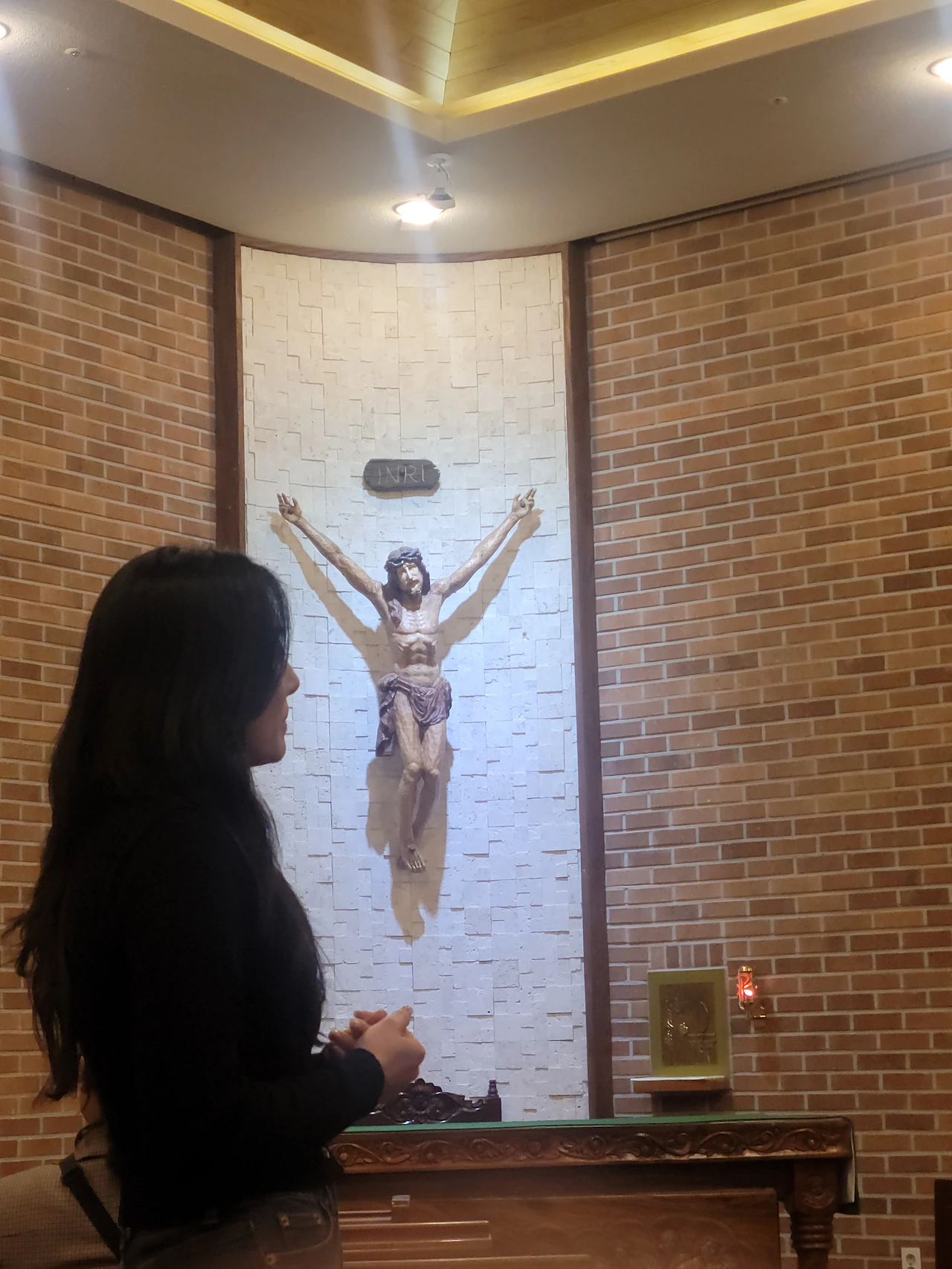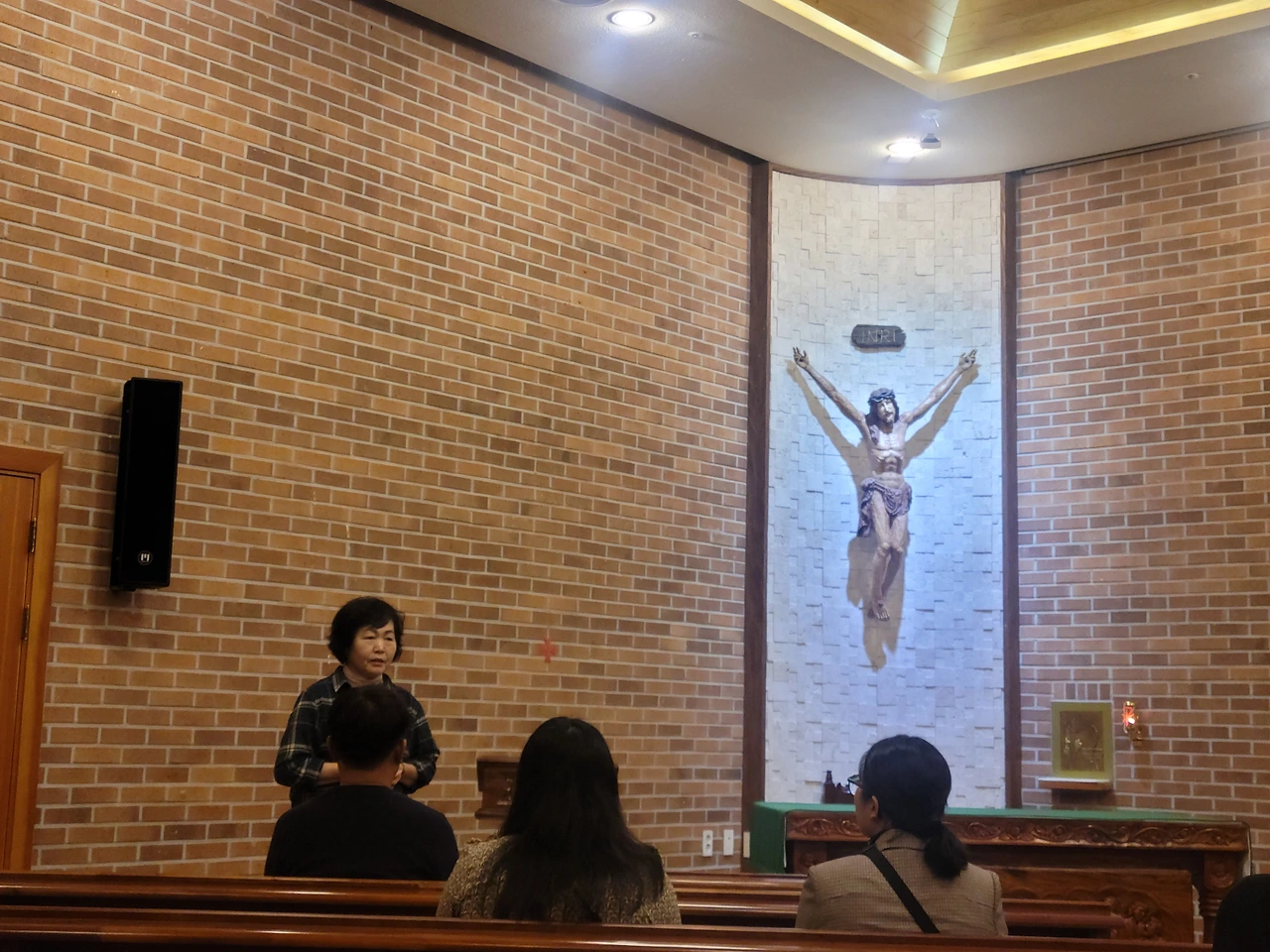 미사가 끝나고 점심식사를 위해 야외식탁이 마련된 곳으로 이동했다. 식사를 할 수 있도록 선불 결제를 했고 식사 티켓을 받아왔다. 그것을 함에 내고 접시를 갖고 음식을 담았다. 날씨가 그다지 춥지는 않았지만 음식은 좀 썰렁해 보였다. 그래도 우리 본당 식구들끼리 음식을 먹으며 이야기를 나누었다. 식사 후에 황석두 루카 성인상 앞에서 만나기로 했다. 먼저 몇 사람과 카페 쪽으로 이동했다. 모두들 차나 커피를 원해서 먹을 수 있나 사정을 알아보기 위해서였다. 평일에는 카페 봉사자가 없어 어렵다고 했다. 다행히 1시가 되니 카페 봉사자들이 도착했다. 커피와 차가 준비되는 동안 본당 신자들과 신부님, 수녀님까지 모두 자리에 앉았다. 우리는 40분의 여유 시간을 갖고 차와 커피를 마시며 담소를 나누었다. 이후에 카페 앞쪽에 마련된 '십자가의 길' 기도를 함께 바쳤다. 그러고 나서 현양비에 대한 설명을 신부님께서 해 주셨다. 이동하는 중에 형구돌을 봤는데 당시 신앙을 지키려고 참사를 당했던 선조들의 모습이 떠올라 마음이 아파왔다. 그리고 황석두 루카 성인의 묘역도 참배하였다. 본당 신부님께서 이곳 성지에서 각자 30분 정도 자유시간을 가져보라고 말씀하셨다. 특히 마음이 닿는 곳에 홀로 머물면서 자신을 들여다 보고, 성지에서의 마음가짐을 새롭게 해 보라고 당부하셨다.