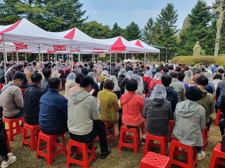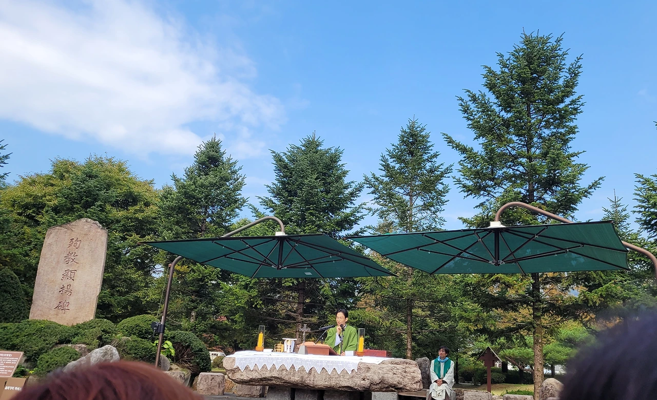 연풍성지에 도착하니 10시쯤 되었다. 우리는 먼저 황석두 루카 성인상 앞에서 단체 사진을 찍었다. 옆에서는 야외 미사를 준비하느라 분주하다. 잠시 후에 강서 본당 신자들이 목에 푸른색 손수건을 두르고 성당에 도착했다. 많은 분들이 오고 있었기에 시간적인 여유는 있었지만 앞줄과 두 번째 줄에 먼저 자리를 잡았다. 그 옆과 뒤로 다른 신자들이 속속 앉기 시작했다. 미사를 드릴 때 비가 올까 봐 살짝 불안했지만 이내 날은 괜찮아졌다. 성지 주임신부님께서도 500여 명 신자들과 야외미사를 해야 해서 무척이나 날씨에 민감하셨던 같다. 그 부담감을 11시 미사를 시작하면서 말씀하셨다. 강서 본당은 200여 명의 신자가 야외행사차 이곳을 방문했다고 한다. 혹시 아는 분들이 왔나 하고 둘러보았으나 눈에 띄진 않았다. OX를 퀴즈를 하는지 한켠에 팻말이 보였다. 세 분의 주례로 약 500여분의 신자들이 모여 한 시간 정도 미사를 드렸다. 연풍성지 신부님께서 강론 말씀과 연풍성지 소개와 안내 그리고 신자들에게 성지 후원을 부탁하셨다.