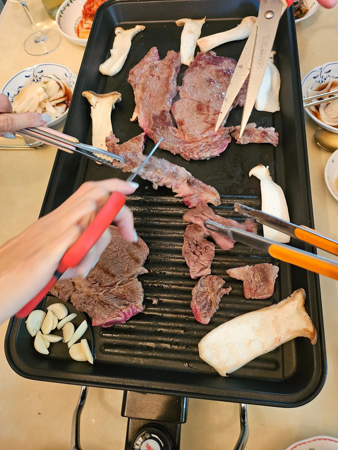 시금치는 한단에 만원인데 좀 시든 것을 6,000원씩 두 단을 샀다. 길이도 짧고 연해서 한단을 넣으면 부족할 것 같아서다. 그리고 꽈리고추에 멸치를 넣어 볶은 밑반찬을 만들었다. 가지가 저렴하고 싱싱해서 썰어 소금에 절였다가 양념을 해서 볶아 놓았다. 손주 둘은 최대한 빨리 갈 수 있는 시간에 오고 싶다고 전화해서 남편이 데려 왔다. 5시가 되어 다들 모이고 좀 늦게 올 수 있다는 아들과 때를 맞추려 6시에 식사를 하기로 했다. 새송이 버섯을 썰고 반찬을 놓았다. 1킬로씩 포장된 소고기를 개봉했다. 냉동된 고기가 아니고 생고기를 진공 포장해서 아이스 박스에 배달되었다. 잘게 썬 양파를 소스를 뿌려서 놓고 참기름에 소금을 넣어 기름장을 만들었다. 전부터 명절에는 선물로 들어온 소고기를 구워 먹었다. 이번엔 소고기를 두 딸이 구입했다. 생고기를 진공 포장해서 그런지 아주 연하니 맛있다. 다들 "역시 고기가 신선하게 좋으니 살살 녹네" 하면서 기름장에 그리고 양파 소스에 잘도 먹는다. 전 같으면 전 부치고 제사 음식을 하느라 시간을 보냈을 텐데 이제는 필요한 것들만 이렇게 하니 간편하니 좋다. 술은 와인으로 했다. 이*트에 가면 가격도 저렴하고 맛도 좋은 도스 코파스가 있어서 여럿이 먹는 식사에는 제격이다.