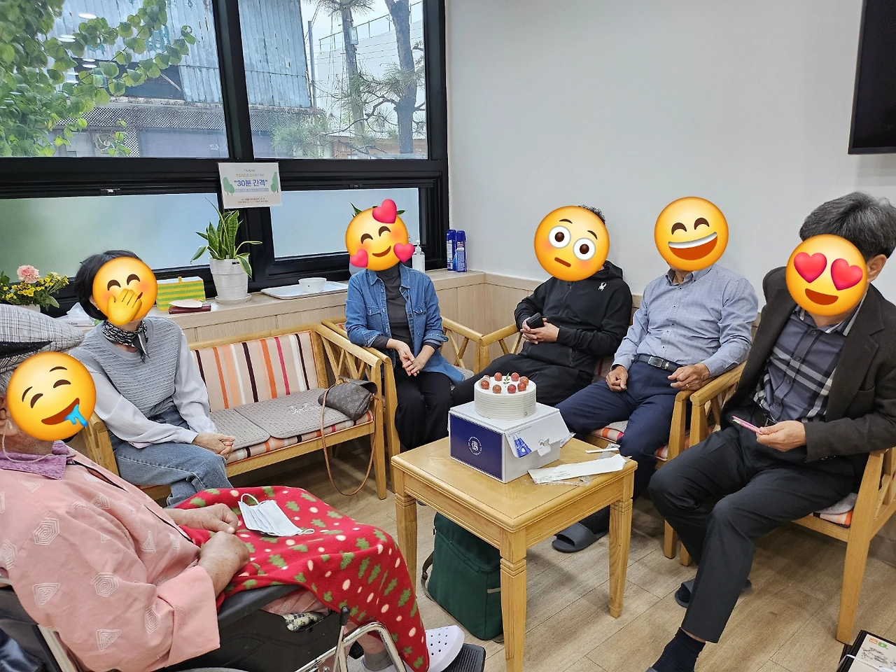 10월 22일이 아버님 생신이라 10월 19일 토요일 오전에 요양원을 방문했다. 아버님은 기분이 좋지 않으셨다. 생활해 보니 여러 가지로 불편하신 게 당연 있으실 게다. 아버님은 '이곳에서 할 수 있는 게 없다'면서 힘들어하셨다. 그동안 치매 약도 꾸준히 드시고 치료를 받으면서 몸상태가 좋아지신 듯했다. 밖에도 마음대로 나갈 수 없고 자유롭게 하는 게 없다 보니 당연히 그러실 거라 생각했다. 그렇다고 아버님이 예전처럼 건강하게 다니실 수 있지도 않은데, 요양원에 계신 게 좀 싫으신 듯했다. 다시 자식들을 만나니 그런 마음을 표현하고 싶으셨나 보다. 그래도 얼굴은 좋아지신 듯했다. 작은 탁자 위에 가져간 반찬과 미역국 과일을 올려놓고 요양 보호사에게 부탁한 국그릇에 가져온 미역국을 담았다. 천천히 반찬과 국을 드시면서 좋아하셨다. 많이 드시진 않았지만 그래도 그렇게 드셨으니 다행이다. 케이크에 촛불을 붙이고 생신 노래를 불러 드렸다. 촛불을 세 번에 불어 끄시며 아직 이 정도는 충분히 할 수 있다고 힘주어 말하셨다. 포도가 장식된 사랑스러운 케이크를 한 조각 잘라 드렸다. 다음 면회할 분이 계시다고 해서 우리는 서둘러 가져온 방울증편 4박스와 귤 2박스를 관계자분들께 드렸다. 요양원에 계신 분들이 나눠 드셨으면 해서 준비해 온 것이다. 시아버님은 아직 마음을 내려놓지 못하신 것 같다. 요양원 밖 생활이 많이 그리우신 듯했다.