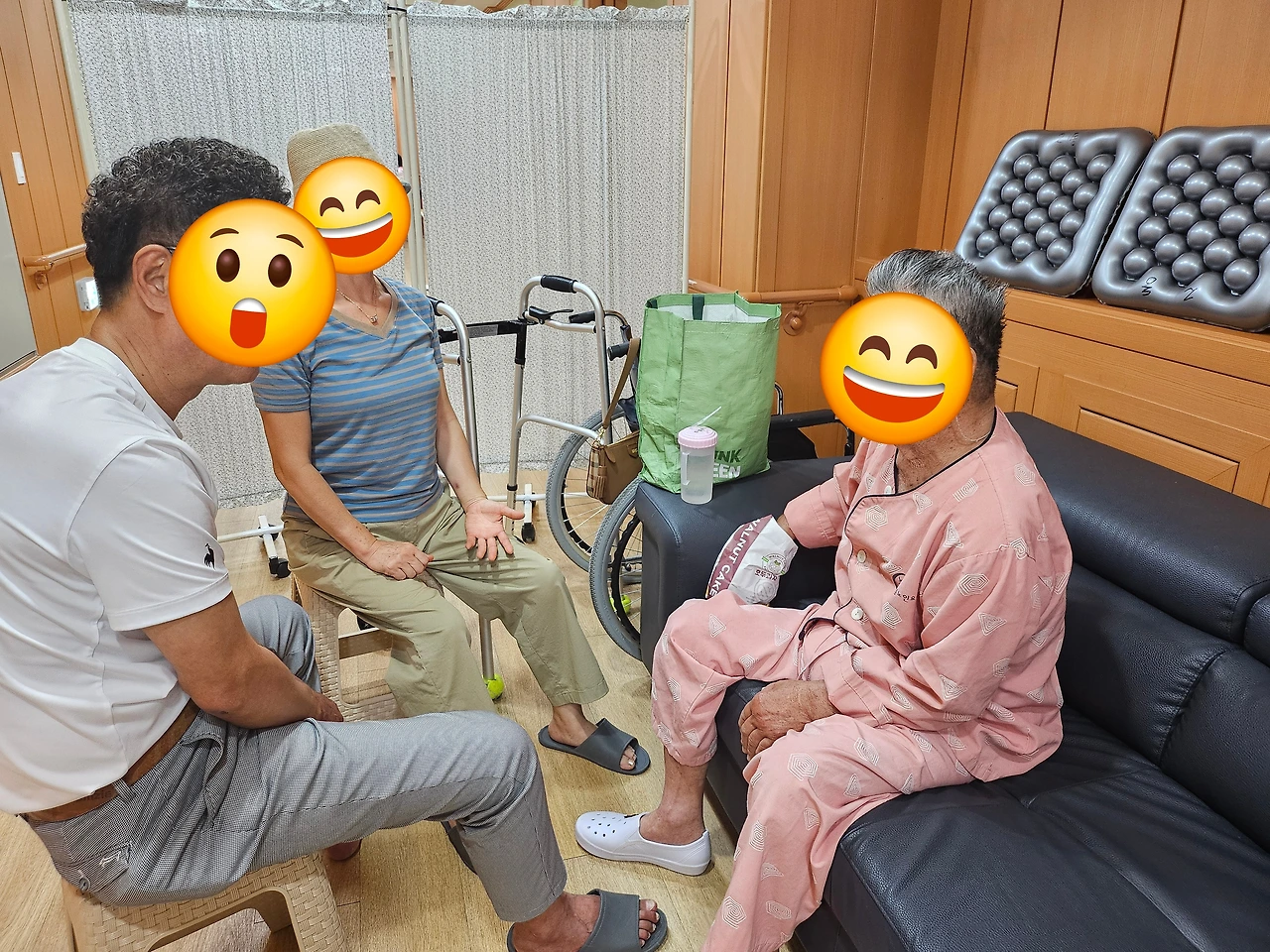 "내가 너네를 어떻게 키웠는지 아느냐?"며 올해 예순살인 막내아들의 빰까지 때렸다고 한다. 그 이야기를 들으니 당황스럽고 마음이 아팠다. '아직 더 혼자 생활하게 해 드렸어야 했나?' ' 전혀 요양원에 올 상황은 아니었다고 생각하셨나?' 별 생각이 다 들었다. 우리는 식사 후에 요양원에 계신 아버님께 가 보기로 했다. 다 모였을 때 같이 가보고 싶었다. 추석명절도 얼마 남지 않았으니 가서 혼날 때 혼나더라도 가봐야 하지 않겠는가? 우리는 각오하고 요양원에 들어섰다. 사무실 직원에게 아버님의 존함을 알리고 자식들이 면회를 왔다고 신청했다. 방으로 가니 누워 계셔서 "아버님~!"하고 불렀다. 그랬더니 돌아 누우시면서 우리를 향해 환하게 웃으셨다. 그러면서 어떻게 왔느냐며 반가워하셨다. 우리는 아버님의 모습을 보고 의외라서 서로 얼굴을 쳐다봤다. 요양 보호사가 다른 분이 방에 계시니 방해되지 않게 복도에 의자에 앉아 이야기를 나누라고 했다. 우리는 복도에 자리를 잡고 앉았다. "아버님 갑자기 요양원으로 오셔서 서운하셨죠? 정말 죄송합니다." 하고 말씀드렸다. 아버님은 "아냐, 여기 좋아. 밥도 주지, 병원도 데려다 주지, 그리고 요양사들이 딸처럼 잘해 주는데 뭘~"이라며 좋아하셨다.