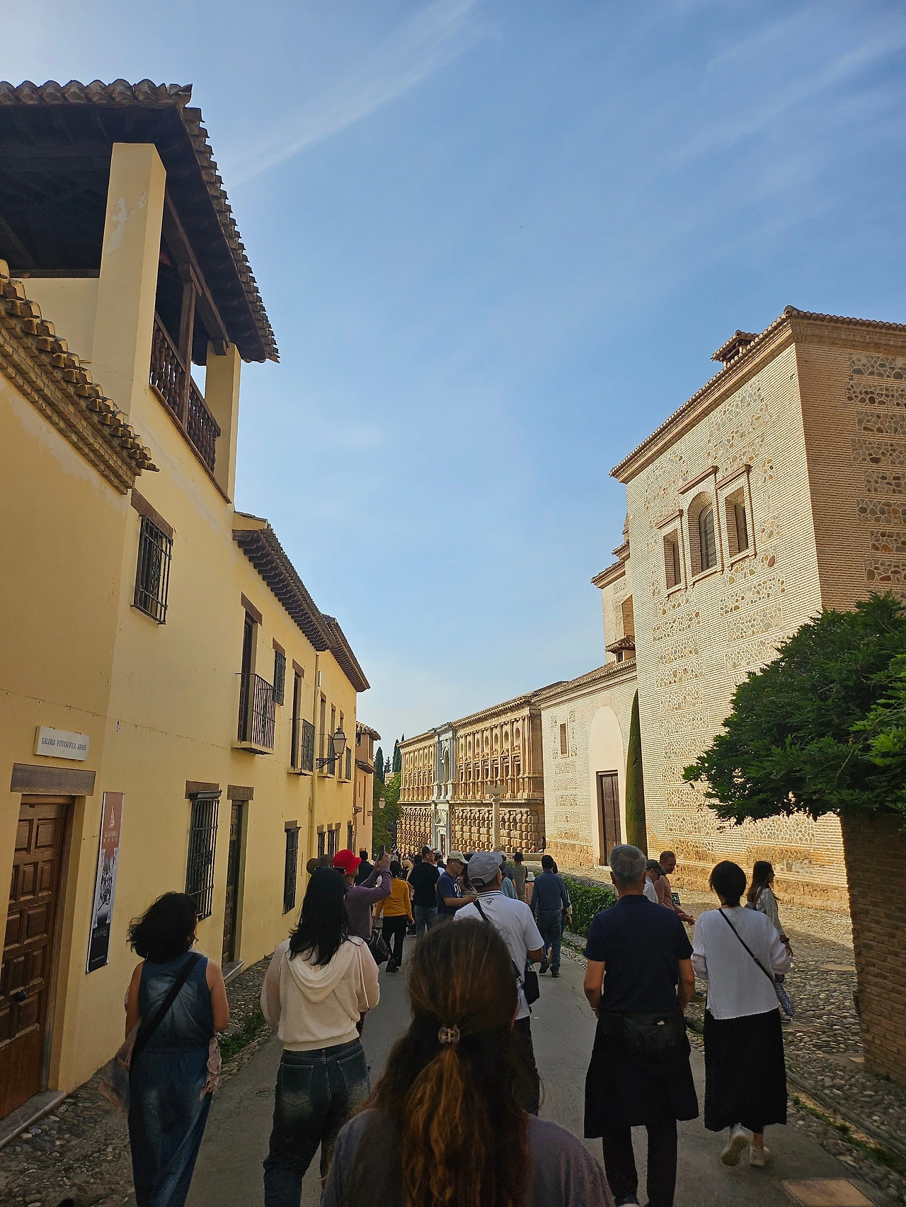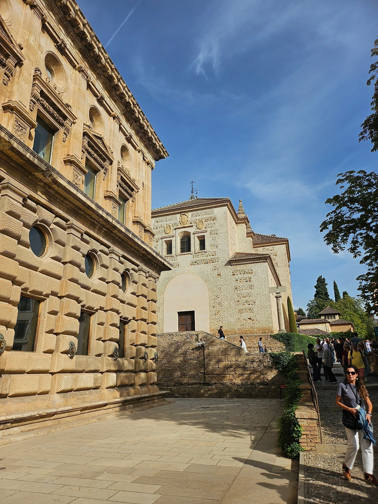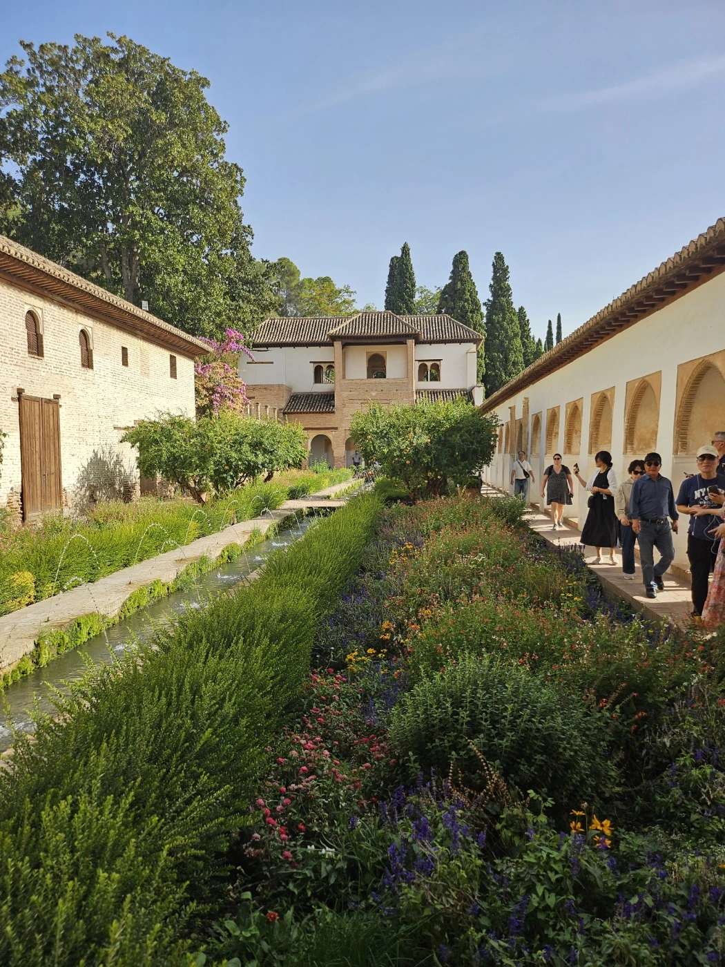 카를로스 5세 궁전은 르네상스 양식으로 지은 별궁이다. 알람브라의 이슬람 양식과는 대비도는 유렵식 대리석 원형 건물로, 안달루시아 예술의 시대적 변화를 느낄 수 있다. 내부에는 알람브라 박물관이 있어, 역사와 유물을 관람할 수 있다. 하지만 대부분 문화유산으로 지정돼 있고 문화재 훼손 문제로 유료이거나 외향만 볼 있으며 내부 관람하기는 어렵다. 헤네랄리페(Generalife) 정원은 알람브라 궁전 옆 언덕에 자리하며, 왕의 여름 별궁이자 휴식처로 사용된 곳이다. '천국의 정원'이라는 뜻으로 가우디 이전의 스페인에서 물과 빛, 자연을 이용한 공간 미학의 극치로 평가받는다. 흐르는 물, 시냇물, 분수, 꽃, 나무들이 조화롭게 배치되어 있으며, 모든 공간이 소리와 향기로 가득한 정원이다. 긴 수로 양쪽으로 꽃과 나무가 늘어서 대표적인 공간으로 물이 만드는 반사와 분수의 리듬이 '이슬람식 낙원'을 표현하는 것이라고 한다. 이곳은 사진 명소 1순위로 꼽힌다. 왕비의 정원은 향기로운 꽃과 분수가 어우러진 낭만적인 분위기를 자아낸다. 우리는 아름다운 정원에서 환하게 웃으며 곳곳에서 사진을 찍었다. 가이드는 제일 중요한 곳은 전망대라면서 알람브라와 그라나다 시내, 멀리 산맥이 보이는 곳으로 우리를 데려갔다. 아름다운 정원에서 나무와 물 그리고 꽃들과 보낸 행복한 시간이었다. 한마디로 헤네랄리페 정원은 낙원의 숨결이었다.