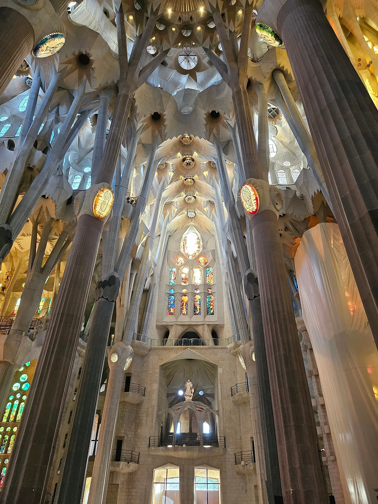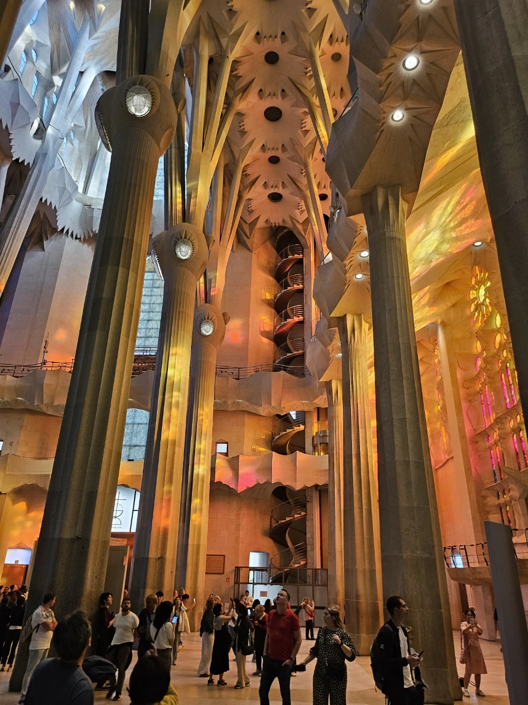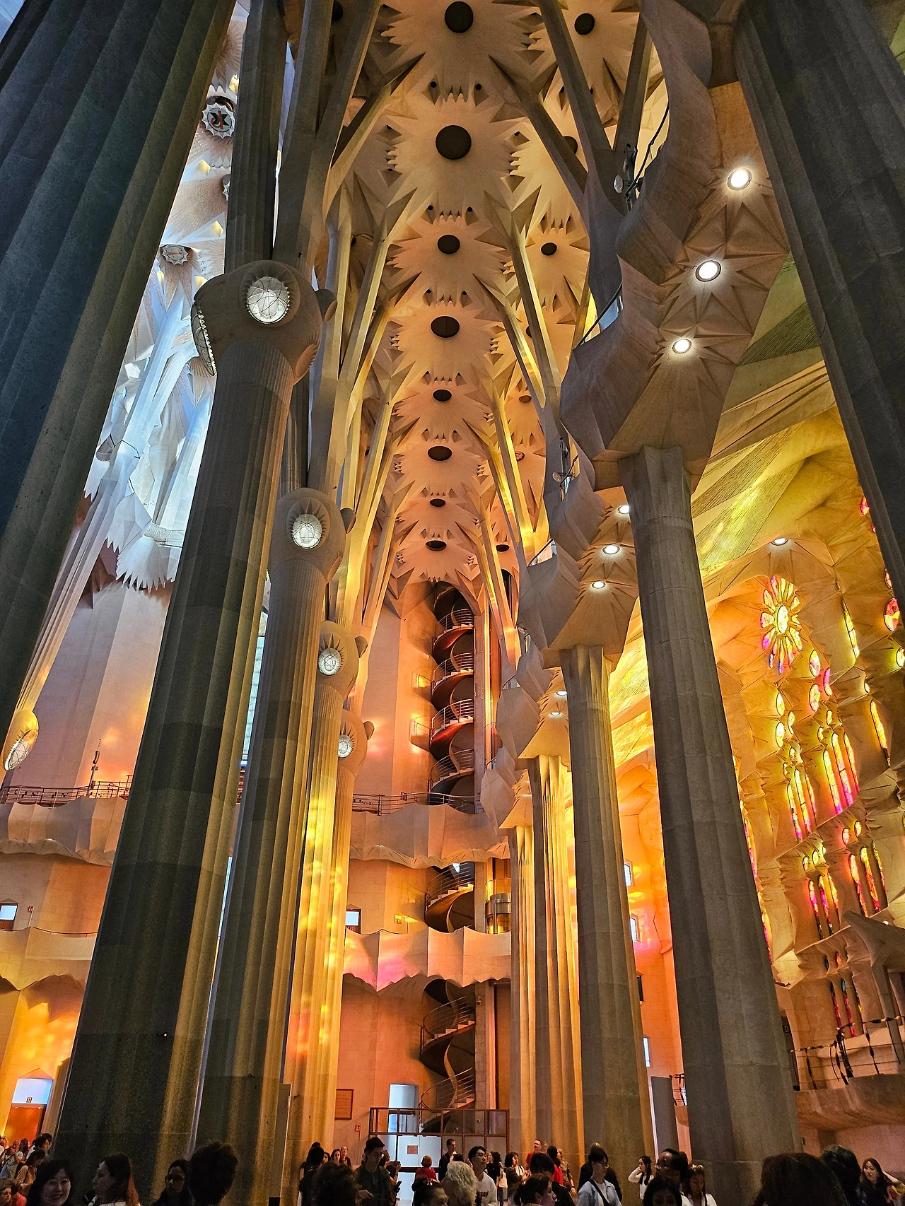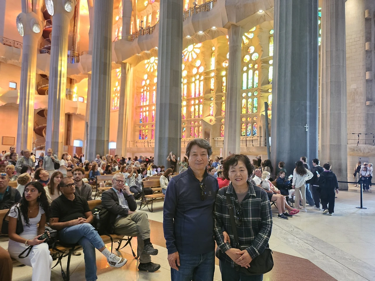 우리는 가우디의 또 다른 멋진 작품인 성가족 성당을 보기 위해 출발했다. 스페인 바르셀로나 가우디 성가족 성당(Sagrada Familia)은 세계에서 가장 독창적이고 상징적인 성당 중 하나이다. 미완성의 성당은 건축가 가우디의 서거 100주년을 기념으로 2026년에 최종 완공을 앞두고 있다. 주요 외관 3개의 예수의 생애를 담은 동쪽의 탄생 피사드는 푸른색과 초록색 계열로 아침의 평화와 생명을 상징한다. 서쪽의 수난 피사드는 붉은색과 주황색 계열로 저녁의 희생과 사랑을 상징한다. 그리고 영광의 파사드가 있다. 우리는 큐알코드를 찍고 개별 입장을 하였다. 여기저기 다니면서 시진을 찍느라 정신이 없었다. 높은 건물에 색감의 환상적인 조합은 입이 쩍 벌어진다. 많은 사람들을 헤집고 다니면서 셔터를 눌러댔다. 내부 스테인드글라스 빛의 변화에 따라 오후 3시~5시에 더욱 멋진 모습이 된다고 하여 그 시간에 맞추어 입장을 하도록 했나 보다. 제단 위에는 공중에 떠있는 듯한 그리스도 십자가가 있다. 그 아래에는 가우디의 무덤이 있고 천정은 별처럼 빛나는 돌무늬가 새겨져 있다. 성당을 설계한 가우디는 생전 마지막 15년을 현장에서 지내고 살았다고 한다. 옆에 가우디 박물관에는 성당의 모형, 설계도, 미완성 작품 등이 전시되어 그의 천재성을 보여주고 있다. 성가족 성당은 단순히 건물이 아니라 자연, 수학, 빛, 신앙이 어우러진 하느님께 바치는 예술로 평가받고 있다. 주변을 더 둘러보고 가이드가 반대 방향으로 나오면 된다고 알려 주어 그곳으로 나갔다. 볼거리들이 상당히 많았지만 화장실이 급해서 나왔고 바깥쪽에서도 성가족 성당을 찍는 분들이 무척이나 많았다.