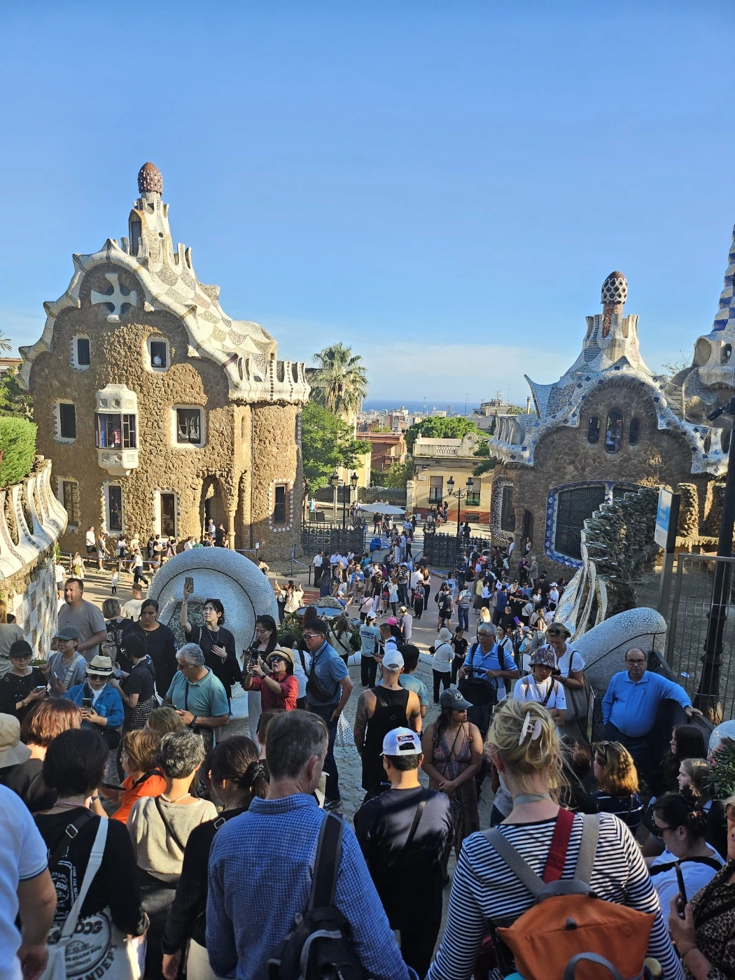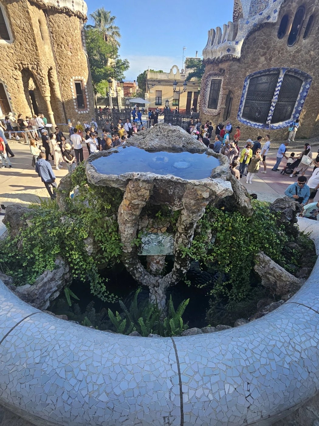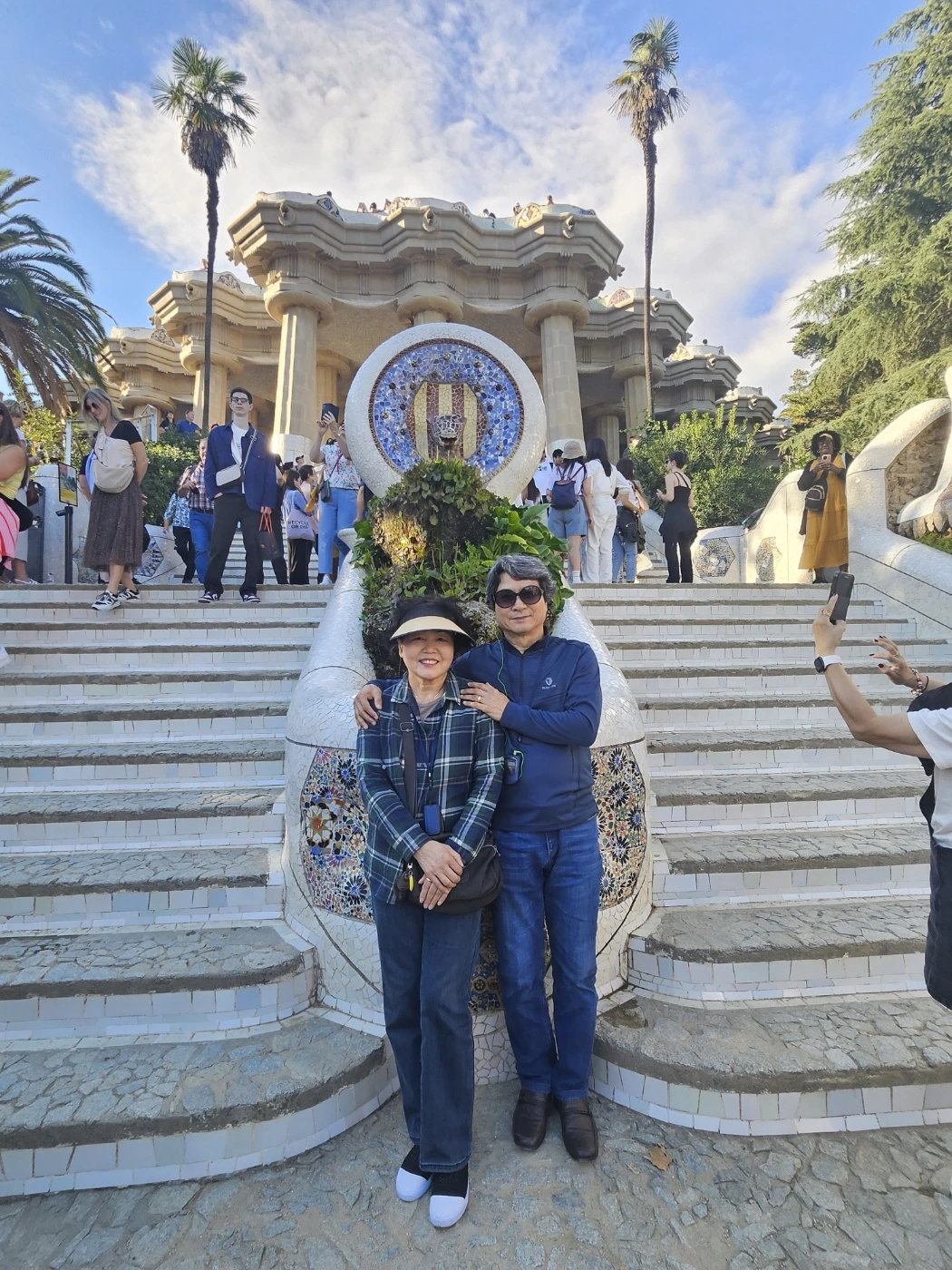 밤새 비행기를 타고 8시간의 시차를 극복하며 10월 10일 오후 1시 30분에 간 곳은 스페인 구엘 공원이다. 이번에 전국각지에서 모인 31명의 여행객과 한국가이드 1명 현지 가이드 1명 그리고 로컬 가이드까지 34명이 움직였다. 아직 시차도 극복하지 못한 상태였기 때문에 비몽사몽으로 가이드의 설명을 듣고 이동했다. 그래도 구엘 공원은 10여 년 전에 다녀간 곳이고 유명한 가우디가 설계하고 이미 많이 알려진 장소였기 때문에 편안한 마음으로 보게 되었다. 구엘 공원(Park Guell)은 1984년 유네스코 세계 유산에 등재되었고, 가우디의 상상력과 자연미가 완벽하게 결합된 동화 같은 공원이다. 구엘 공원은 '고급 주택단지 프로젝트'로 시작되었다고 한다. 구엘이 자연과 예술이 어우러진 이상적인 마을을 꿈꾸며 설계를 맡겼으나 분양이 잘 되지 않았다. 주택은 단 두채만 지어지고 부대시설 공사로만 마무리가 된 상태로 공원이 되었다. 건물이나 시설이 자연을 그대로 형상화했다는 것이 상당히 놀라웠다. 커다란 타원형 광장을 파도모양의 긴 벤치가 감싸고 있다. 모두 깨진 타일 조각을 이어 만든 '트렌카디스'기법으로 장식되었다. 이날은 날씨가 좋아 탁 트인 공간에서 바르셀로나 시내 전경과 지중해 풍경을 내려다볼 수 있어 기분이 좋았다. 내려오면서 구엘공원의 시그니처 도마뱀 앞에서 사진을 찍고 양쪽 건물(관리소, 기념품점)을 두고도 사진을 찍었다. 광장을 떠받치고 있는 86개의 거대한 돌기둥이 무척 신기했다. 당시에 이런 상상력으로 건축설계를 하고 후세에 위대한 선물로 남겨준 가우디의 천재성에 놀라움을 금치 못했다.