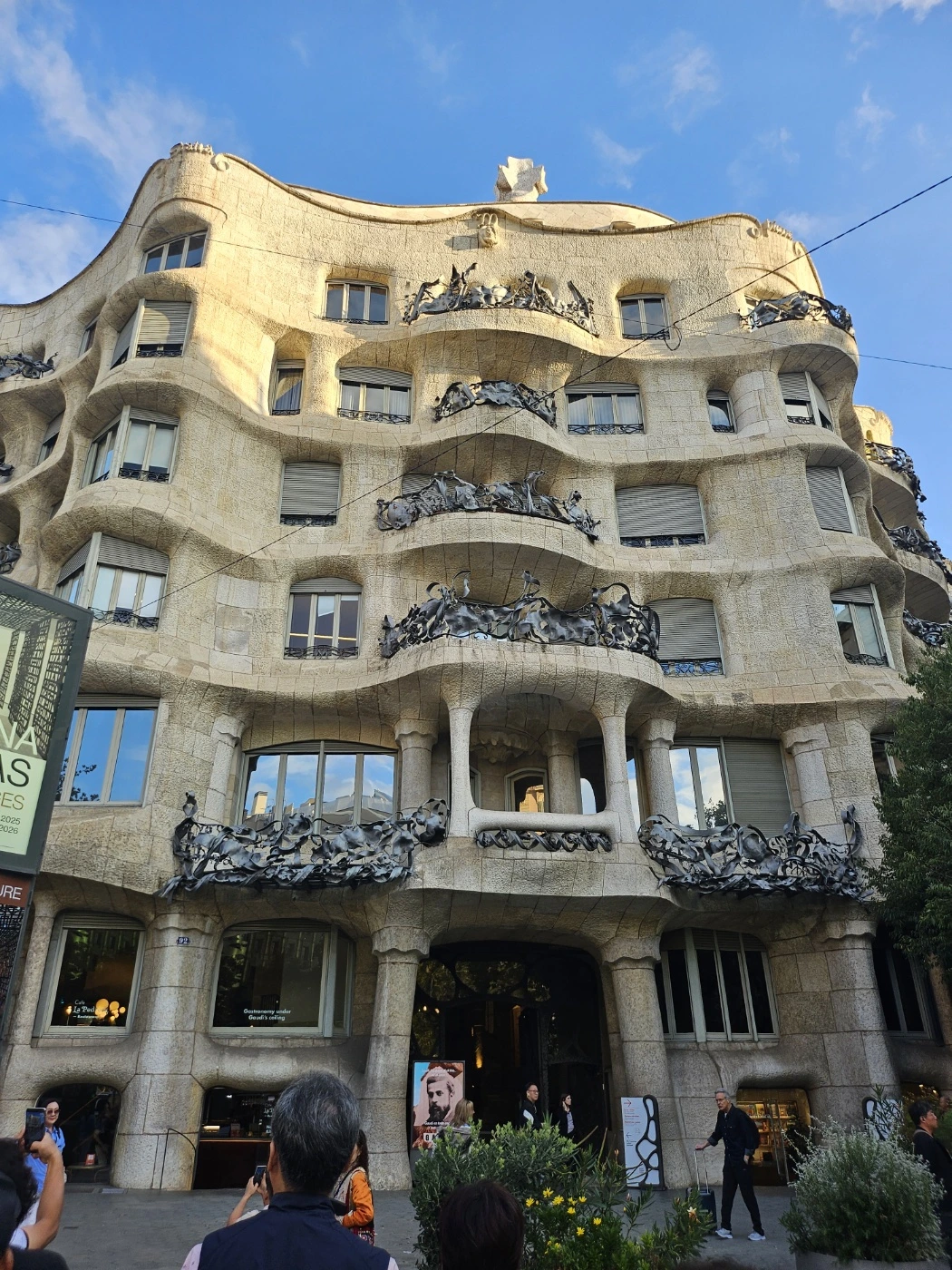 전날 까사밀라 건물을 보려고 했으나 시간이 여의치 않아 오전에 발렌시아 거리에 있는 그곳으로 갔다. 가우디의 까사밀라(Casa Mila)는 바르셀로나의 대표적인 건물 중 하나로 안토니 가우디의 천재적인 건축 감각을 잘 모여주는 작품이다. 건축 연도는 1906년~1912년으로 스페인어로 라 페드레라 '돌채석장'이라는 별칭을 갖고 있다. 1984년 유네스코문화유산에 등재되었다. 건물의 특징은 파도처럼 유기적이고 부드러운 곡선으로 이루어져 있다. 석회암으로 덮인 외벽이 마치 살아있는 생물처럼 느껴졌다. 게다가 창문, 발코니, 기둥, 계단 모두 자연의 곡선과 형태를 모방했다고 한다. 건물 전체가 하나의 자연과 생명체를 상징한다고 히니 가우디는 상당히 자연친화적이다. 물결 모양의 외벽은 바다, 옥상 조형물은 하늘과 자유, 내부구조는 자연의 질서와 조화를 표현한다. 당시 이 건물에 대해 '괴상하다'는 비난을 받았지만 지금은 세계적인 건축 예술의 걸작으로 평가받고 있다. 우리는 가이드의 설명을 듣고 건물이 잘 나오도록 사진을 찍고 버스 있는 곳으로 걸어갔다. 그리고 콜럼버스 동상과 람블란스 거리로 향했다. 콜럼버스 동상 뒤쪽에 모여 인원체크를 한 후에 몇 가지 주의사항을 숙지하고 우리는 흩어졌다. 자유시간인 셈이다.