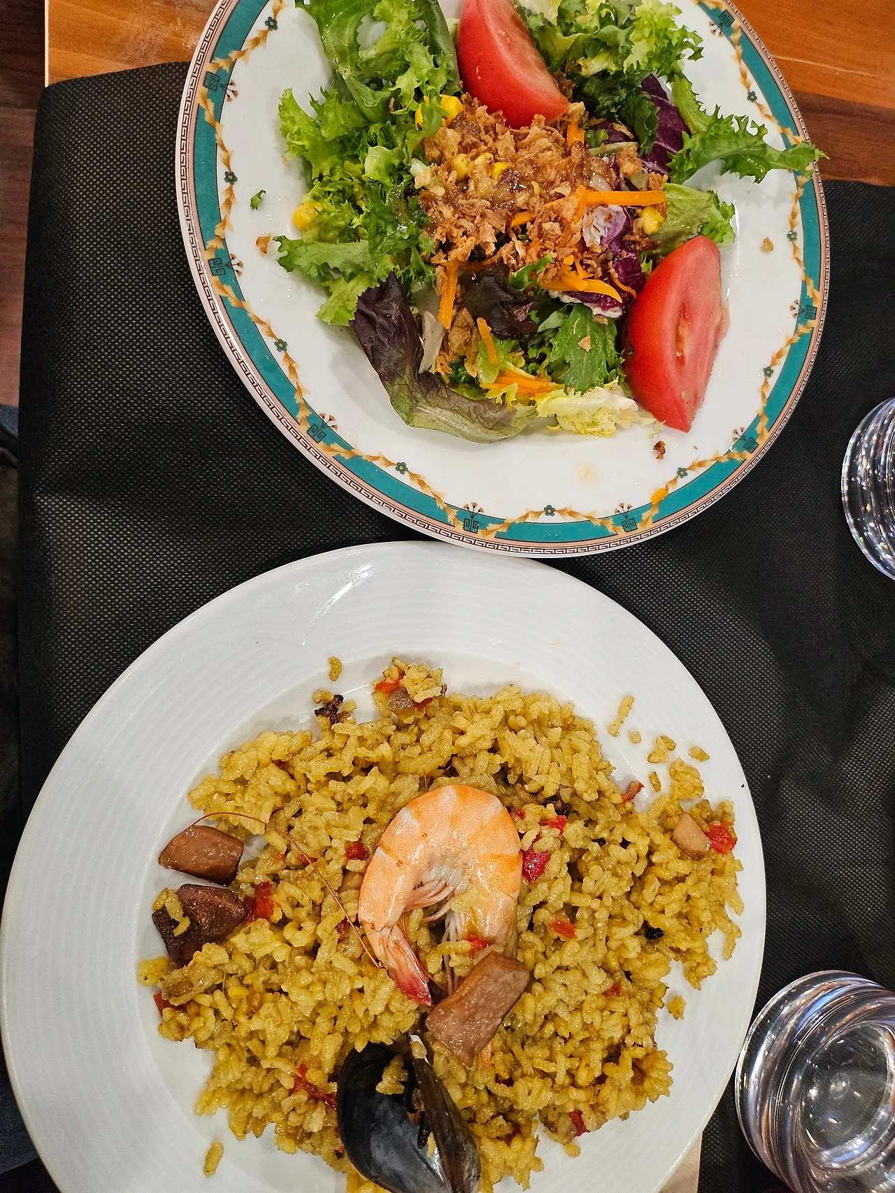 일정을 마치고 저녁으로 볶음밥 빠에야를 먹었다. 빠에야는 스페인을 대표하는 전통요리로, 주로 쌀을 주재료로 하고 다양한 재료를 넣어 넓고 얕은 팬에서 조리한다. 원래는 발렌시아 지역에서 시작된 요리이며, 농민들이 들판에서 간편하게 조리해 먹던 음식이 발전한 것이라고 한다. 넓고 얕은 팬에다 쌀과 육수, 올리브유, 사프란 등을 넣고 불에서 한 번에 요리한다. 재료를 너무 많이 섞지 않고, 바닥에 약간 눌어붙게 해서 고소한 소카리트를 만드는 것이다. 소카리트란 팬 바닥에 생기는 살짝 탄 듯 쌀로, 스페인 사람들은 이 부분을 가장 맛있다고 여긴다. 해산물 빠에야라면 신선한 새우, 홍합, 조개가 들어 있는지 확인하고, 고기 빠에야라면 닭과 토끼고기, 혹은 소시지가 들어 있는지 확인하면 된다. 거기에 레몬 조각을 뿌려 먹으면 훨씬 맛있게 먹을 수 있다. 가벼운 샐러드나 스페인 와인과 함께 먹으면 더 좋다. 빠에야는 기름과 양념이 강해 천천히 맛을 음미하며 먹는 것이 좋다. 그날 먹었던 빠에야는 기대에 미치지 못했다. 해산물이 더 풍부하게 들어갔더라면 하는 아쉬움과 야채와 토마토까지 있었으나 뭔가 2% 부족한 맛이었다. 예전에 맛있게 먹었던 빠에야 그 맛이 그리웠다.