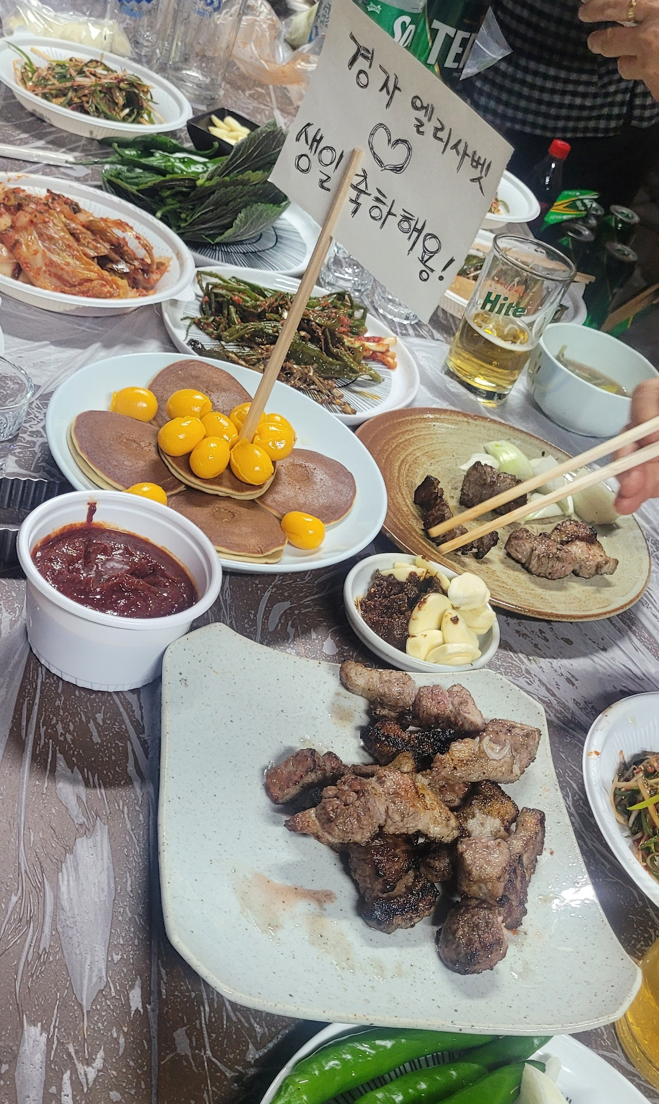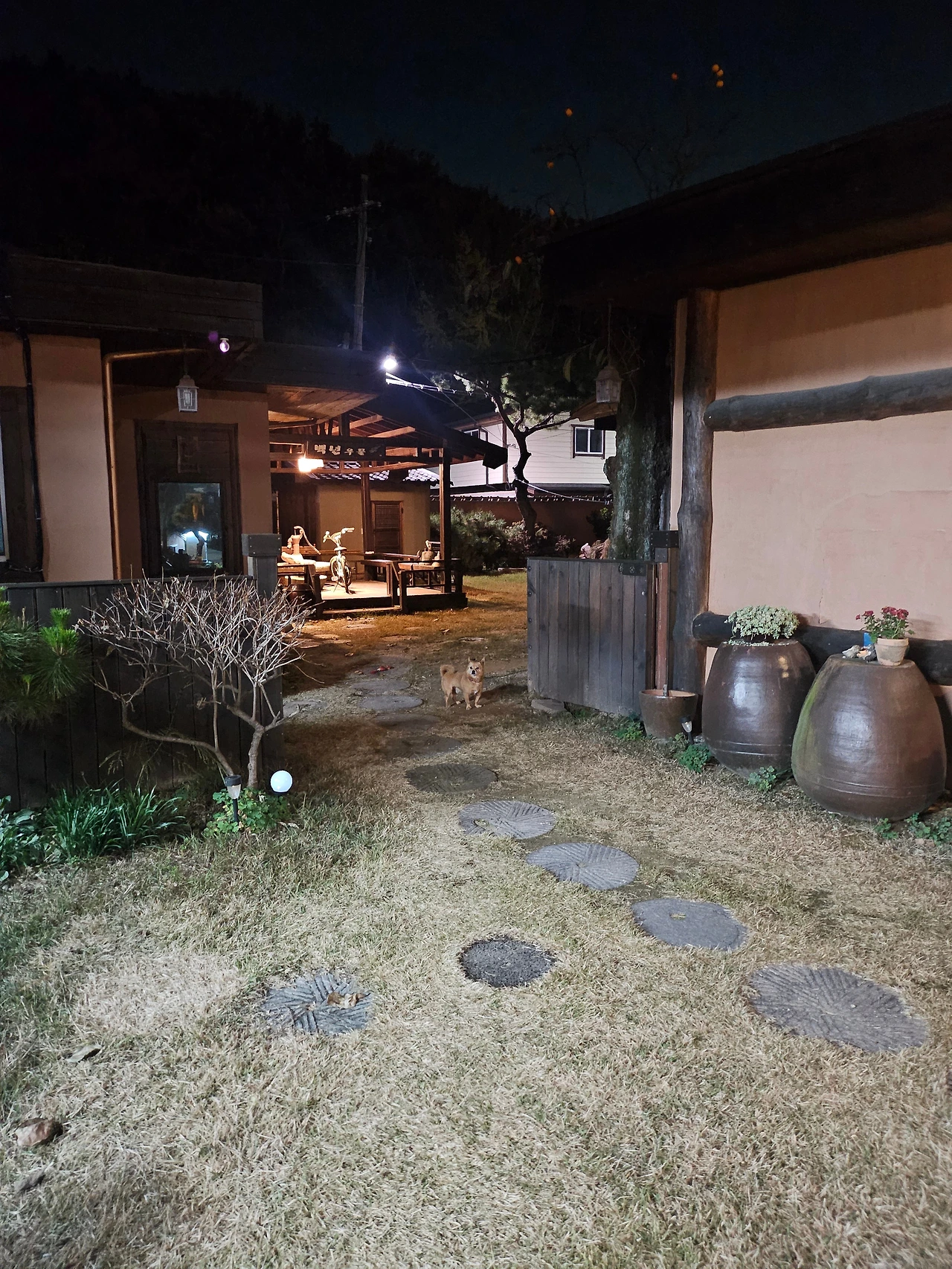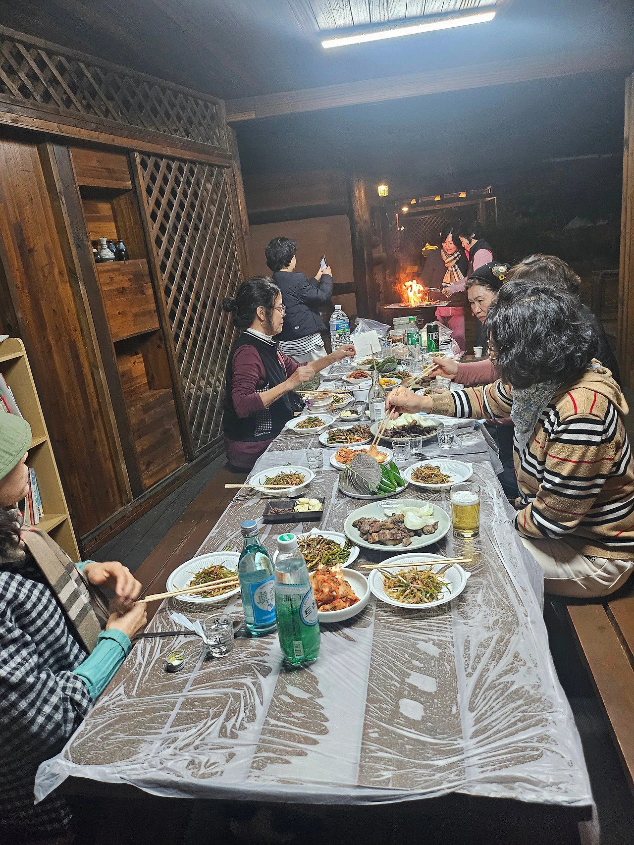 숙소 인근으로 이동하면서 적당한 커피숍에 들어가 담소를 나누며 취향에 맞게 차를 마셨다. 저녁엔 전통 한옥 가옥에서 짐을 풀었다. 이곳에는 전통 한옥들의 숙소가 여러 채 있었다. 꿀잠 숙소는 방 세 개에 거실, 침대가 네 개 있고 화장실도 두 개, 주방과 거실도 있는 제법 큰 한옥이다. 우리는 각자 집에서 준비해 온 반찬을 놓고 밥과 된장찌개도 끓여서 저녁만찬을 준비했다. 경주에서 사 온 삼겹살을 숯불에 구워 먹으며 친구 엘리사벳의 생일도 축하해 주면서 즐거운 시간을 보냈다. 불꽃 위로 익어가는 고기의 냄새가 아주 좋았다. 누군가는 굽고, 누군가는 챙기고 그 자체가 '가족 같은 공동체'의 풍경 같았다. 와우~~ 이건 정말 오랜만에 느껴보는 시간이어서 괜히 기분이 좋아졌다. 맥주를 마시다 소주가 괜찮을 것 같아서 마셨는데 먹을만했다. 우리는 연신 웃고 떠들며 시간을 보냈다. 사진도 찍고, 먹고 싶은 것도 먹고, 오랜만에 서로를 돌아보는 시간이었다. 어느 정도 시간이 지나 씻고 각자의 방으로 들어가 숙면을 취하였다.