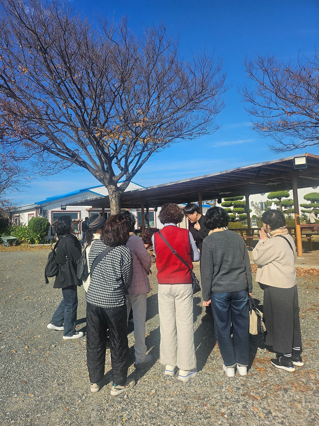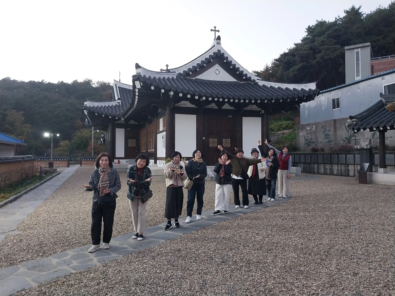 2025년 11월 15일~16일 찰랑 이들 10명이 경주 나들이를 다녀왔다. 이번 여행은 대구 대교구 진목정 성지, 순교지와 경주 나들이를 겸하여 정한 일정이었다. 우리가 함께 떠났던 1박 2일은 단순한 여행이 아니었다. 오랫동안 각자의 자리에서 버티고, 살아내고, 기도하며 견뎌온 우리 열 명의 성당 자매들이 잠시 세상과 거리를 두고 서로에게로 돌아가는 시간이었다. 우리는 11월 15일 아침 7시 20분 성당옆 공원 주차장에서 만나서 12인승 봉고차에 올랐다. 약간은 상기된 모습으로 모여서 일사불란하게 봉고차에 짐을 싣고 우리도 차에 올라 출발했다. 여행이라고 눈치도 없이 소형 캐리어를 갖고 온 두 사람은 맨 뒤에 앉아서 갔다. 가다가 김밥과 커피를 찾고 기도를 바친 후 간편하게 아침식사를 했다. 모처럼 김밥을 먹으니 소풍을 가는 느낌도 들었다. 찰랑 팀은 열명이 모임을 하는데 이번에도 모두 참석이다. 그러나 사정이야기를 들어보면 못 갈 사람도 있어 보인다. 오늘 친정어머니 기일이지만 미사로 봉헌한 친구 아녜스, 혼인한 딸이 신혼여행에서 돌아올 날이지만 다음 주에 오라고 했다는 요안나~ 각자 나름 나름의 이유가 있었지만 우리는 경주 진목정 성지를 향하고 있었다. 경주로 떠나는 이유는 진목정 성지, 칠곡 신나무골 성지순례도 겸하는 나들이기 때문이다. 천주교에서 올 해 희년을 맞아 '희망의 순례자들 해'로 지정하였다. 청주교구에서도 2025년 '최양업토마스 사제의 시복시성'을 염원하며, 사목 하셨던 30군데를 정하여 신자들에게 대림시기가 시작되는 11월 말까지 방문하도록 했다. 가는 곳마다 스탬프를 찍고 완료한 신자들에게 순례 증서를 주고 있다. 부지런히 다녀서 이미 순레를 마친 신자들도 있고 아직 순교지 순례를 하고 있는 분들과 못한 사람들도 있다.