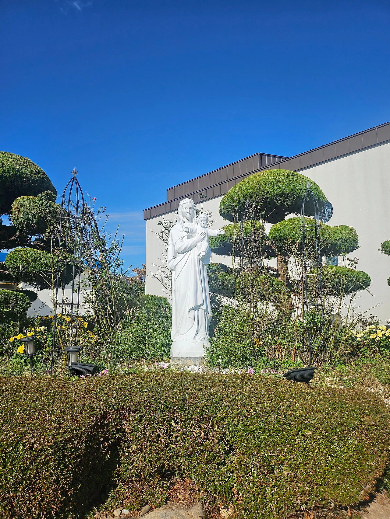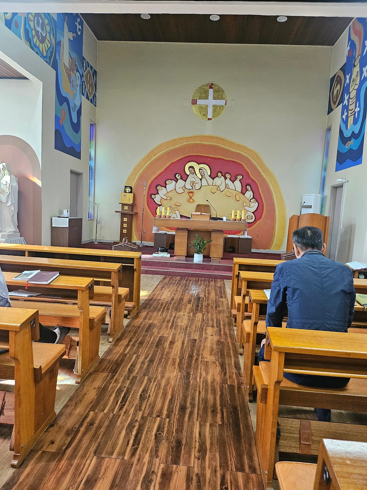 아침을 먹고 달려간 곳은 해변가 언덕에 하얗게 지은 작은 '양남 성당'이다. 언덕 위에 하얀 집처럼 깨끗하고 순수한 공간이었다. 미사전후로 성모회에서 미역과 다시마, 젓갈, 말린 감 등도 팔고 있어서 필요한 분들은 구입했다. 신자들이 많지는 않았지만 무척 친절했다. 미사중에 신부님께서는 여러 말씀을 해 주셨다. 부임하신 지 몇 개월 안 됐다고 하는데 신자들의 고충과 마음을 잘 알고 계신 듯했다. 성당은 작았지만 내부는 우리 본당과 비슷했다. 좁아서 그랬는지 모르지만 무릎을 꿇는 예식을 할 때 장궤틀이 많이 불편했다. 이것을 얘기해 주고 싶었으나 하지 못했다. 주임신부님은 신자들과 피정온 멋쟁이 신부님도 소개해 주며, 미사 끝에 인사를 나눌 수 있게 해 주셨다. 미사 후에 주임 신부님은 성당이 잘 나올 수 있는 곳에 자리를 잡도록 배려해 주셨으며 우리와 함께 사진도 찍어 주셨다.