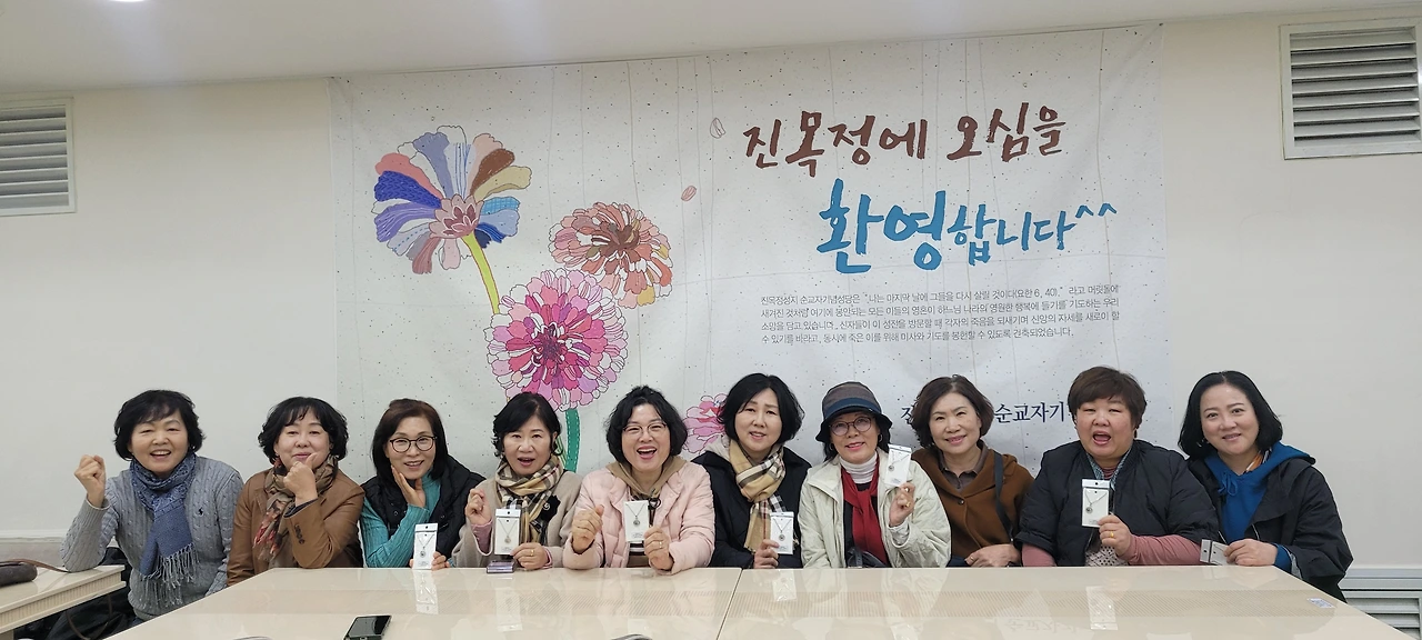 우리는 차 안에서 연신 '호호하하' 웃으며 이야기도 나누고 휴게소에 들러서 볼일도 보면서 성지에 도착하였다. 날씨도 좋았고 춥지도 않아서 다행이다. 잠깐 성지를 둘러보니 나무나 성물들이 다소곳하게 자리를 잡고 있어 보기 좋았다. 거의 미사시간이 다 되어 안으로 들어가 보니 넓게 퍼져 있는 성당에는 대략 250여 명이 미사를 볼 수 있는 장소이다. 우리는 제대를 중심으로 우측에 나란히 두줄로 앉았다. 미사가 시작 되고 신부님께서 경건하게 집전하셨다. 진목정 신부님께서는 두 군데 성당에서 오신 분들에게 박수를 치게 하셨고 여기저기서 오신 분들에게도 환영의 박수를 보내 주셨다. 신부님께서는 부임하신 지 얼마 안 되셔서 그런지 책을 읽듯이 또박또막한 목소리로 미사를 집전하였다. 교회가 가난한 사람들을 살리는 게 아니라 가난한 사람들이 교회를 살리는 거라고 말씀하셨다. 그러면서 우리 모두 연대하여 교회를 잘 이끌어 갈 수 있도록 신자들에게 당부하셨다. 세속적인 것에 마음을 두지 말고 오로지 하느님께 마음을 향하도록 하자는 말씀도 덧붙이셨다. 미사 후에 옆쪽으로 하늘 정원( 봉안당 )이 있는 곳에 가보니 선종하신 분들의 무덤 같은 곳이었다. 그래서 더 거룩하게 느껴졌다. 옆으로 내려와 휴게실에 들려서 단체 사진을 찍고 커피를 마셨다. 진목정 성지는 허, 륜, 이, 세 사람의 순교자를 대표하는 목걸이를 살 수 있어 좋았다. 진목정 성지의 특색을 살려 상품을 개발하고 순례하는 분들이 구입을 해서 성지 발전에도 도움이 되니 일석이조이다. 그래서 우리는 같은 것으로 열개를 구입하고 신부님 축성도 받았다.