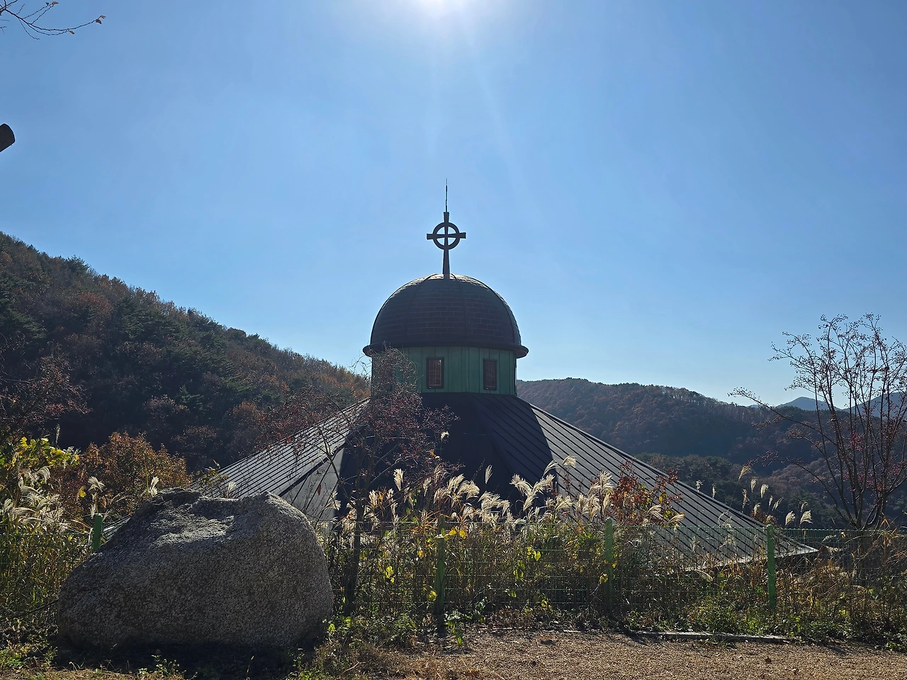 성당 뒤편에는 이곳을 찾는 분들이 피정할 수 있는 알베르게가 있다. 순례자들이 묵으며 기도하거나 묵상할 수 있는 공간으로 사용된다고 한다. 옆쪽으로 범굴 모형(호랑이굴)이 있는데 병인박해 때 허인백 야고보, 김종륜 루카. 이양 등 베드로 등 세복자가 숨어 살았던 곳이다. 이 굴은 과거에 약 30센티 정도로 10여 명이 숨어 지낼 수 있는 공간이었다. 지금은 보존 및 정비가 이루어져 기존의 것들을 살려 계단으로 오르내리게 되어 있었다. 진목정 성지는 경주 지역에서 한국 천주교 신앙의 전파와 박해의 역사가 깃든 중요한 곳이다. 조용한 산골 분위기의 작은 성지이지만, 초대 신앙인들의 발자취를 기억하는 의미 깊은 곳이기도 하다. 진목정은 이름 그대로 '참나무 정자'가 있던 곳이다. 이곳은 조선 후기, 천주교가 공식적으로 신앙이 금지되던 시기에 비밀리에 신앙생활 하던 신자들이 살았던 곳이다. 경주지역은 박해가 심하진 않았지만, 몰래 모여 기도하던 소공동체 같은 곳이었고 무명 신자들의 숨은 신앙의 터전이었기에 성지로 지정이 되었다. 직접 와보니 자연 속에서 차분한 기도와 묵상을 하기 좋은 곳 같았다. 범굴 쪽에서 바라보는 성당의 돔 모양이 보기 좋아서 단체 사진을 남겼다. 이곳에 와서 같이 미사를 드리고 '우리가 함께 있다는 것' 자체가 은총처럼 느껴졌다. 말없이 눈을 마주쳐도 마음이 전해지는 그런 순간들이었다. 서둘러 내려와 인근에 있는 식당으로 갔다. 얼마 전에 딸을 출가시킨 요안나가 점심을 낸다고 예약을 했다.